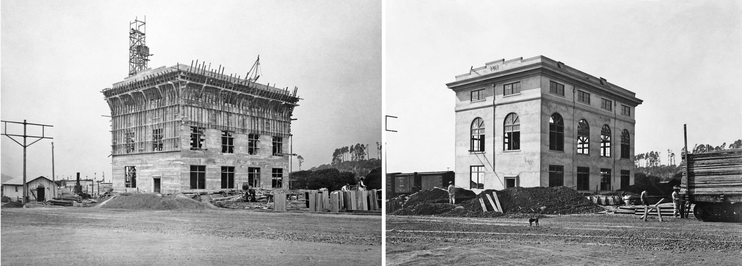 Before electric operation could commence to Thousand Oaks, a power substation had to be built on Solano Ave., to be located between Fresno and Colusa Aves. On the left, a northwest view of the partially completed exterior of the substation taken on June 30, 1911. On the right, the exterior is now complete, the date Sept. 12, 1911. Note the street is not yet paved in either image.
