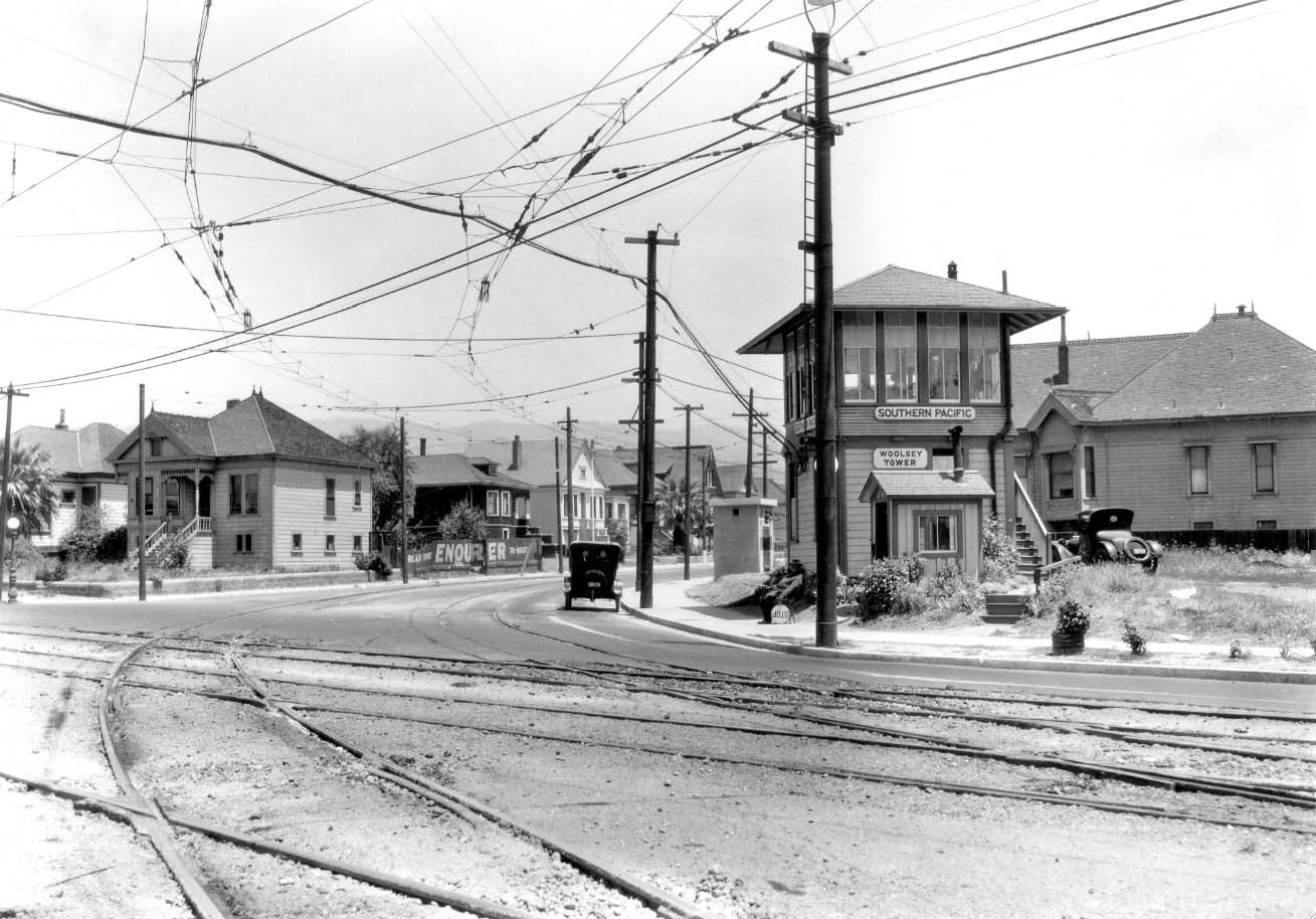 Finally, the SP Ellsworth St. might be considered as part of the challenge to the Key’s operation into Berkeley. No images of the construction of the Ellsworth St. could be found, but this northeast view from 1920 shows the tracks of the new line after they have come off the SP Shattuck line and are seen crossing the Key Route tracks to Woolsey St. and the tower in place to monitor that crossing.