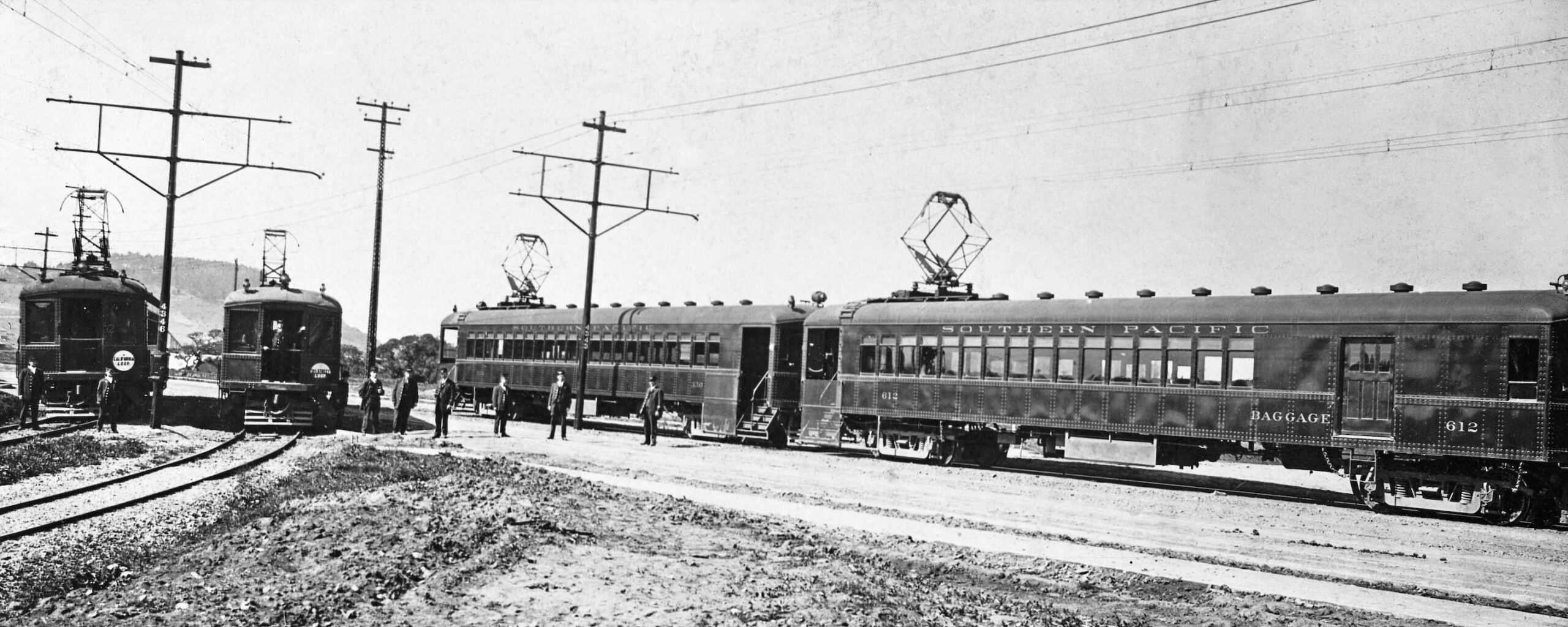 Early in 1912, this rare northwest view shows the three lines at Thousand Oaks. The California line, left, and Ninth St. line, center, both have “loop” indicated on their destination discs, but they did not travel in loops. Rather, each line physically formed a loop with the other, but the train routes ended here. In the next update, the struggle between the SP and Key for North Berkeley in the first decade of competitive operation will be examined.
