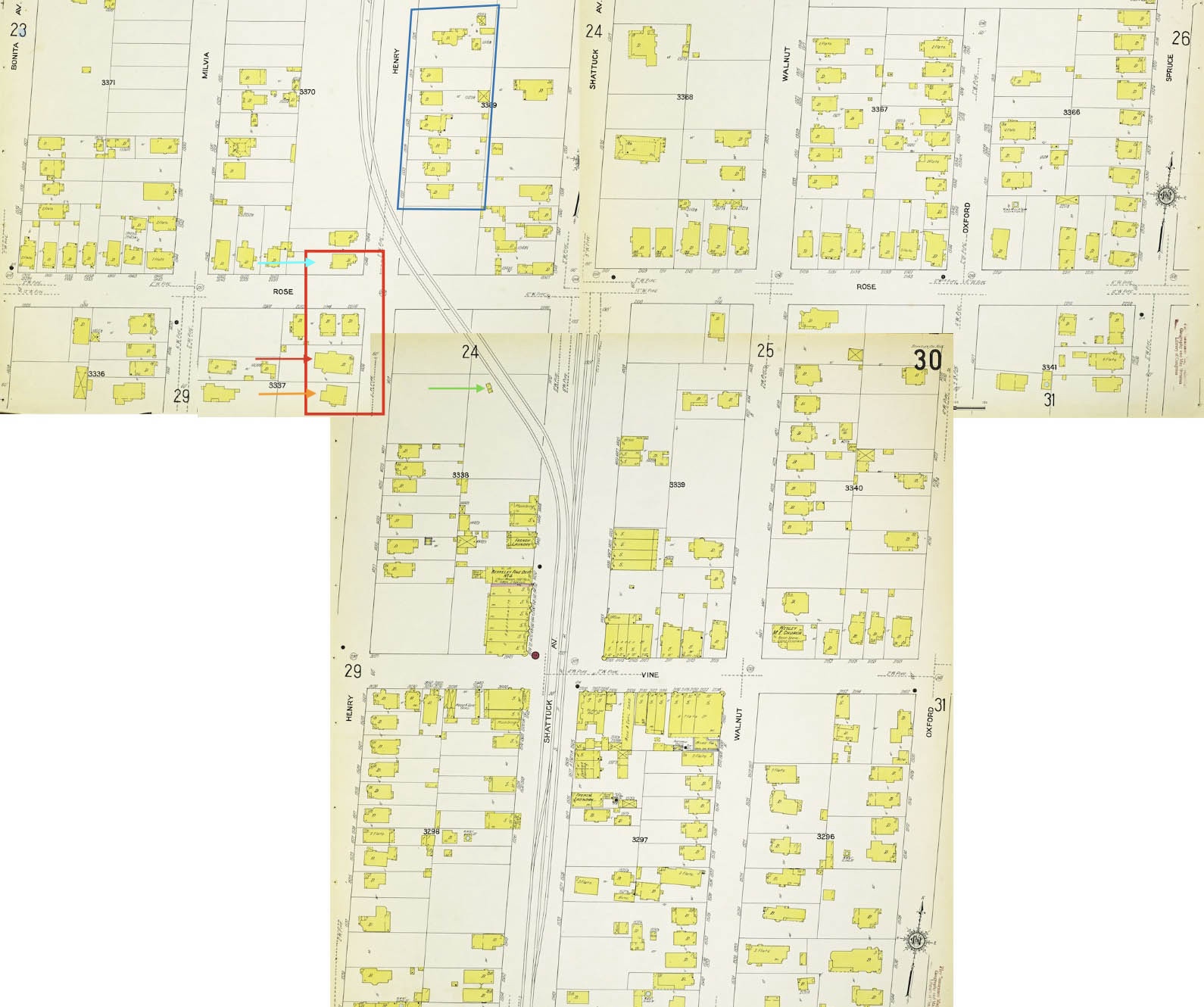 This combination of several Sanborn maps from 1911 shows the shed from the previous image, green arrow, the houses along Henry St. also seen in the previous image, red box, with the red arrow pointing at 1404 Henry St. In the 1894 Sanborn map shown previously, it was no. 1204, and the house to the south no. 1206. The turquoise arrow points to a house in the 1894 Sanborn map that did not yet have the no. 1348 address it had by 1911. The houses boxed in blue are nos. 1337-1315 Henry St, south to north. Proceed to the next panel.