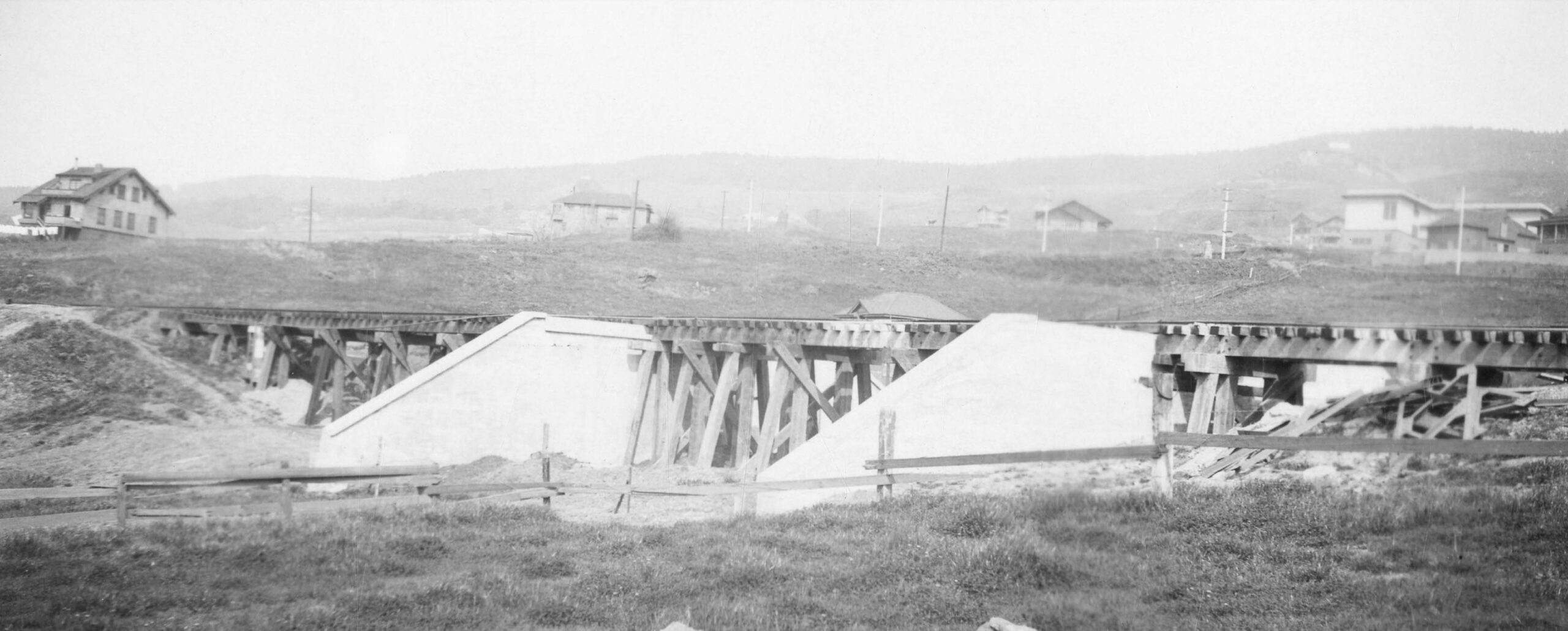 Later in 1910 in this northeast view, the concrete supports for the northern takeoff of the trestle are now in place to support a bridge over Eunice St. Information about the houses seen in this image will require more research.
