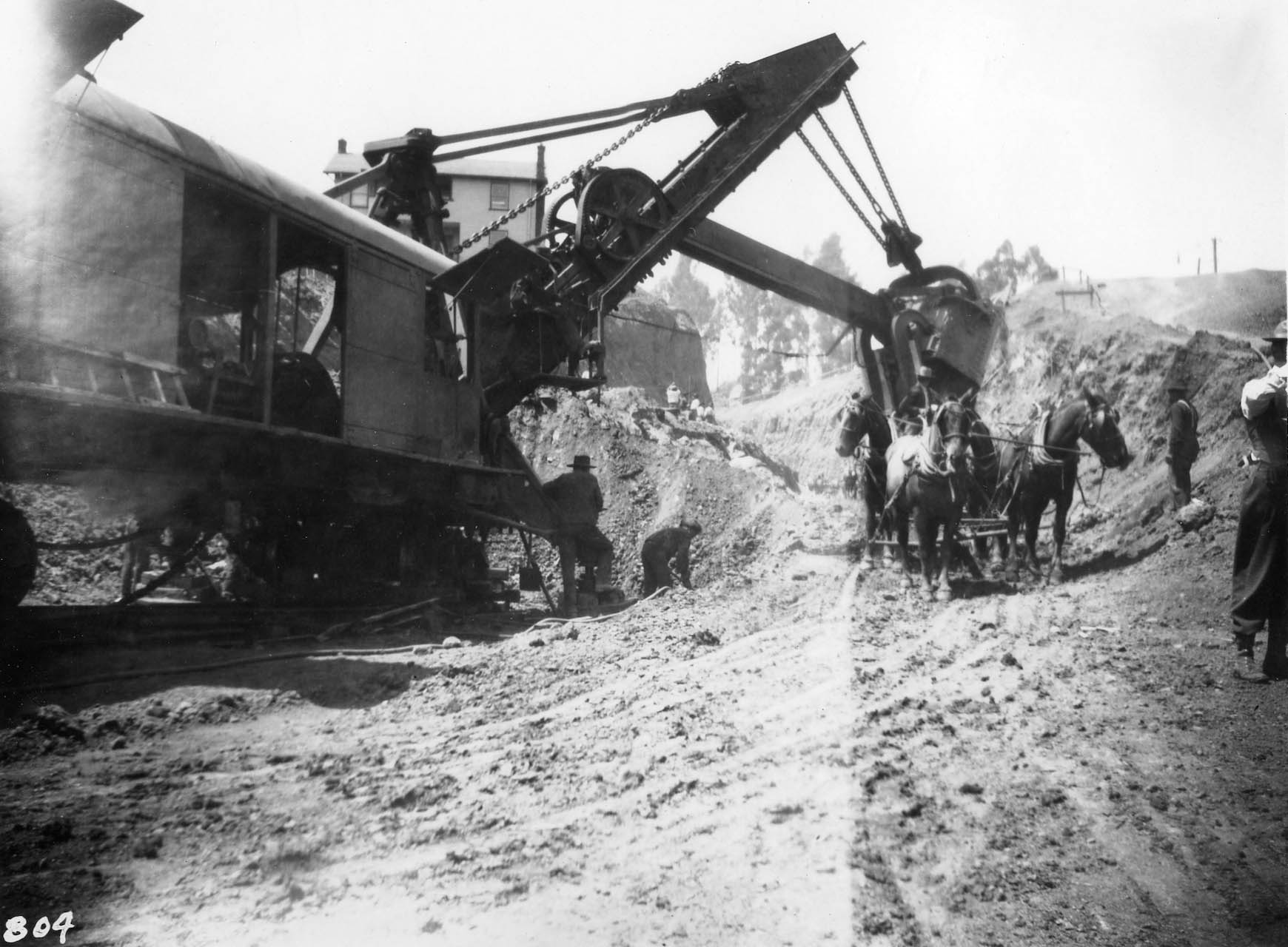 The first order of business was to dig and create a path for the tracks. The steam shovel that appears to be on a piece of train track loads a cart pulled by oxen at the Sutter St. end of construction, north view in 1910.