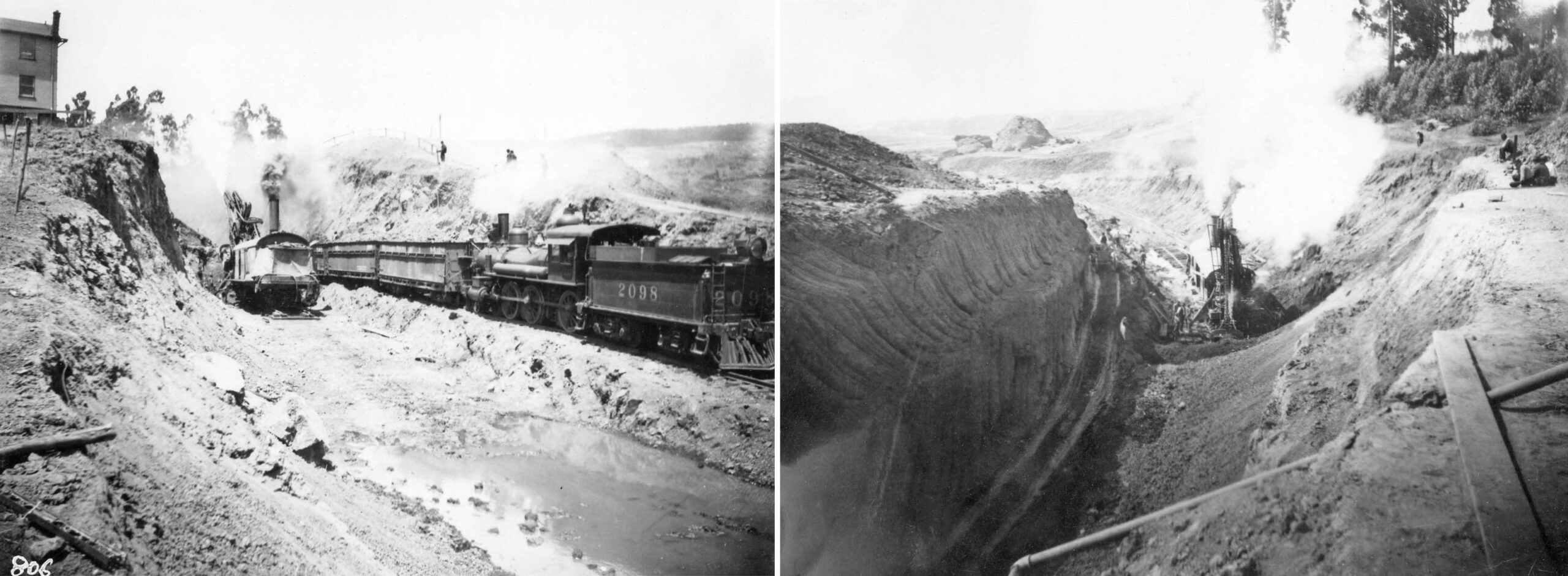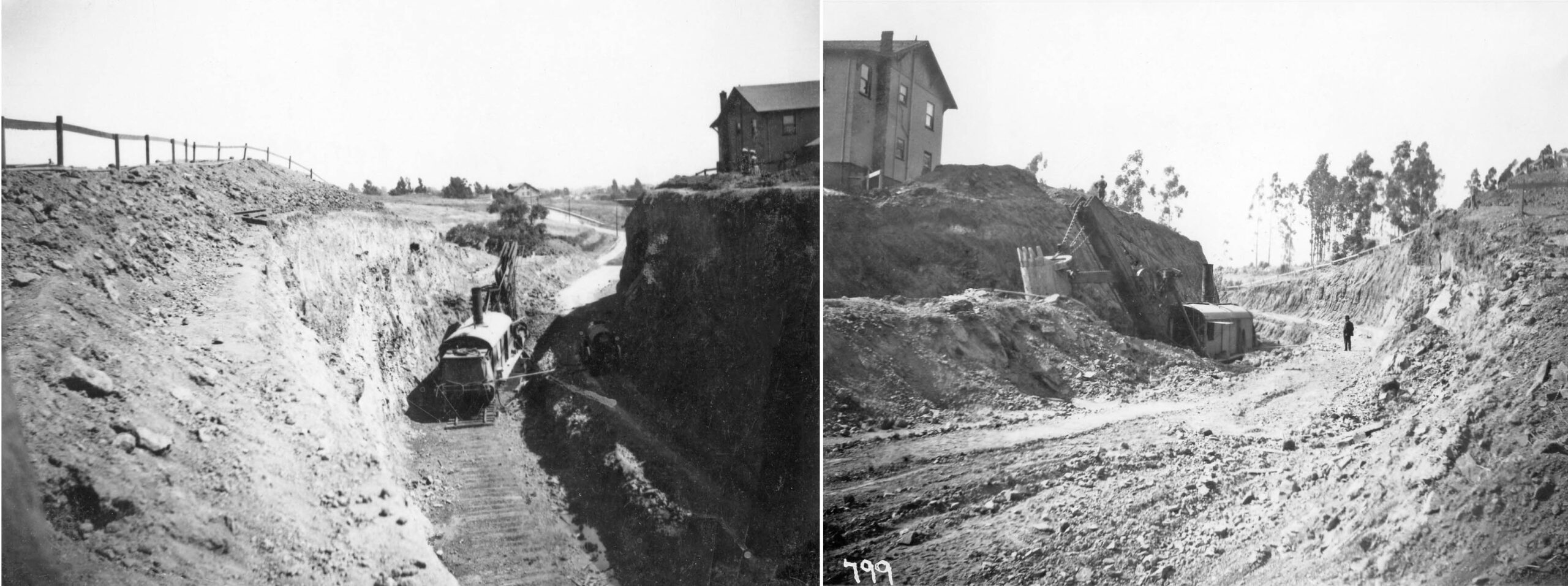 The north view from the Sutter St. side, left, shows the path from the previous panel now occupied by steam engine 2098 with greater capacity to assist moving out the dirt created by the steam shovel later on June 17, 1910. The northwest view on the right shows the stream shovel at work on the Solano Ave. side in 1910.
