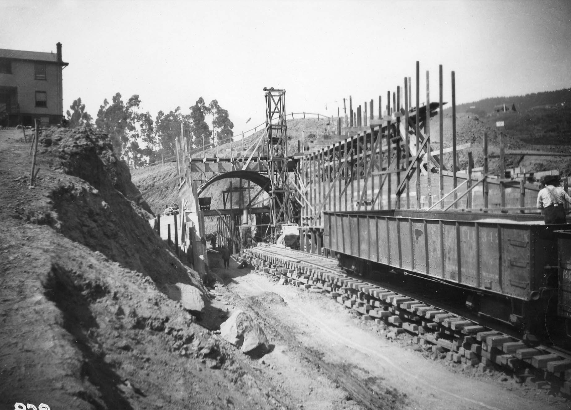 Next, the framing of the southern-most portion of the tunnel on the Sutter St. side is seen in this north view from Aug. 6, 1910. The gondola on the right appears to contain a granular material, possibly to prepare the concrete for the tunnel walls.