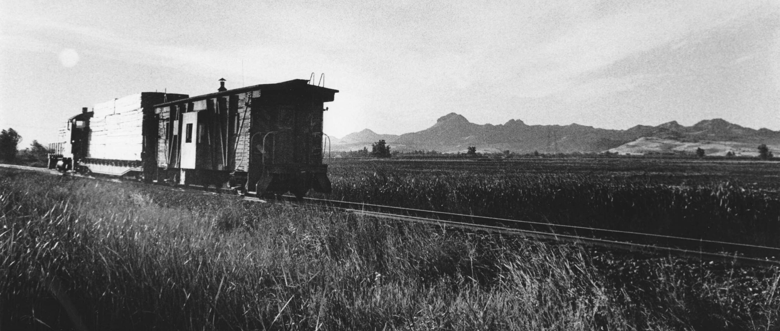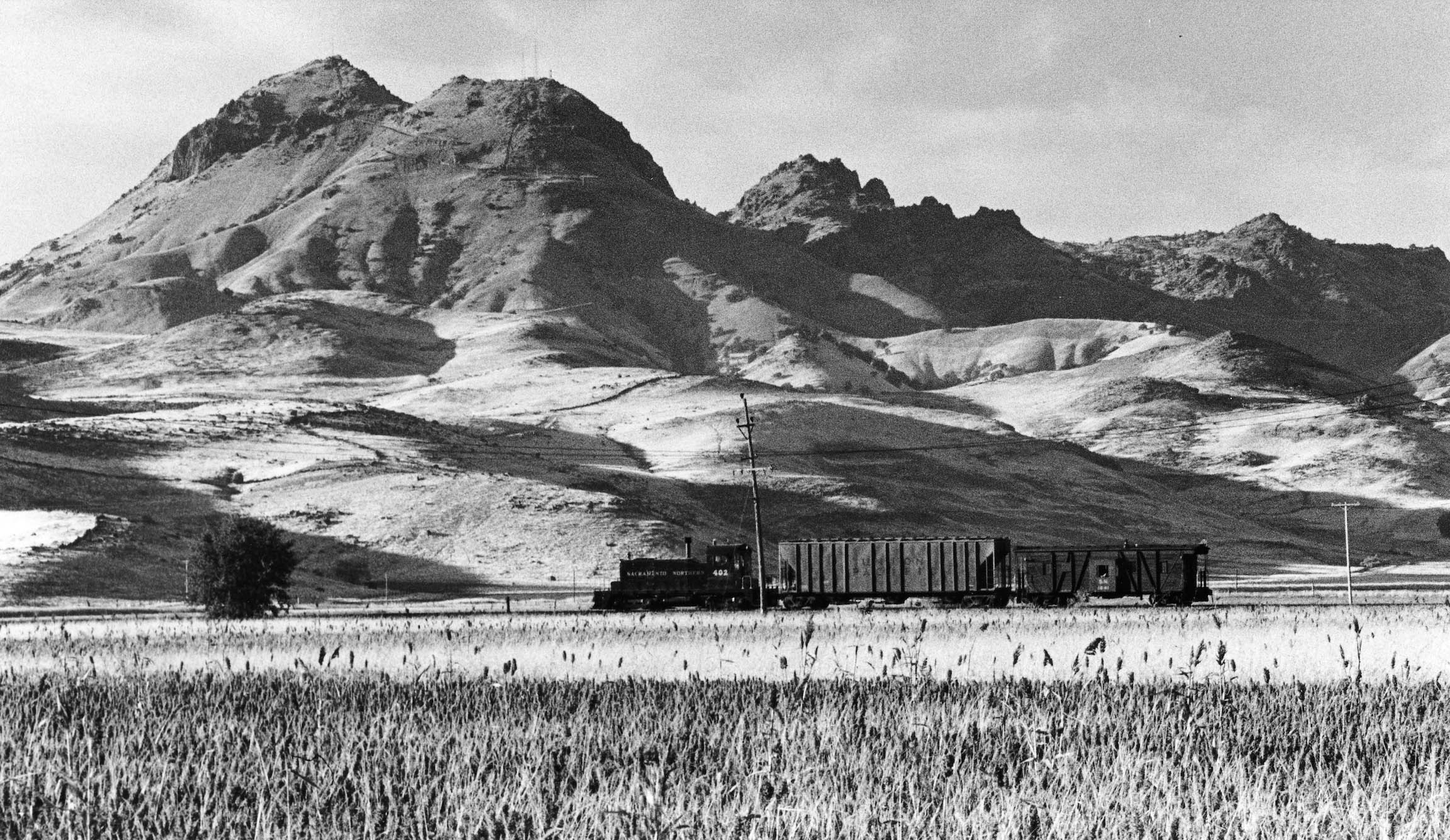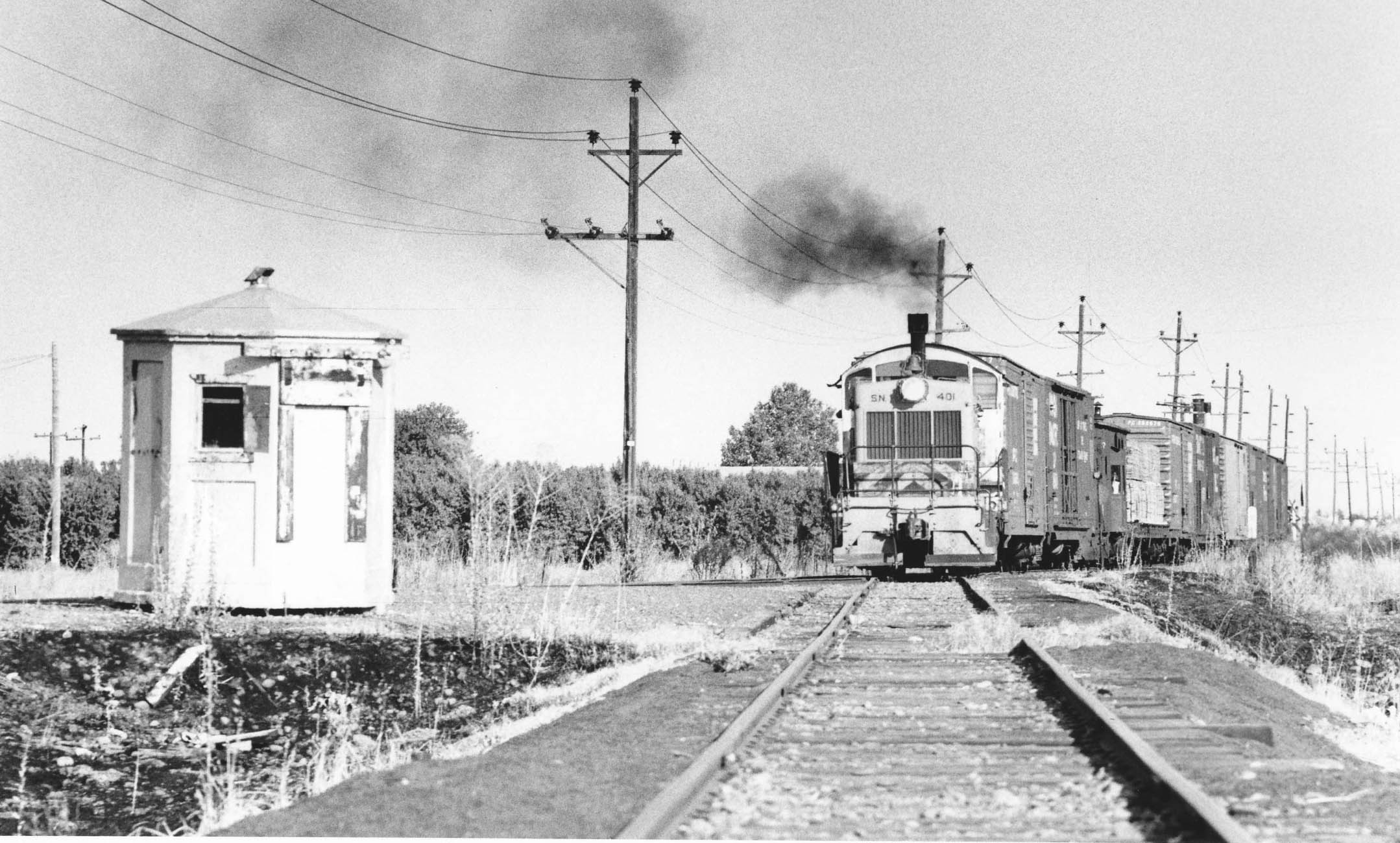 • The date is Oct. 10th, 1973. Dick Dorn, an elementary school teacher in Yuba City, was in the process of cultivating his interests in photography and railroad history. Dick got the idea to capture scenes of small freights of the Sacramento Northern Railway, SN, heading toward Tarke on the SN Colusa Branch drawing the neighboring Sutter Buttes into the image using a telephoto lens. Here diesel SN 402, a Union Pacific hopper, and caboose SN 1641 are seen in a north view between Sutter and the Butte Slough-Sutter Bypass crossing.
