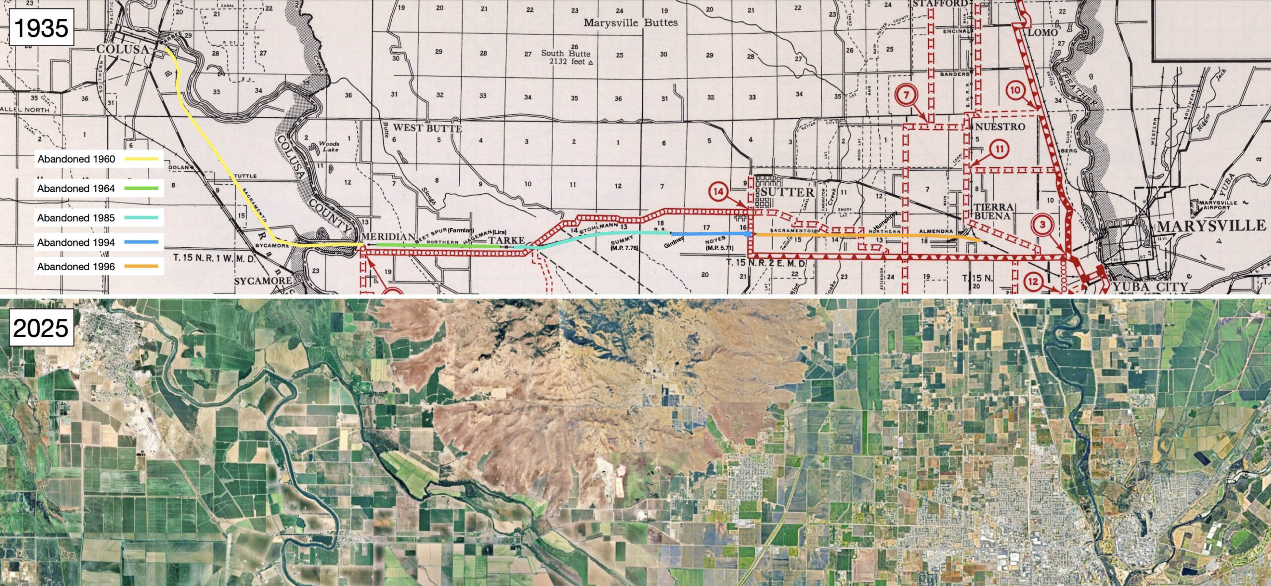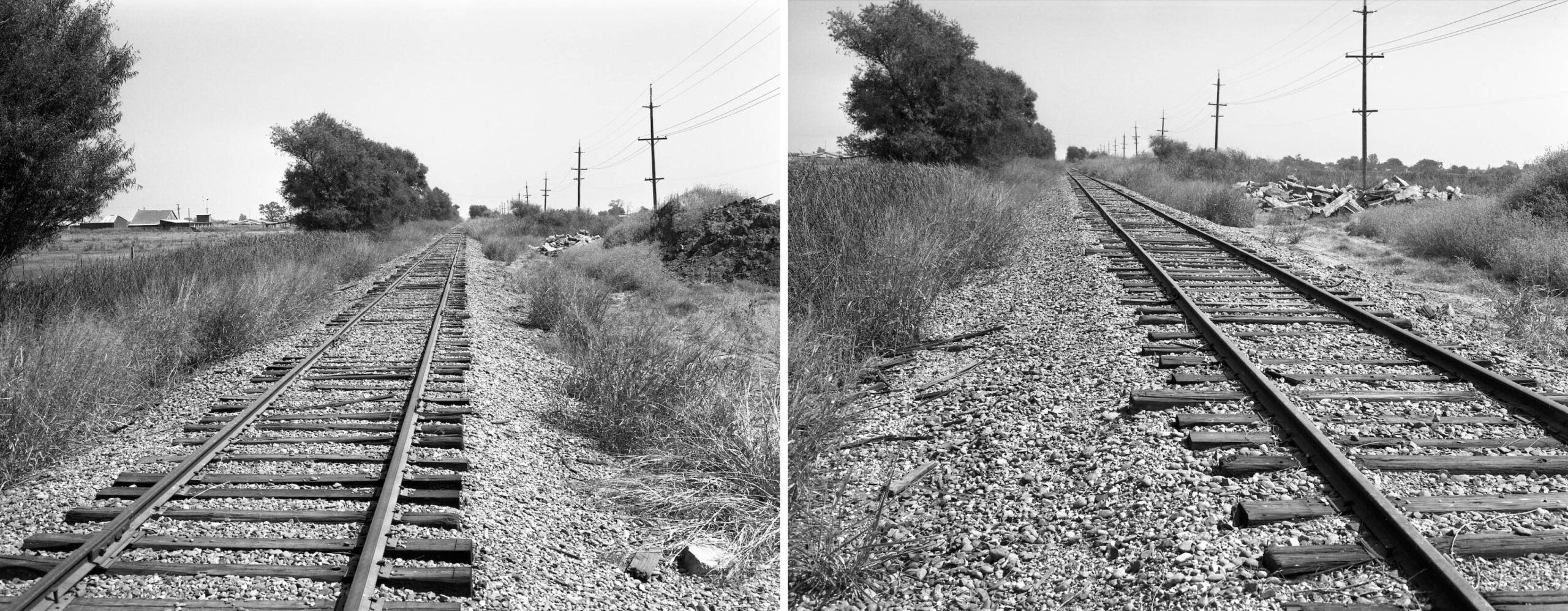 • Another set of comparative west views from what is in 2026 S. Tarke Rd. are shown here. More from Jeff Asay, p. 463, the WP filed to abandon the section west of Sutter in January 1973, but protests from Tarke Bean and others kept the line open.