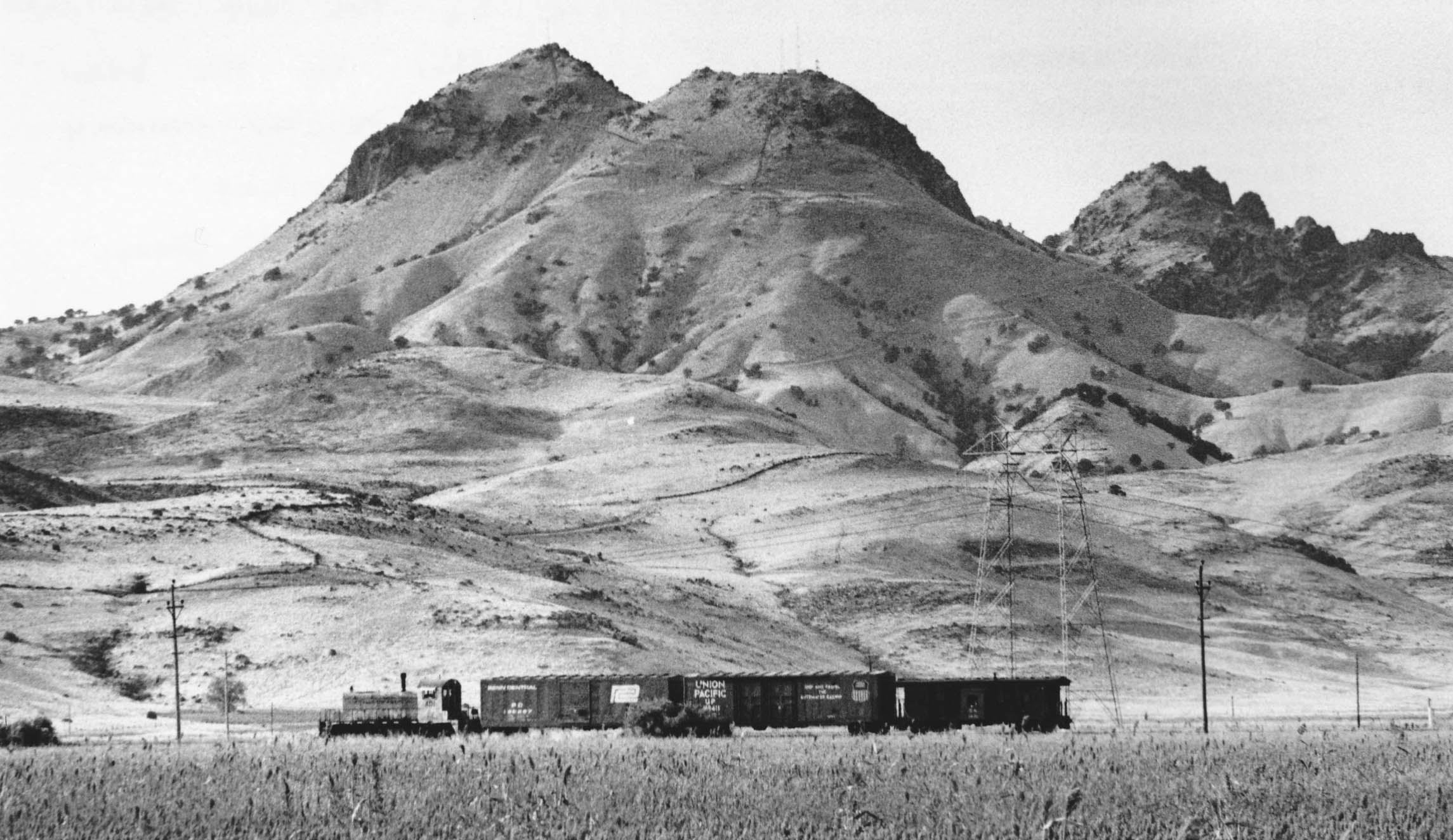• After depositing the tail end of the freight, the remainder headed for Tarke. Dick waited with his telephoto lens on Highway 20 between Wyncoop Rd. and Southridge Blvd. to document the scene, north view, Sept. 2, 1973. In addition to the position of the summit of South Butte, the position of the electrical transmission tower in the picture is a clue as to the location of the passing train.
