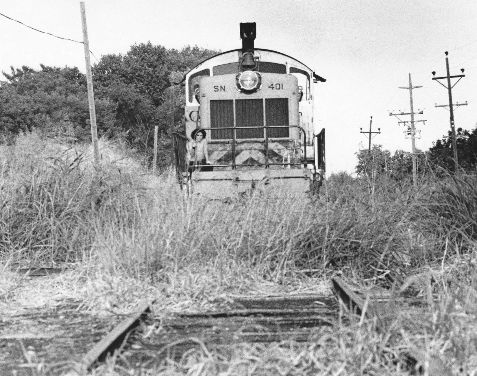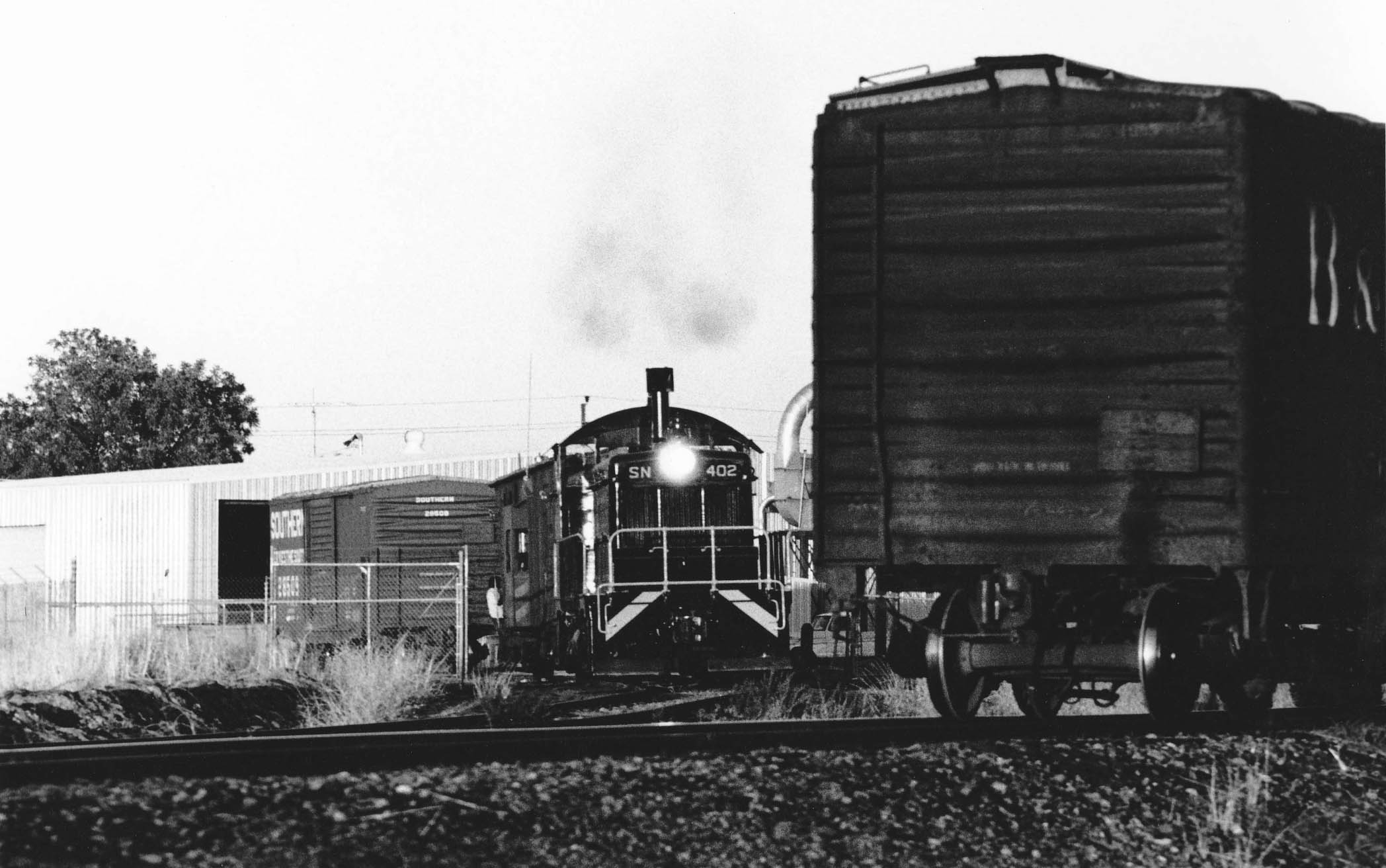 • Next a photo of SN 401 with boxcar and caboose on the Stohlmans Trestle on Sept. 25, 1973, north view. Dick noted “that the SN was very aware of the limitations on it. Only the 401 and 402 were allowed to take trains over it. Plus, they used the smallest capacity covered hoppers for bulk loading. I remember discussions about this when they were running out there in 73. The Stohlman’s were one of the original families settling in the area, their house was located at the east end of the trestle. There is a small cemetery next to the house bearing their name.”