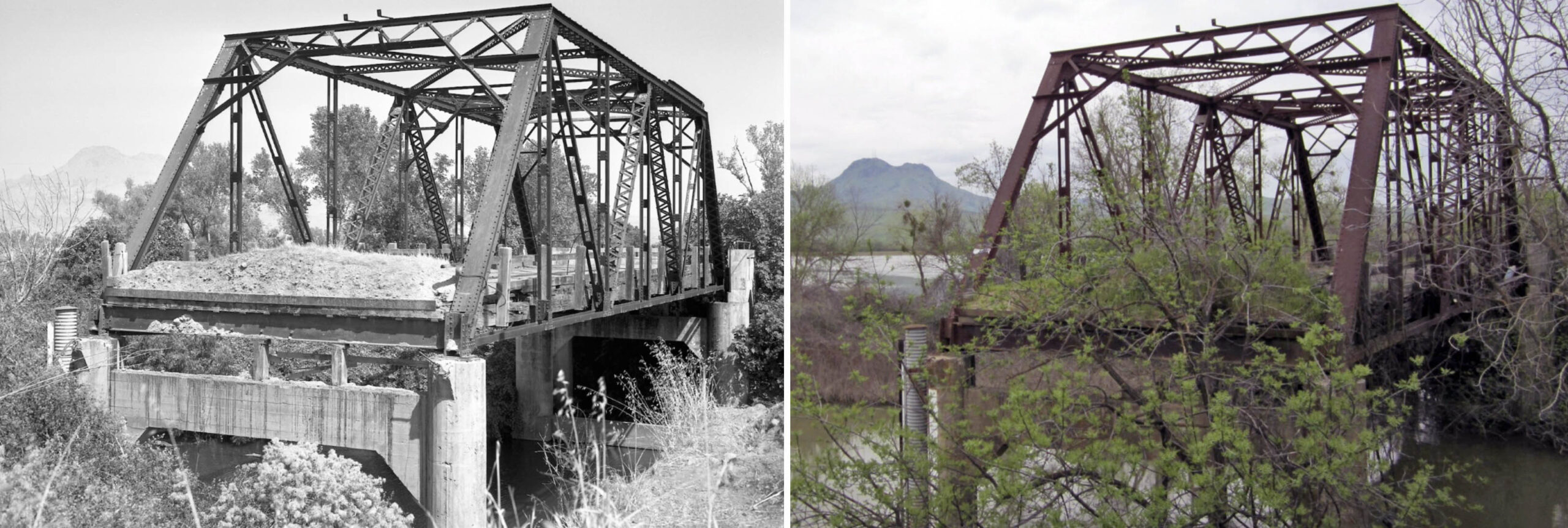 • Finally, the point where the trestle and bridge came together is shown in a west view, left, and the completed structure sometime ca. 1913, right.