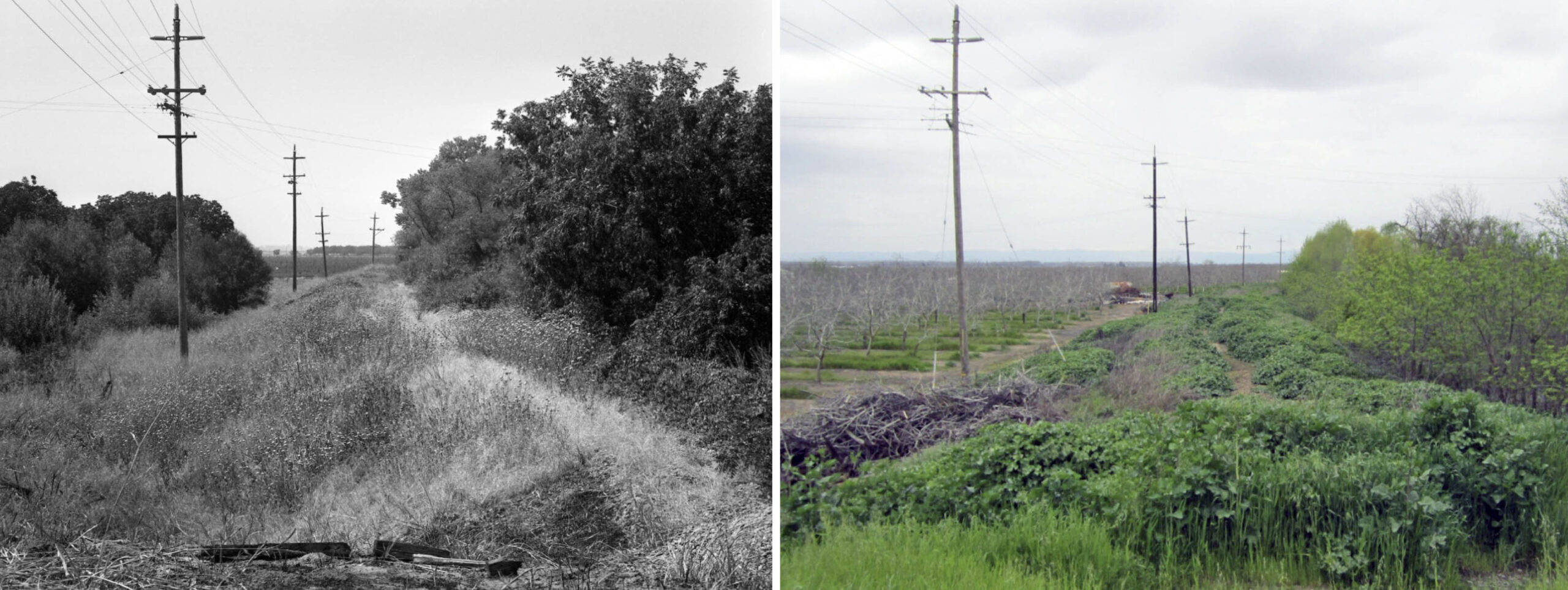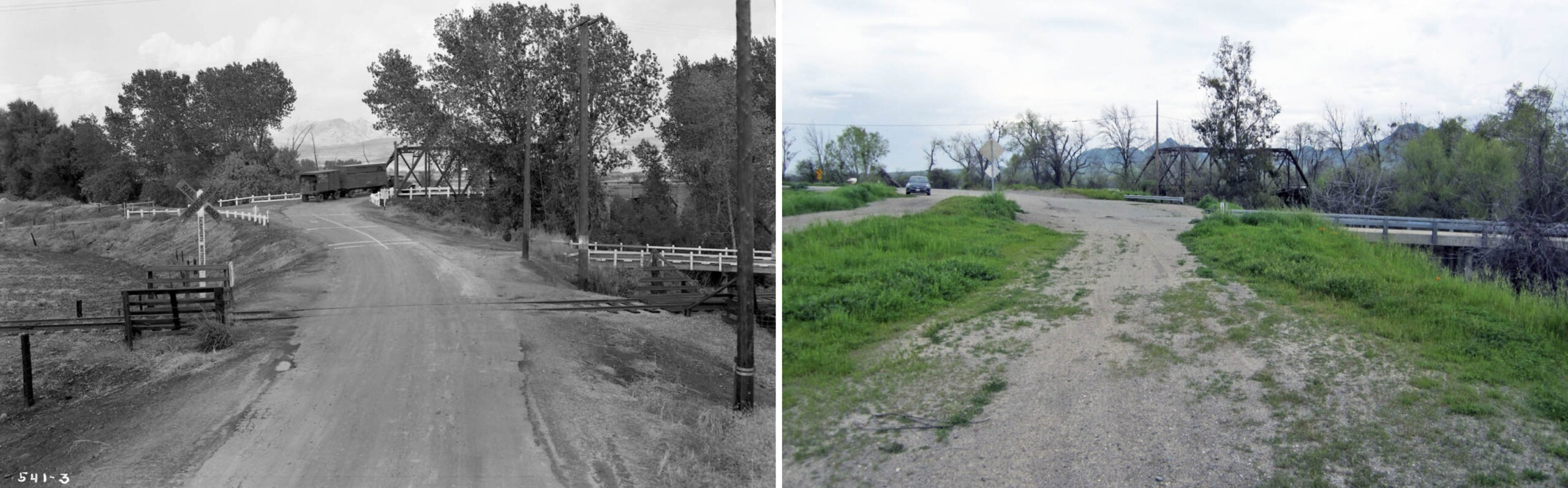 • Moving ahead to 1938, prior to the extension of State Highway 20 over the slough, vehicles heading from Tarke to Sutter had to cross over the SN right-of-way on the west side of the slough via what in 2026 is S. Tarke Rd. to access the Long Bridge as seen in this north view from Sept. 29, 1938, left. The scene looks similar in 2017, right view, as the road is still passable, but the track is gone and access to the Long Bridge is not an option. S. Tarke Rd. now heads south to Highway 20.
