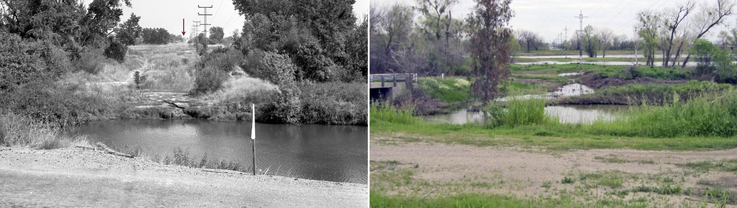 • Another set of comparative east views taken from what is in 2026 S. Tarke Rd. at the western end of the trestle are shown here, the red arrow the site of the eastern concrete abutment, present in 1988, one year after the removal of the overpass. Dick Dorn had already mentioned the timber portion of the slough crossing did not pass the FRA inspection, and Harry Demoro notes in “Sacramento Northern”, Signature Press, 1991, that the bridge was condemned soon after.