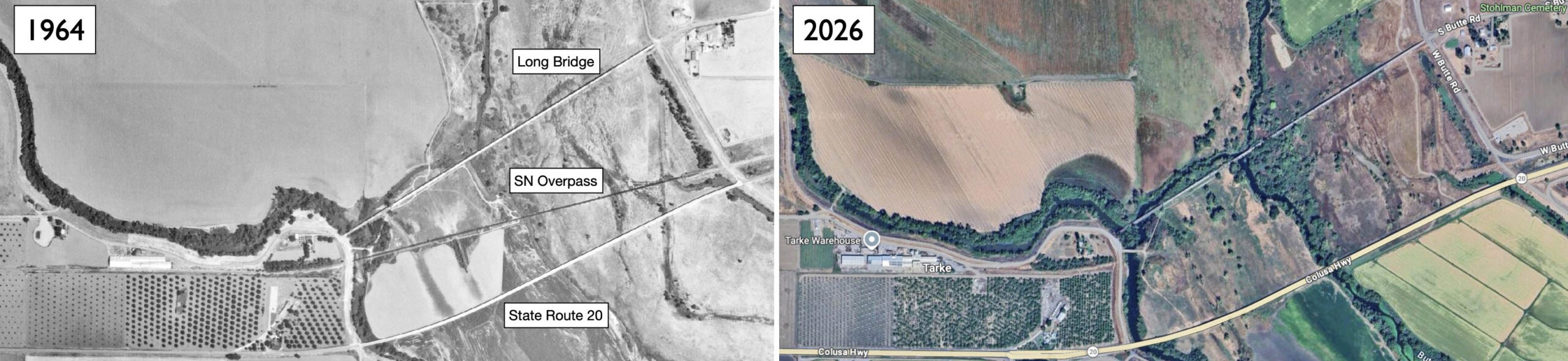 • The complication with the branch line by the 1970s was the SN overpass of the Butte Slough-Sutter Bypass, henceforth to be referred to as the slough overpass. The vehicular crossing to the north, the Long Bridge was supplanted by the construction of State Highway 20 from just west of Sutter to the south of the slough overpass in 1938. Almost all of the abandoned and shuttered Long Bridge survives in 2026.