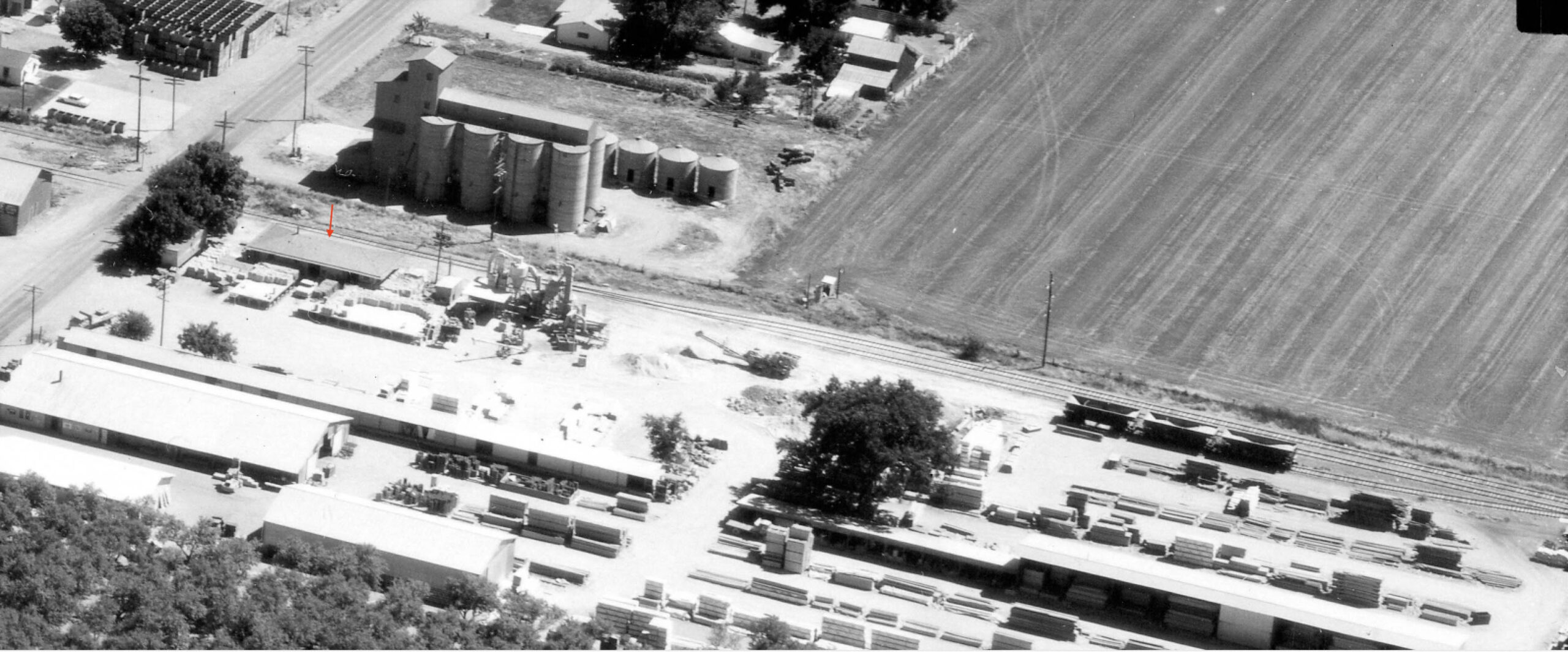 • A detail of the portion west of Acacia Ave. from the 1967 aerial shows at least the Close F.R. Lumber Co. The red arrow marks the SN Sutter depot engulfed with lumber as it had been from at least 1940.