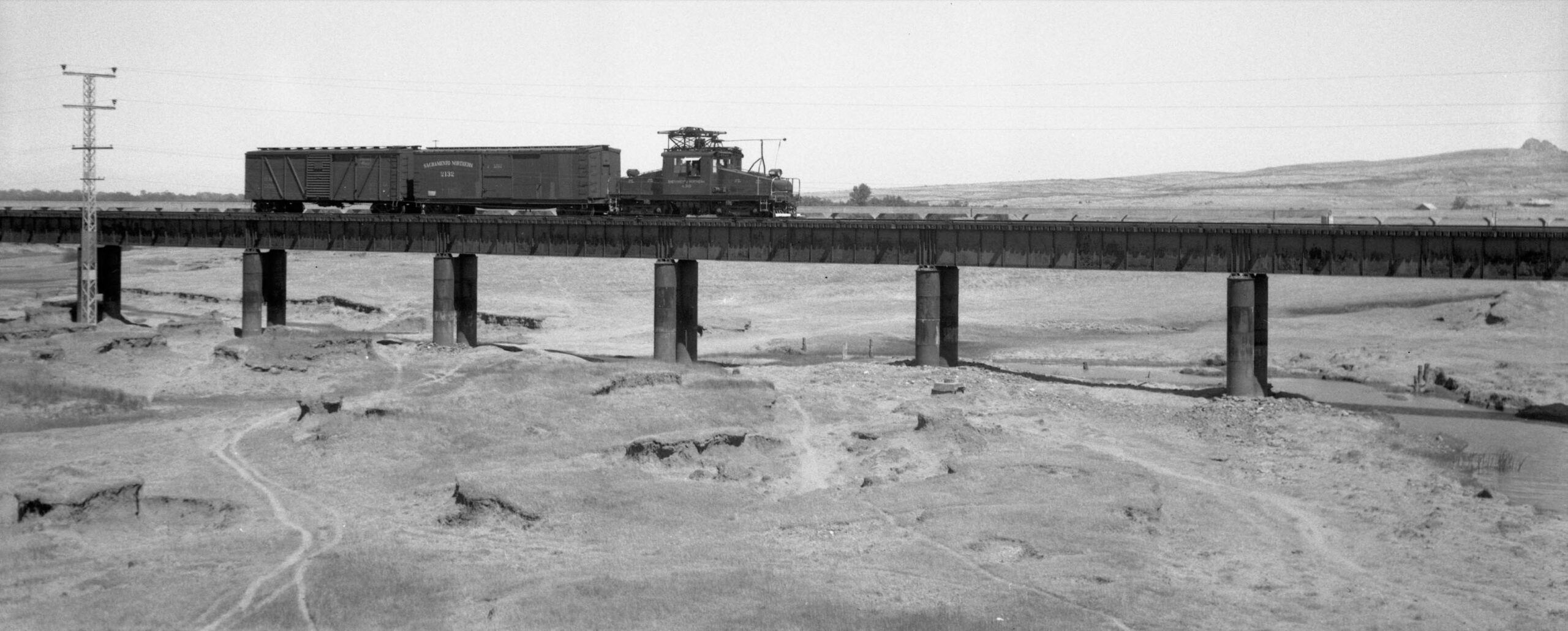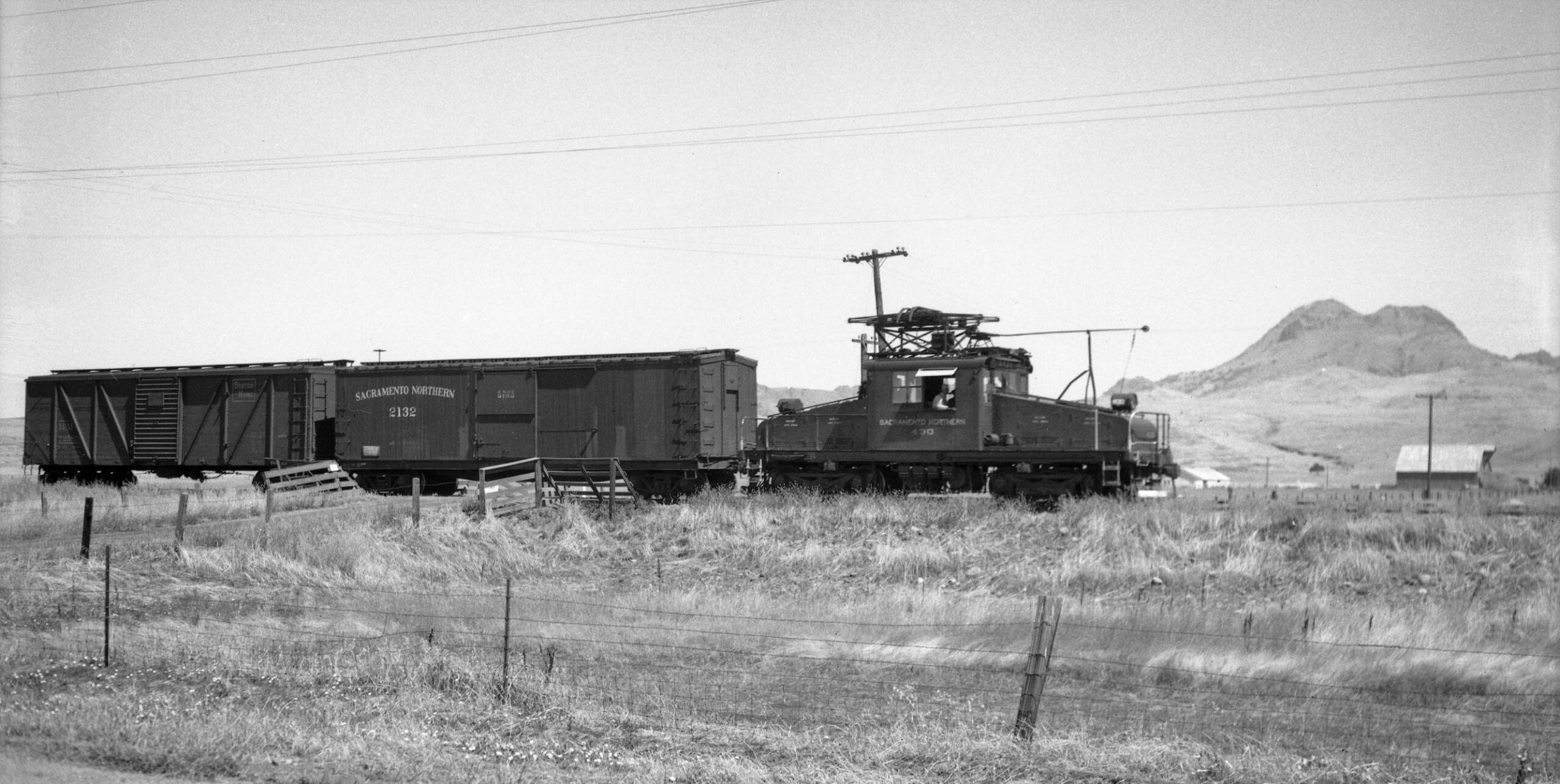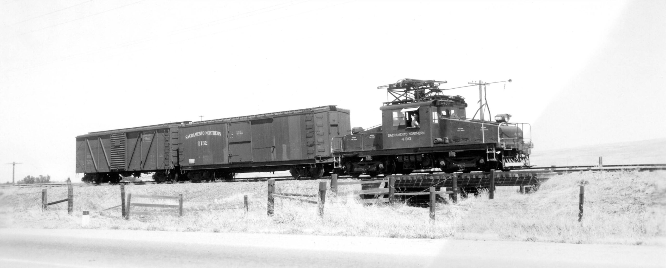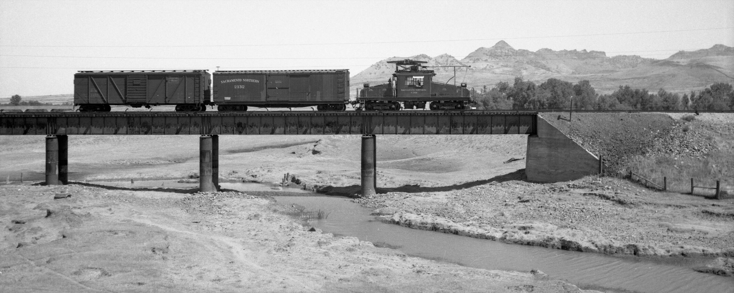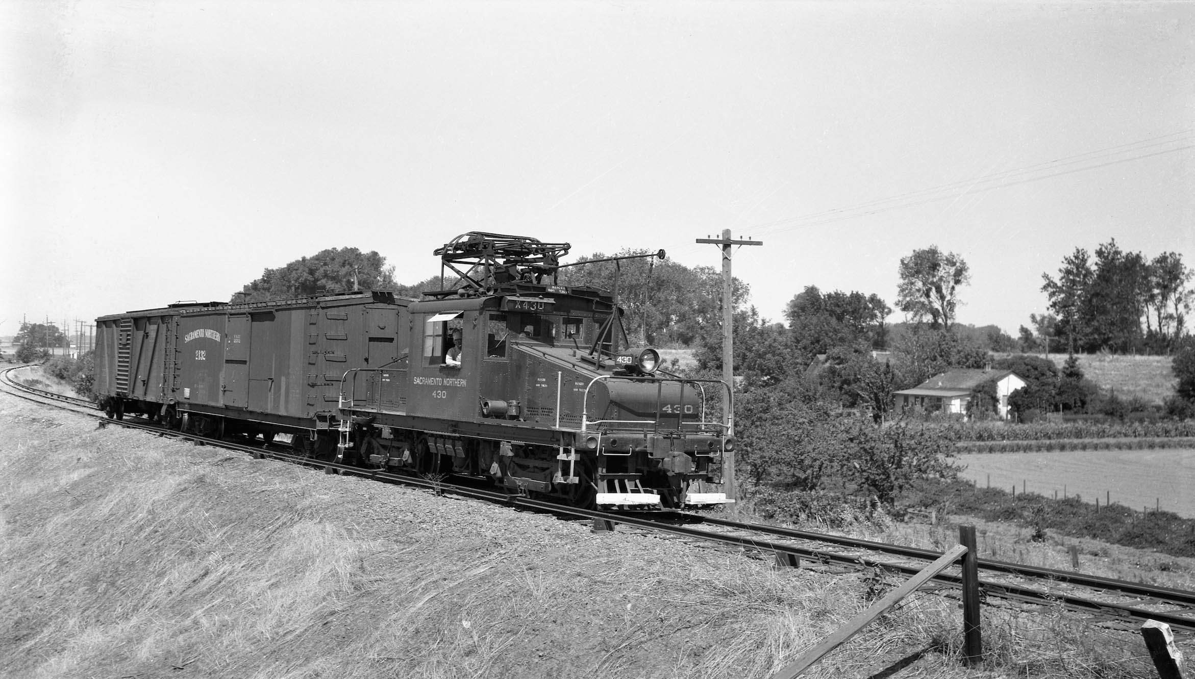 • On June 27, 1945, Bay Area railfan photographer Arthur Lloyd went to the SN North End to take pictures of electric freights. He took one photo at Live Oak, and took a series of images of a small freight crossing the slough. The first view is to the northwest, motor SN 403, SN boxcar 2132 and a Boston Maine boxcar passing the residence just to the east of the Tarke Warehouse.