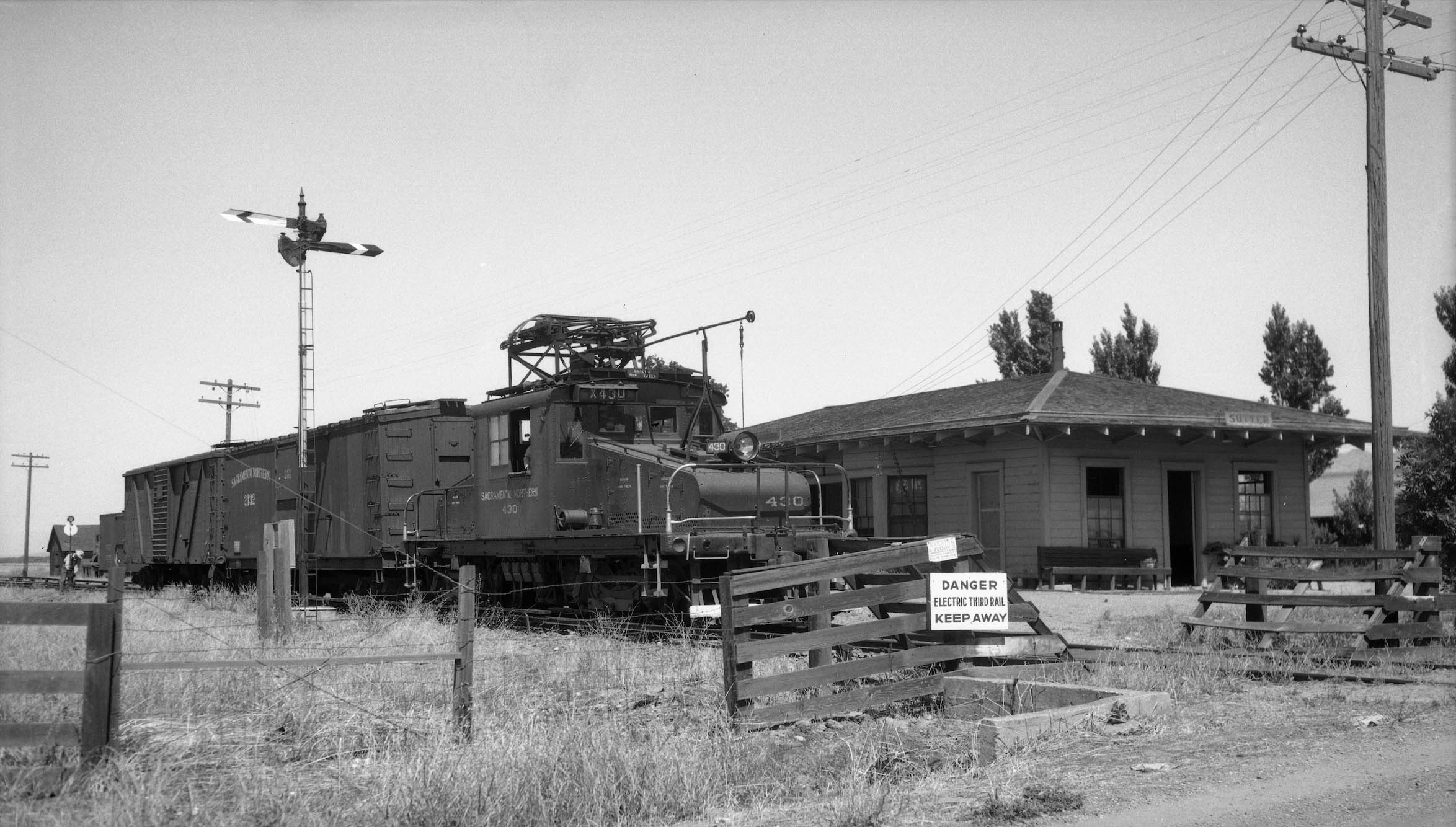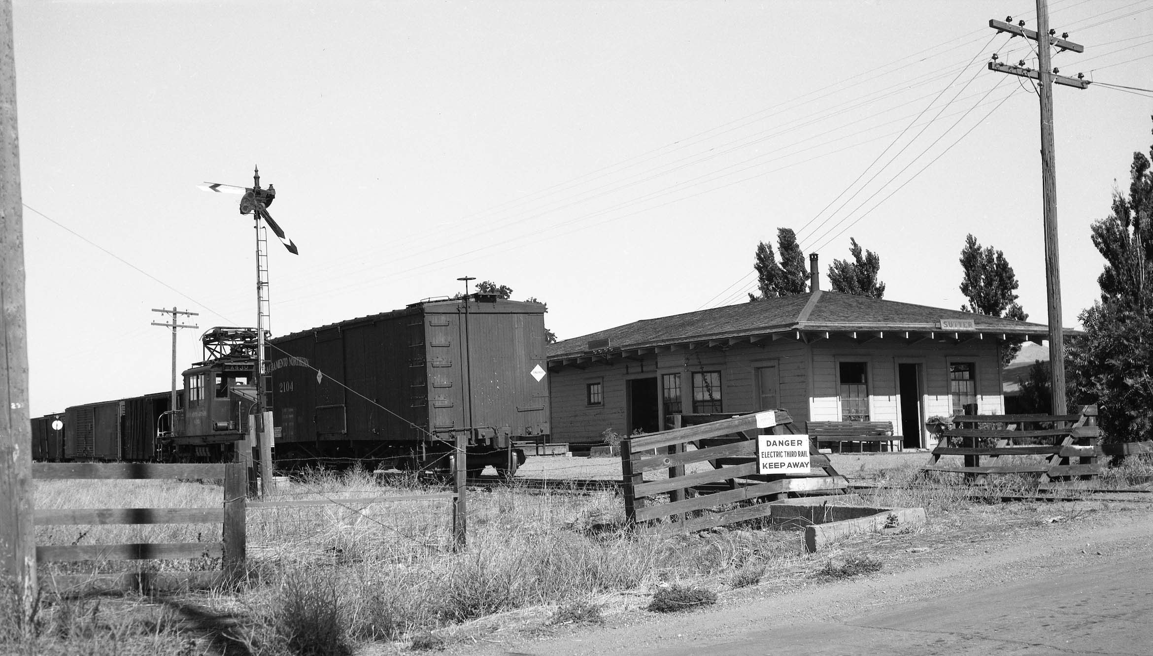 • Arthur Lloyd definitely made it to Sutter, this northwest view from June 27, 1945 at the Sutter depot. Note the train order board or train order mast. It was used to tell the engineer if he needed to pick up orders or if he could proceed. When in the stop position with arms straight out they needed to stop and pick up orders. The worker behind the train at the switch with a railcar on the track next to him to the north is a nice segue to the next image.