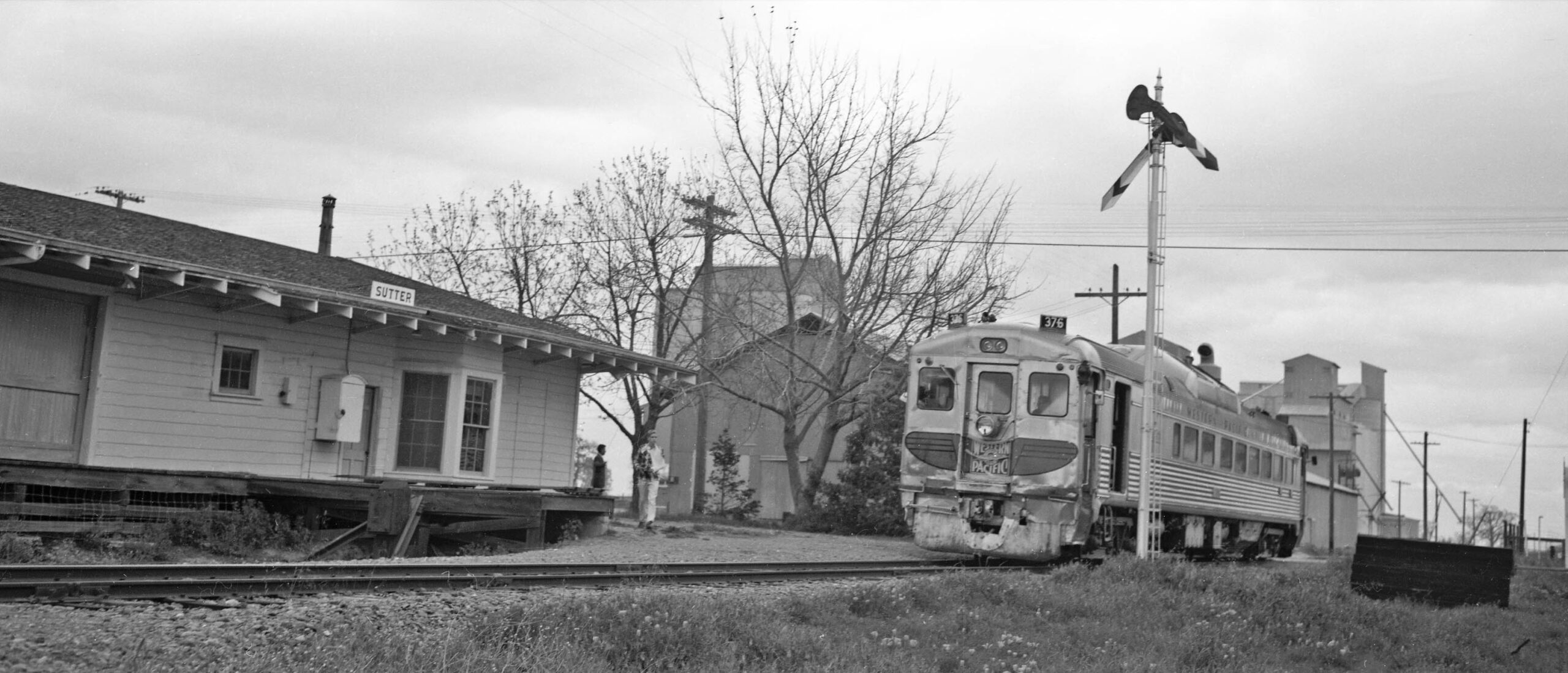 • Ahead to Oct. 31, 1953, WP RDC no. 375 is approaching the Sutter station area slowly in this east view. Note Hi & Dry facilities are now present, and the switch track sending off a siding to the south has come into view. The Sutter depot is in need of a new coat of paint, but it is no longer engulfed in wood products.