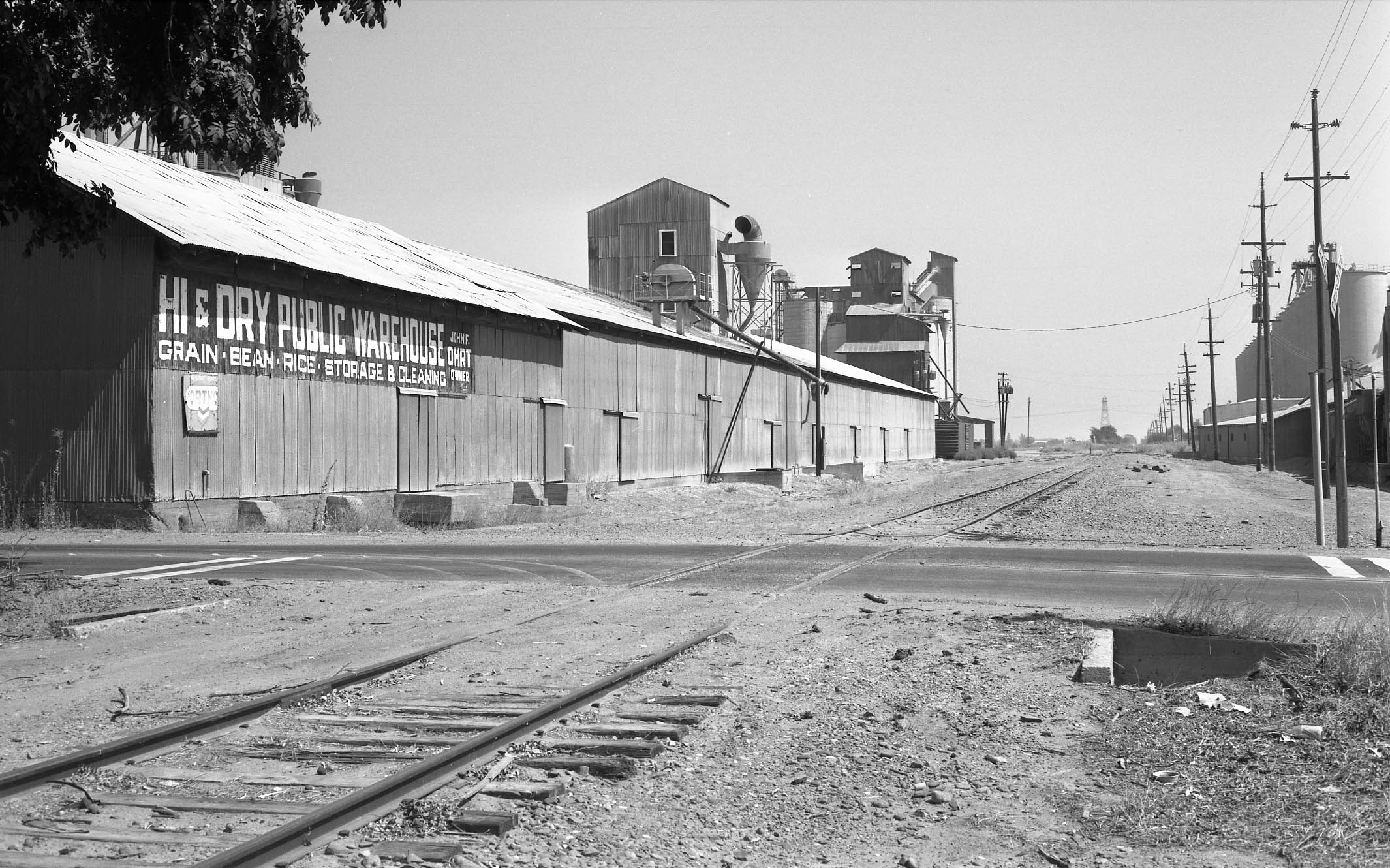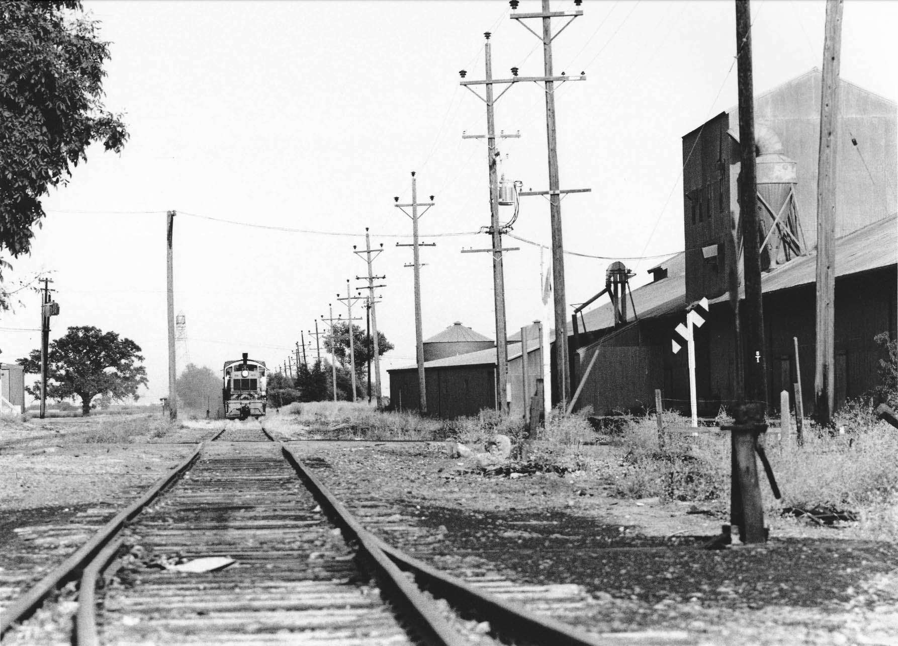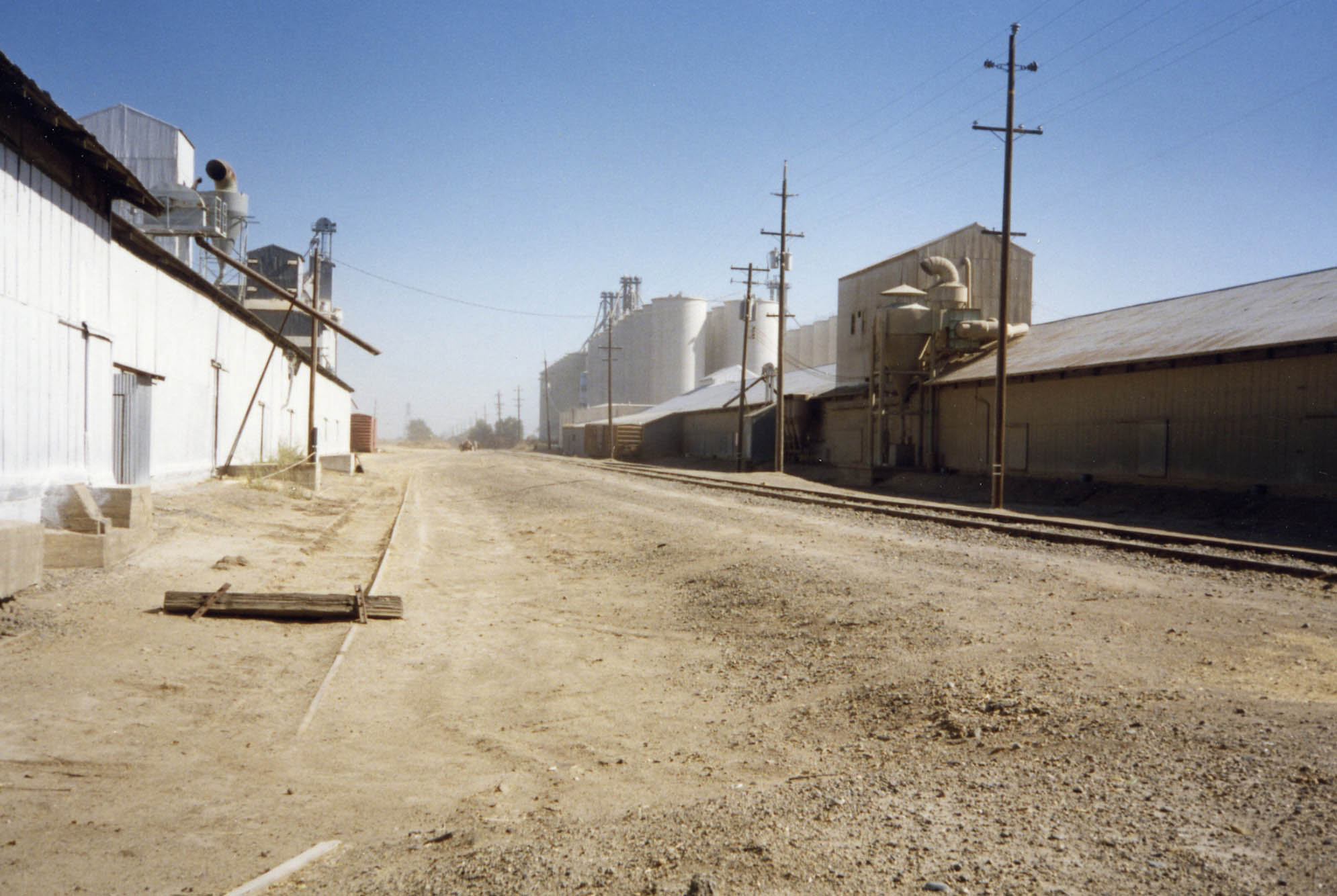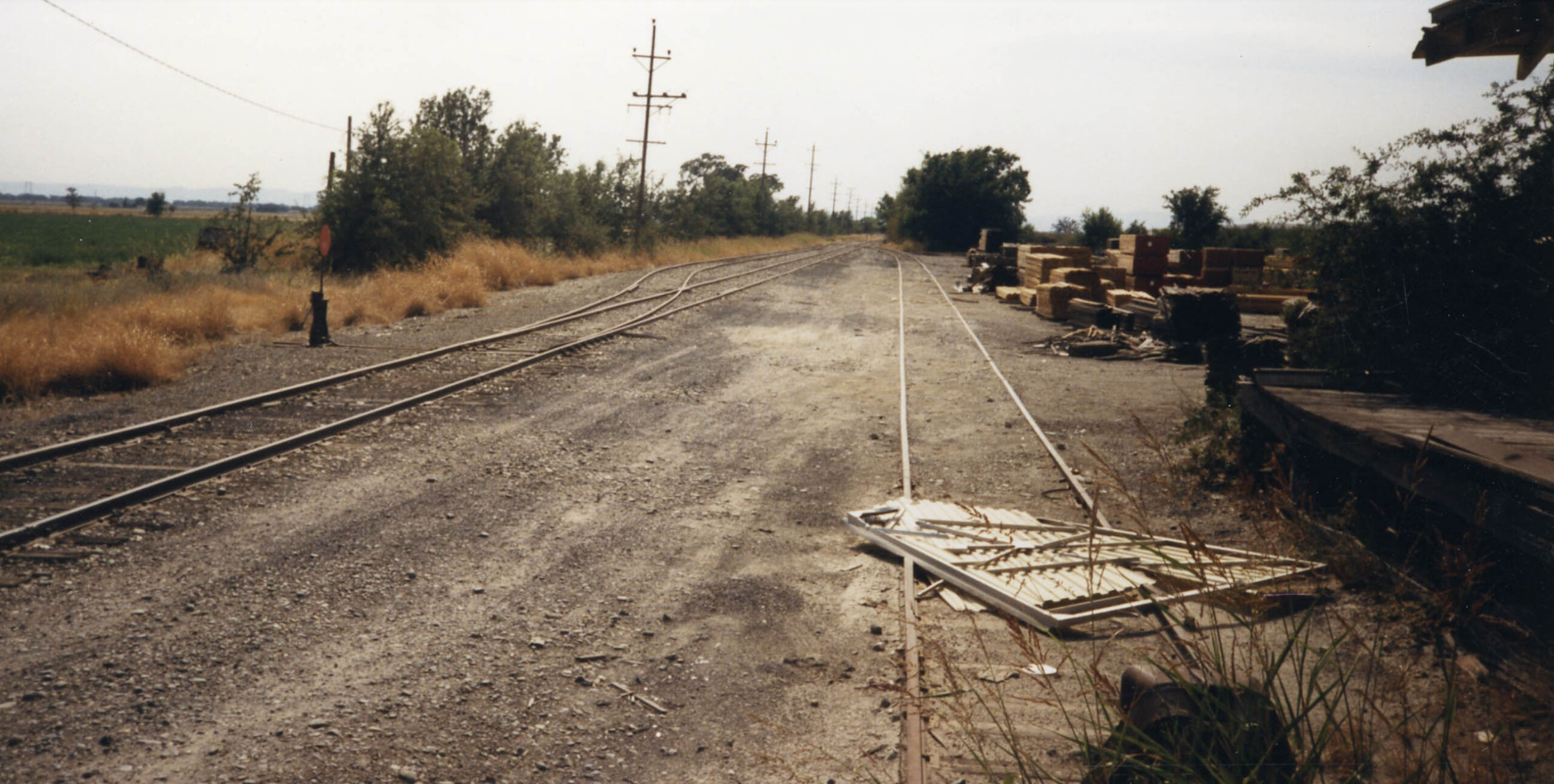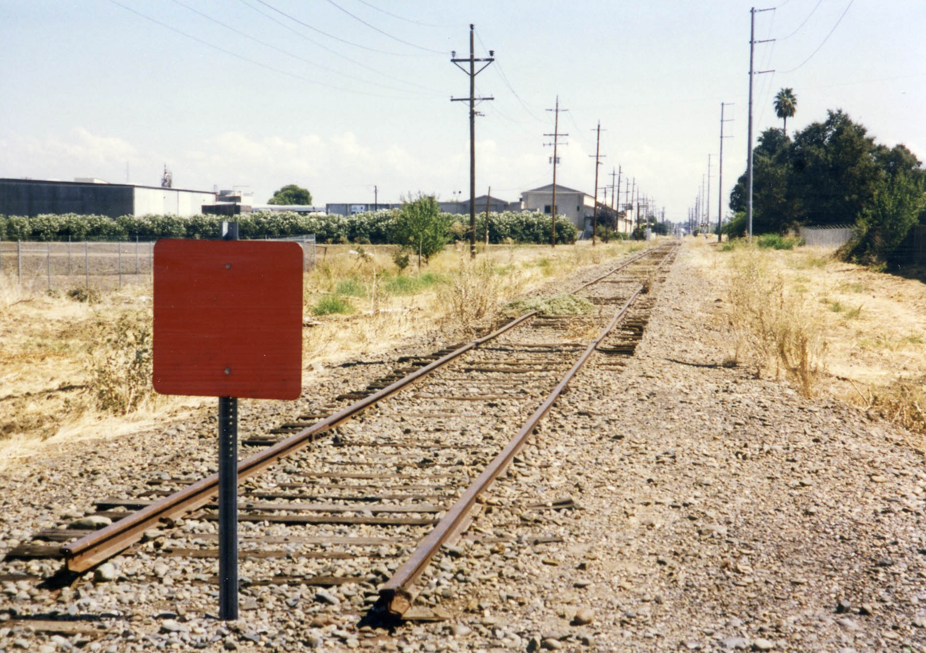 • An east view from Acacia Ave. on Sept. 15, 1988 shows Hi & Dry. Jeff Asay in his book, page 503, recorded it would not be until the spring of 1996 that the branch line would be abandoned by the Union Pacific, as business had tailed off to the entities there, although they remain in business in 2026. In 2026, the abandoned right-of-way serves as a bike trail to Hopper Rd., just west of Colusa Jct.