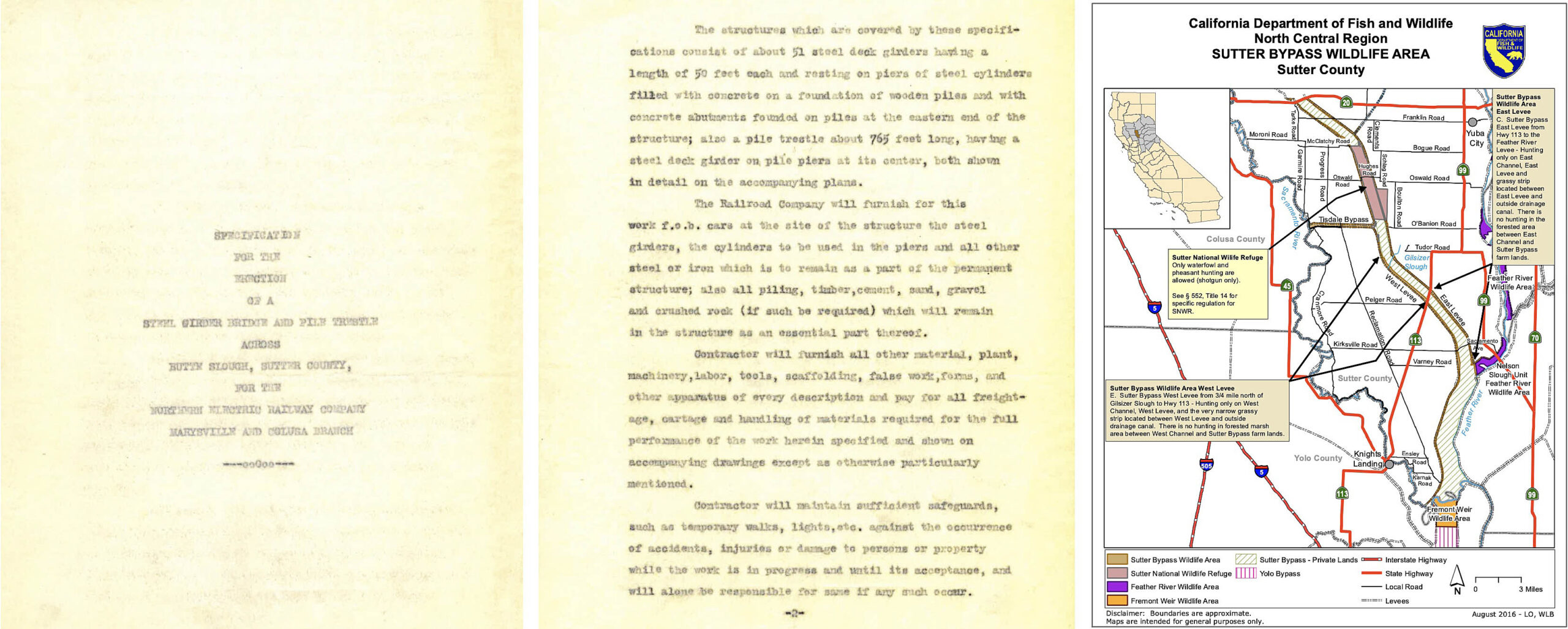 • Next for details about the construction of the slough overpass ca. 1911-1913. The second page of this proposal on the right outlines the Northern Electric Railway, NE, specifications for the slough overpass. Fifty-one steel girders, each fifty feet in length, accounted for the eastern “bridge”  portion of 2550 feet, the western portion a 765-foot long pile trestle. The reason for this hybrid design as a function of cost, water flow patterns, or the pending construction of the Sutter Bypass, right, has not been found. This map confirms that Highway 20 is the official northern border of the Sutter Bypass, however, delineating it from Butte Slough is often inconsistent in older documents.