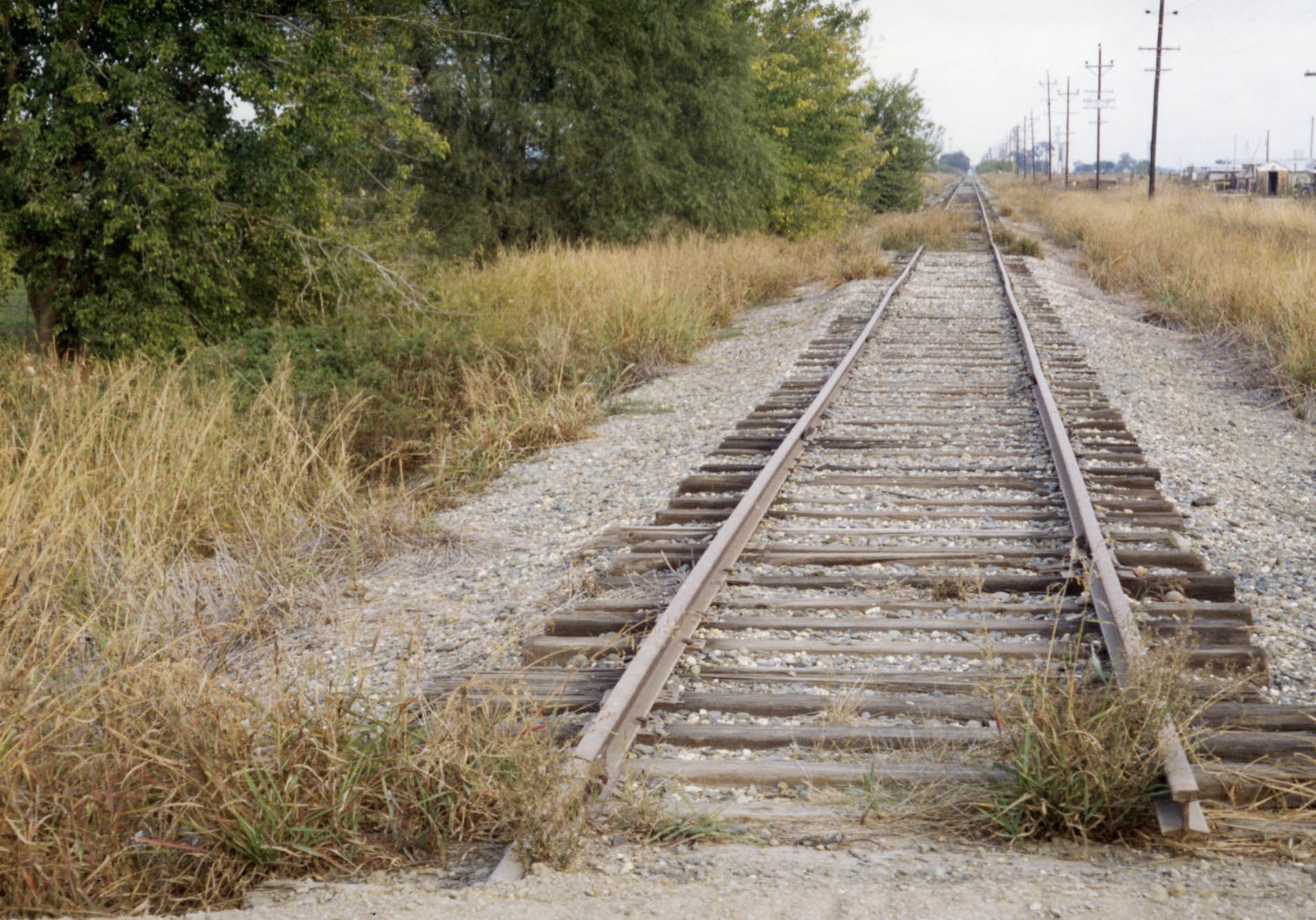• The WP applied to abandon the track from milepost 7.11 to Colusa Jct. in Nov. 1993, but only got the portion approved west of Sutter, that being milepost 5.24, on Sept. 1, 1994. The west view shown here is of the rail track that was abandoned, the truncated track at milepost 7.11 in Oct. 1993. The almost two miles of extra track had been used for storing railcars.