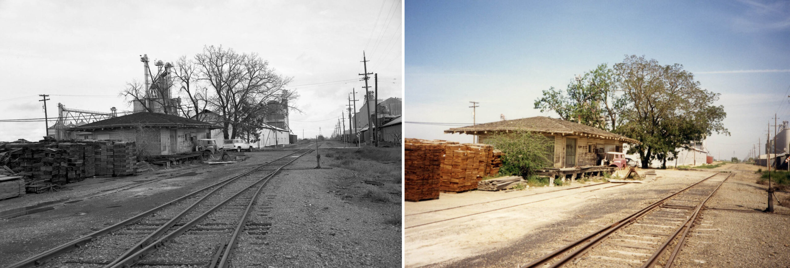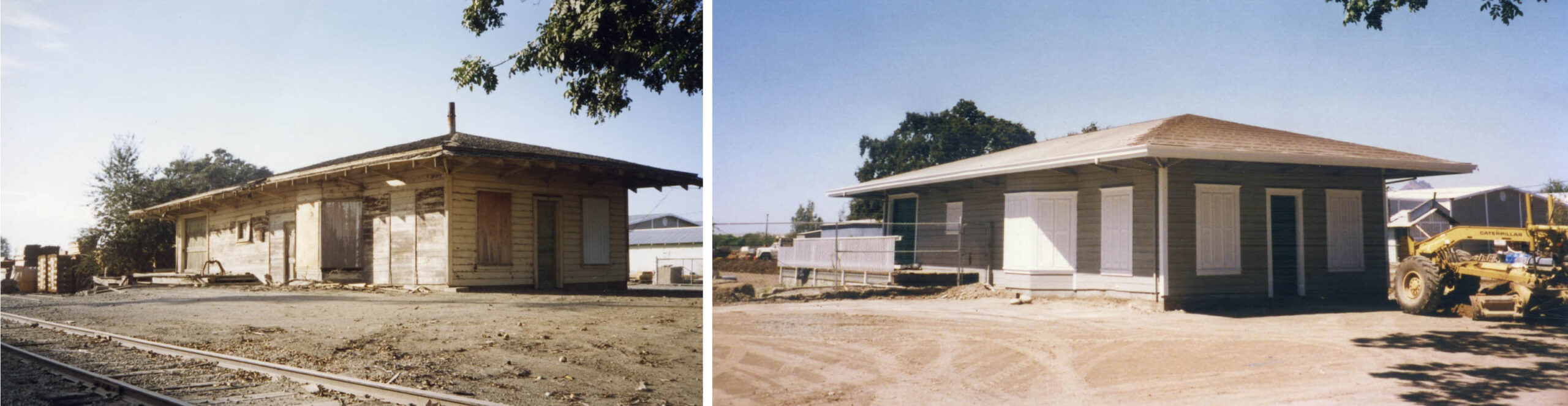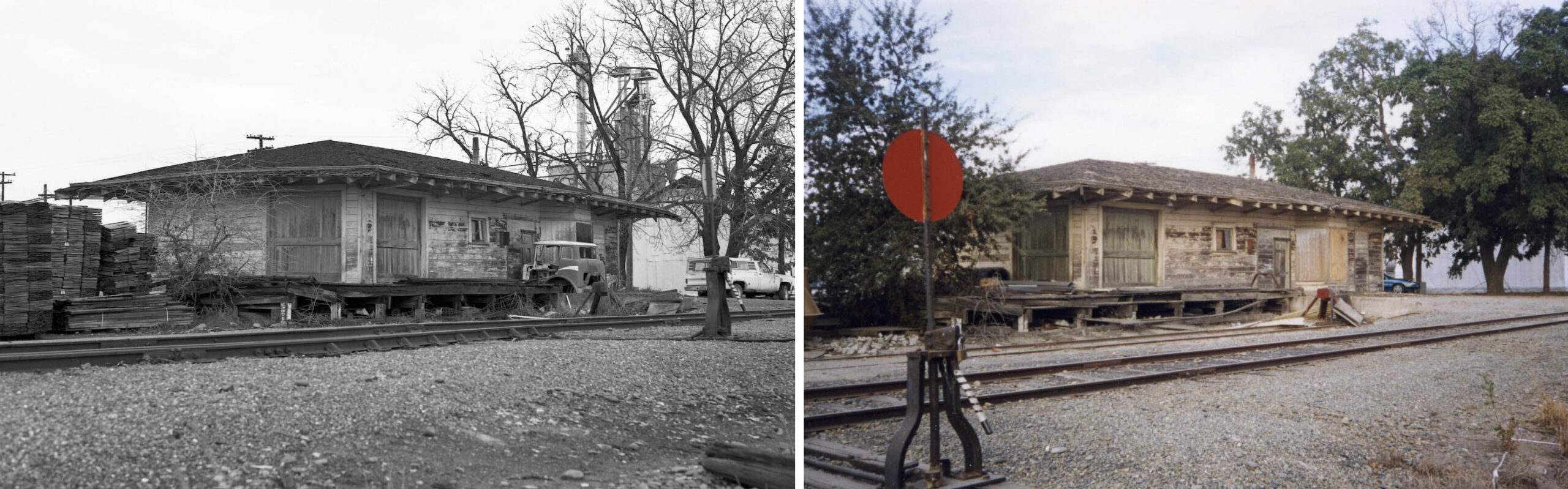 • Despite being used for the Close Lumber business, the former Sutter depot had experienced a second downturn in maintenance as seen in this northeast view from Feb. 17, 1990, left, and Oct. 1993, right.