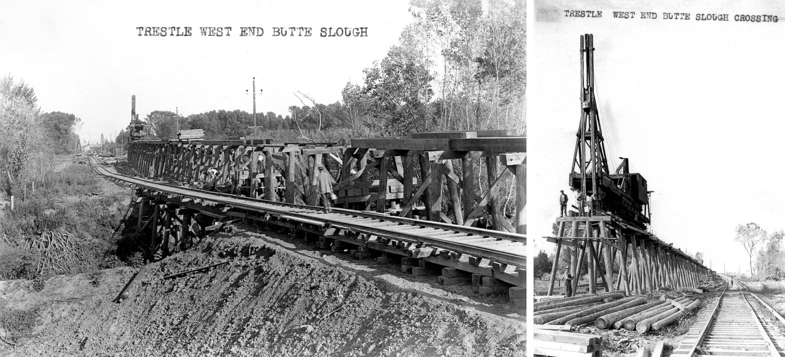 • From the west end, a pole driver started to assemble the wooden trestle, left, east view, a close up west view on the right, as the process of laying the rail followed the progress of the driver.