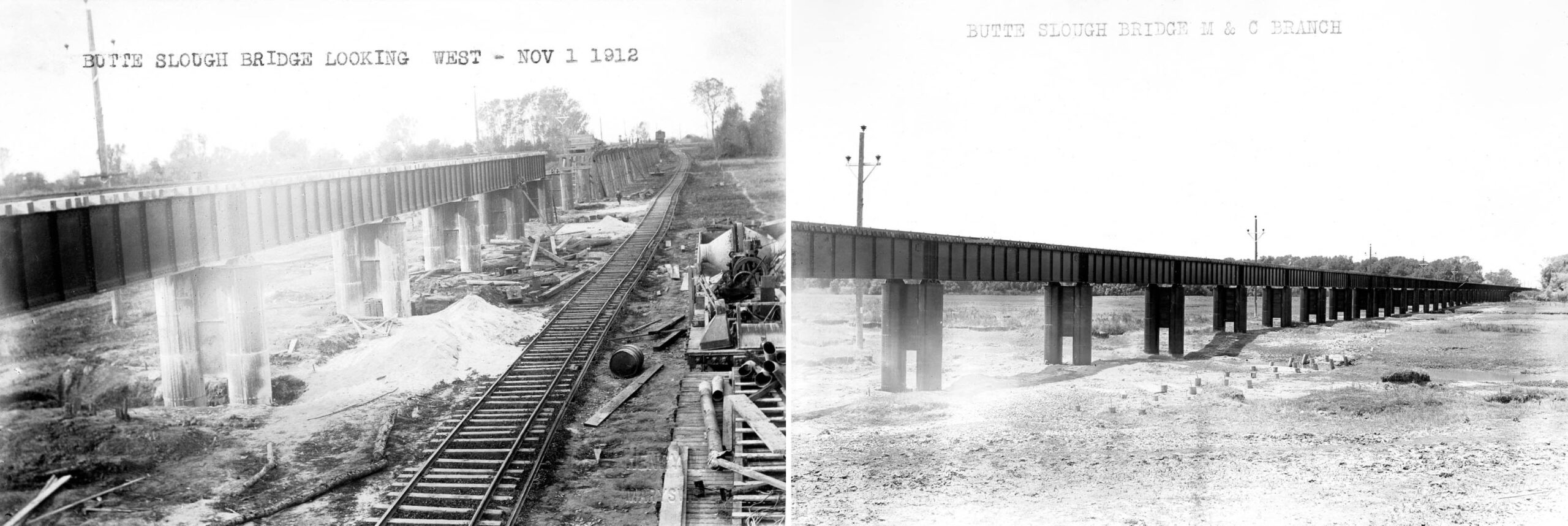 • Along with the grading of the path of the slough overpass, a temporary railroad was constructed to bring the timbers and steel plates to the positions they would assume in the structure. The locations of the images shown were not provided and could not be determined for sure, although the track configuration on the left appears to be that of a multi-track wye.