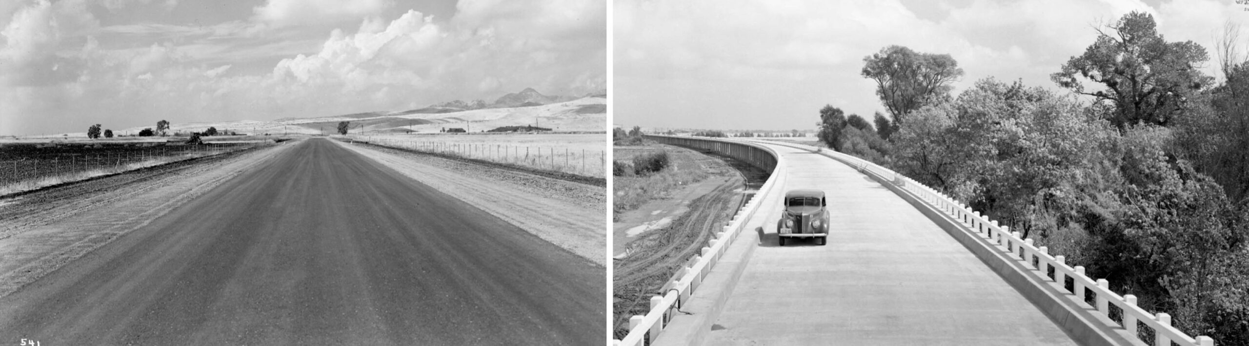 • By the time this west view was taken on Sept. 29, 1938, State Highway 20 had been extended from west of Sutter, left, to across the slough in an east view, right.