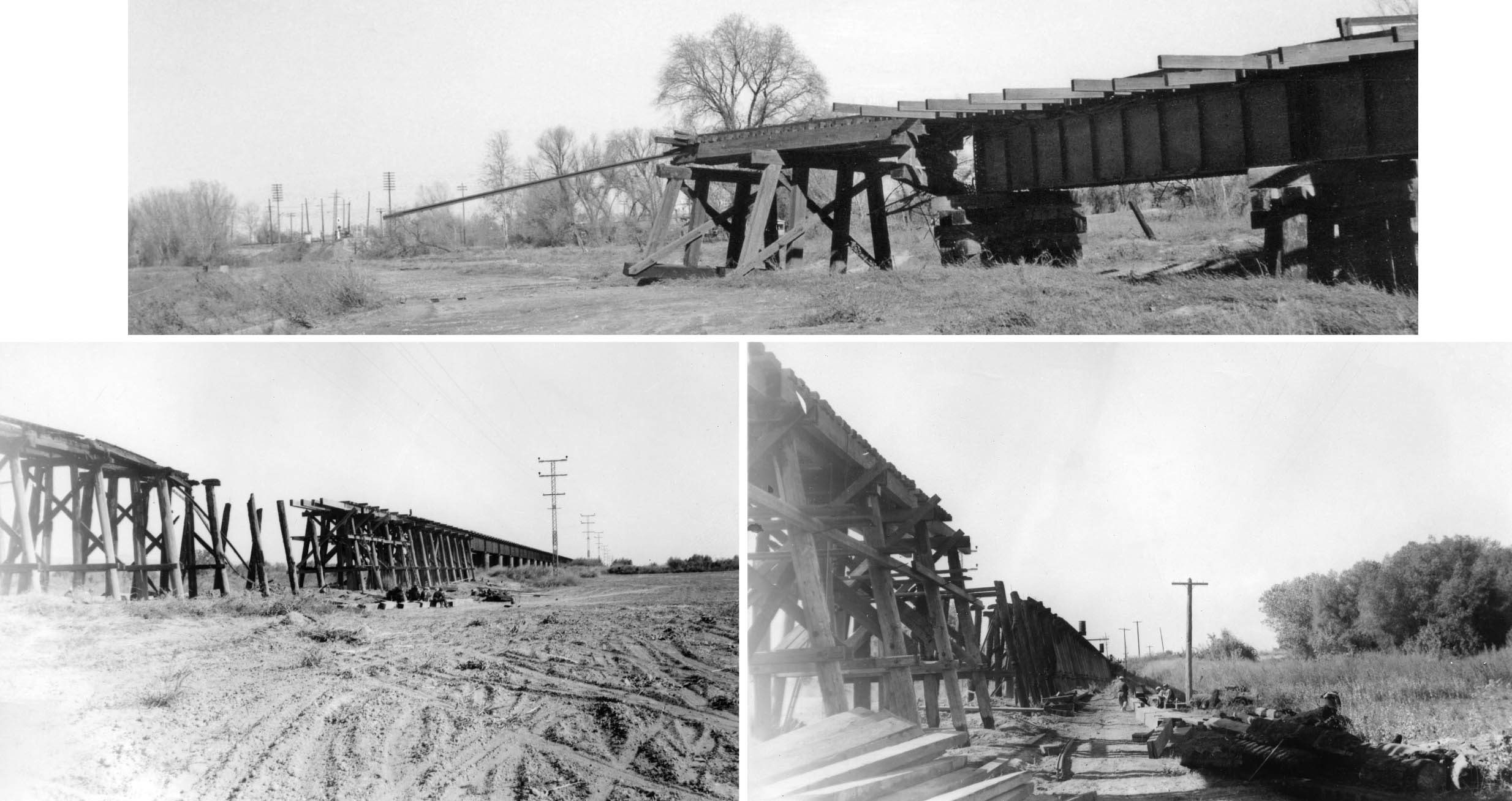 • The wooden portion of another hybrid steel-wooden overpass the NE created between Alicia and Oliver ca. 1907 did not do well in the Christmas Flood of 1955, top, and so too the slough overpass was severed within the wooden portion during a flood in 1942, the east view from the south side, left, the north side looking west, right, both from Oct 16, 1942.