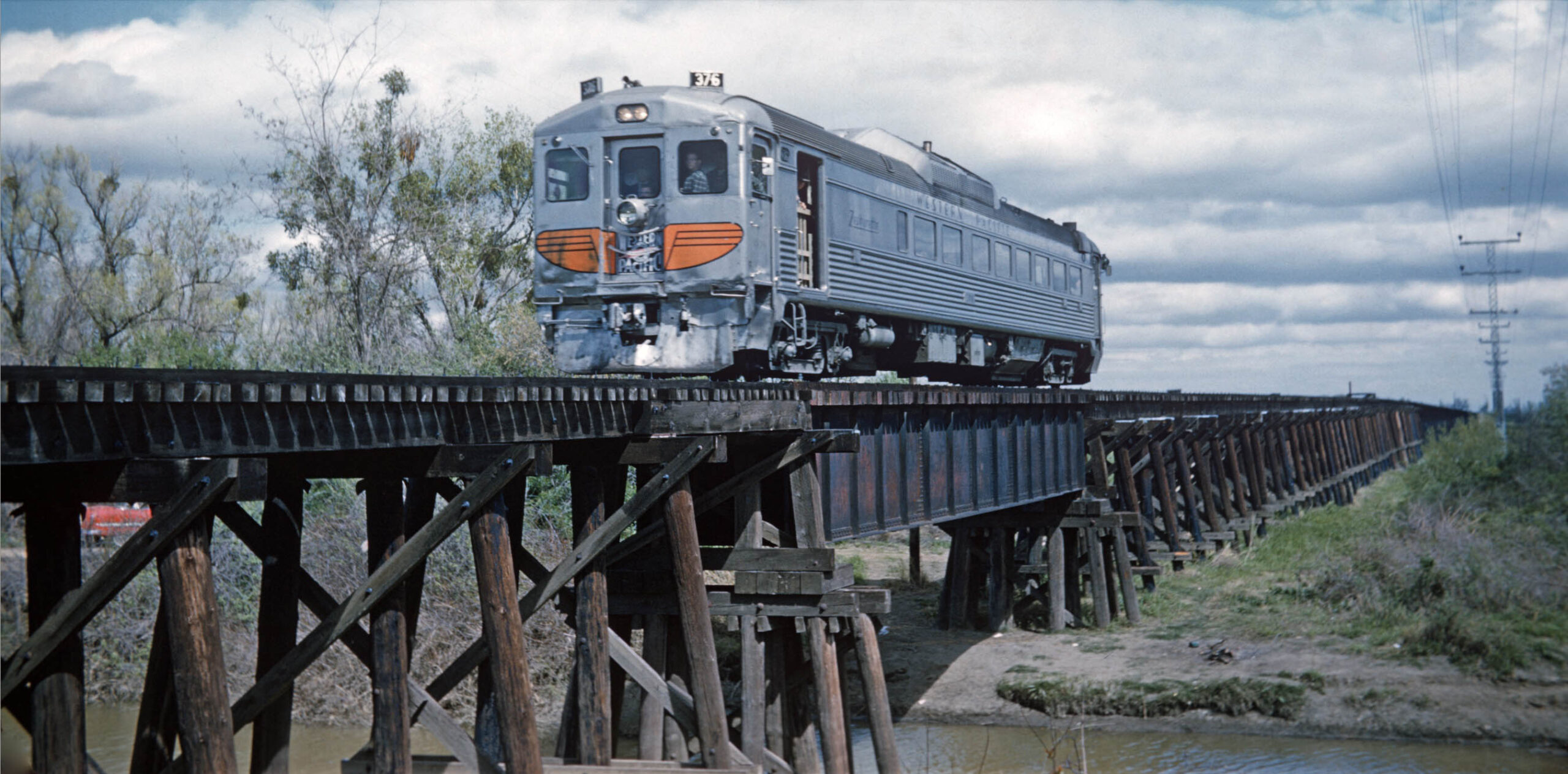 • Lloyd also participated in the Bay Area Electric Railroad Association, BAERA, excursion to Colusa on Mar. 26, 1960 with Western Pacific Rail Diesel Car, WP RDC, no. 376. He finally got a shot at the trestle that he didn’t get before. Note the single steel girder over the Butts Slough tributary. Even so, it is difficult to resolve the steel reinforced eastern portion of the overpass in the distance. After this event, no images of the Colusa Branch west of Sutter were found until Dick Dorn began taking photos there in the fall of 1973.