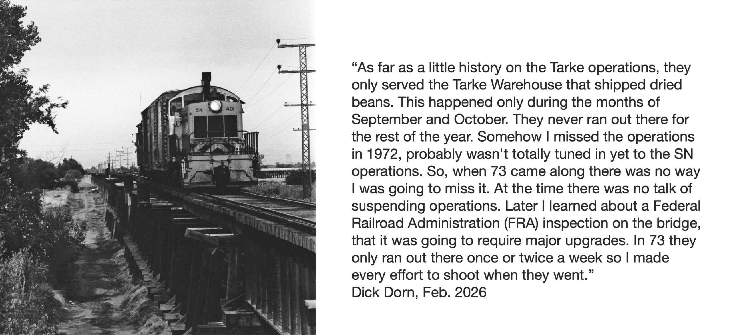 • The photos Dick took in 1973 of the slough overpass and track to Tarke are important for two reasons. First, it would be the last opportunity to document freight activity on this section of the SN. His comments from 2026 indicate that he didn’t have any knowledge of this being the case. Second, his choice of lens allowed him to compress the entire overpass from the single western end steel girder overpass seen in the last image to the east end concrete abutment as seen on the left in the east view of SN 201, boxcar and caboose on Sept. 25, 1973.