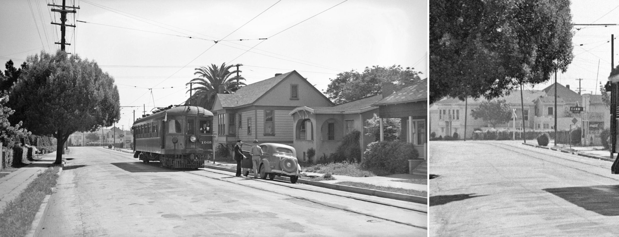 Just when you think you have it completely figured out, a photo pops up that says you don’t. Leave it to the one-of-a-kind image maker Howard Wolfe for this southwest view just north of Shafter Ave. and 49th St. from 1940, left. SN 1005 is marked “x” with a white flag involved in some official run in front of 4907 Shafter Ave., with the conductor talking to man whose car needs to be moved. In the background, right detail, note the candy store at 48th St. No other images were taken at 48th St. during this time, no oblique aerials were found from that time period, and nothing listed in directories or reverse directories. More research needed here to reveal the store’s history.