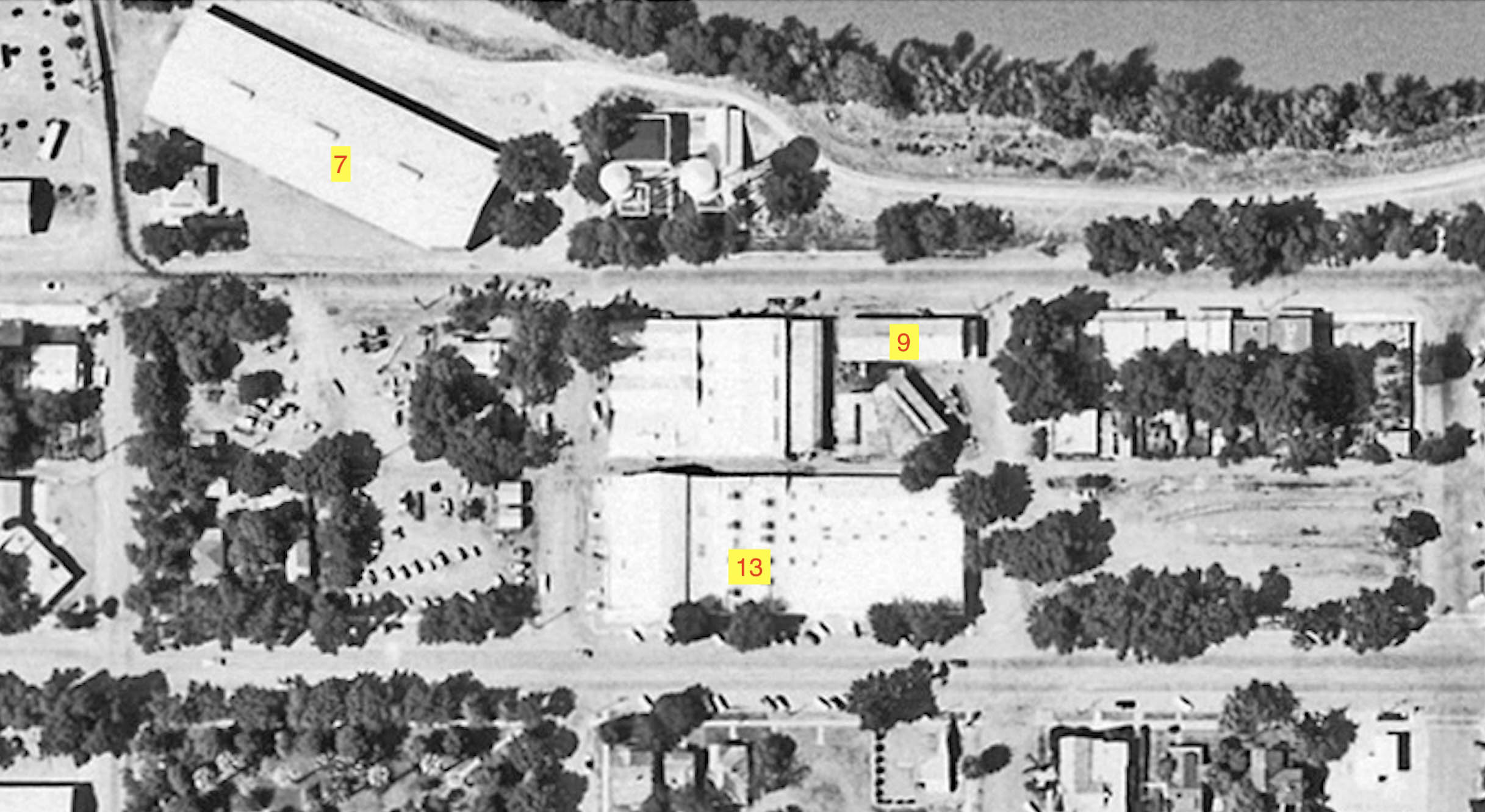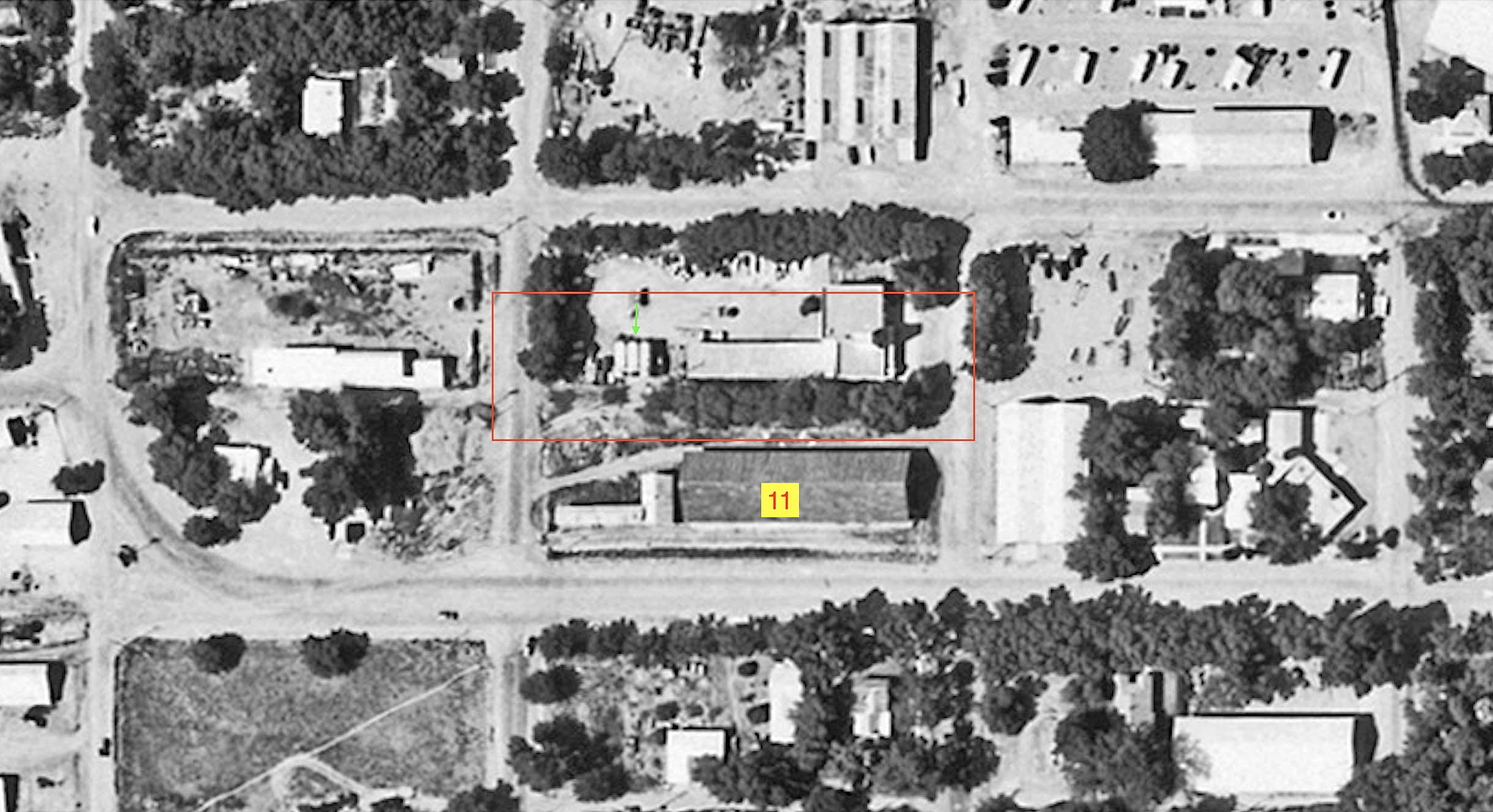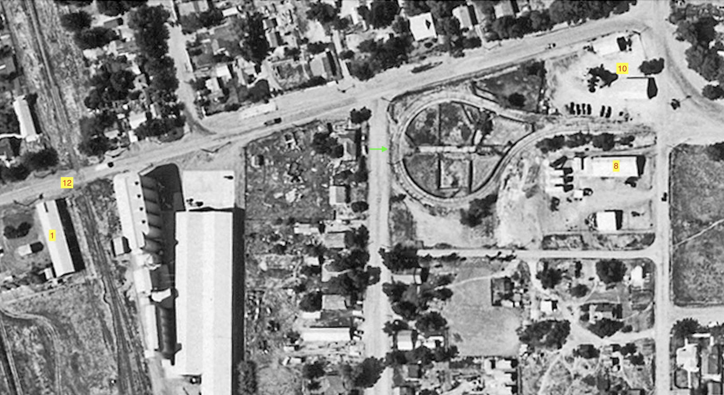 This detail from the aerial from 1957 includes the section just described, but also extends to the adjacent area from 10th St., right border to 13th St., left border. There are no freight cars seen, and the list from the WP Circular indicates only the Zumwalt warehouse, no. 11. seen in the previous image. The two rails car present in the background were along the spur enclosed by the red rectangle, parked just to the east or right of the three large tanks, green arrow.