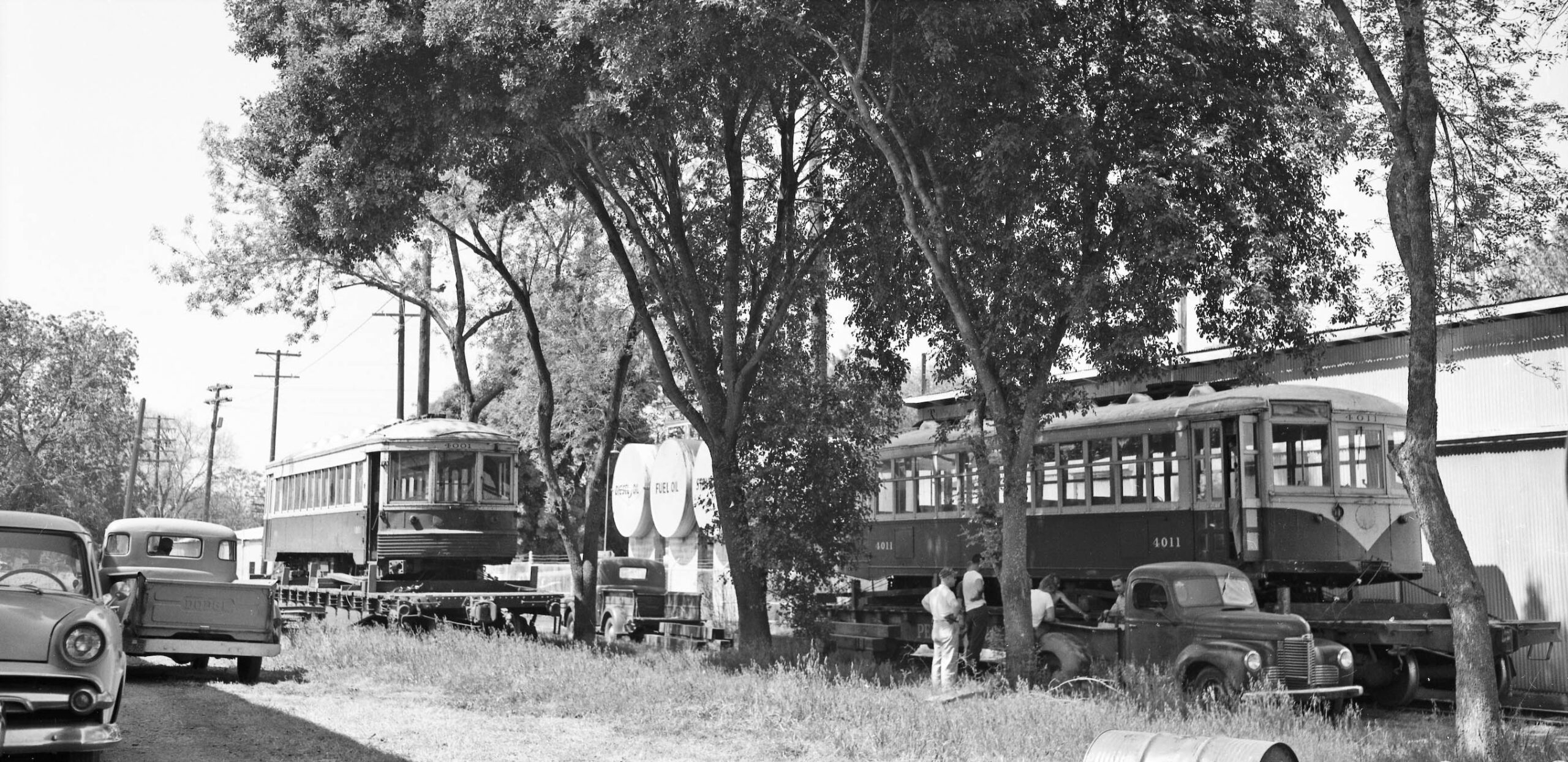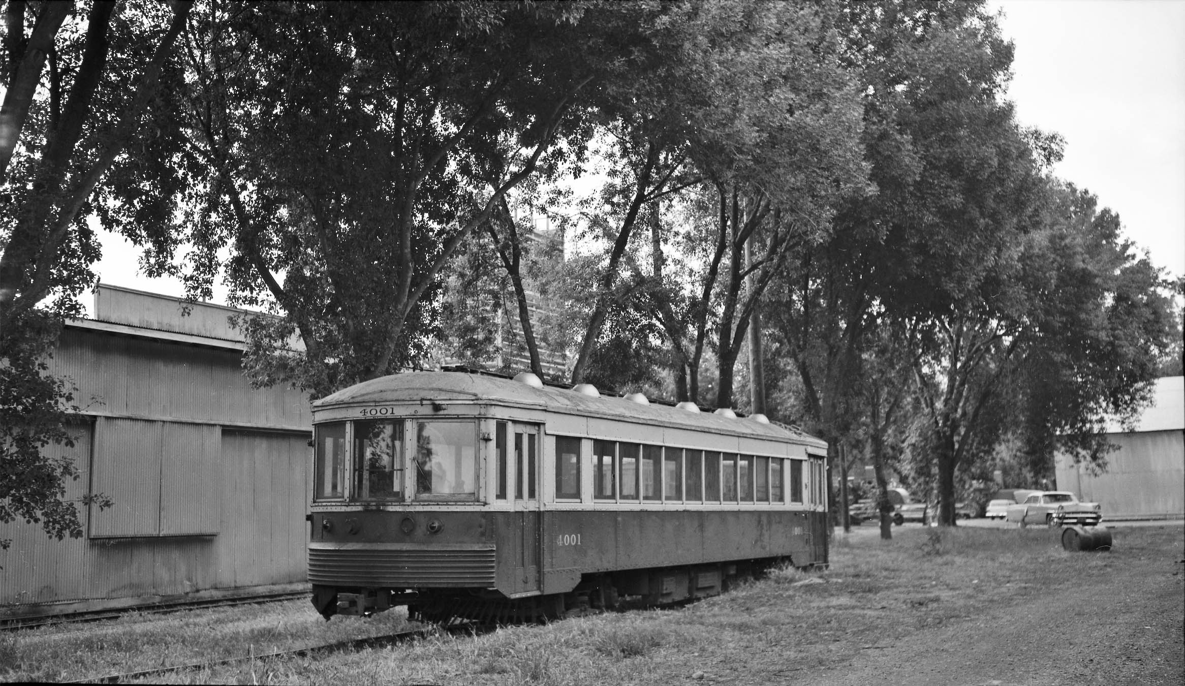 On Mar. 4, 1959, BAERA members elected the officers of the NCERM. The delivery of cars to Colusa began on Apr. 6, 1959 in Portland, with Portland Traction Co., PTC, 4001, ex-Indiana RR 202, loaded on by its own power using a ground cable to Rock Island flatcar 90342, and car 4011, former Key car 987 that had been lent to PTC by BAERA, on Pennsylvania RR flatcar 469782. Car 4001 served as payment to BAERA for the loan of the Key car. They were transported by the Spokane, Portland & Seattle Railway, the Great Northern Railway, and WP to Marysville. No images showing this transfer en route were found. Northeast view, also Apr. 11, 1959.