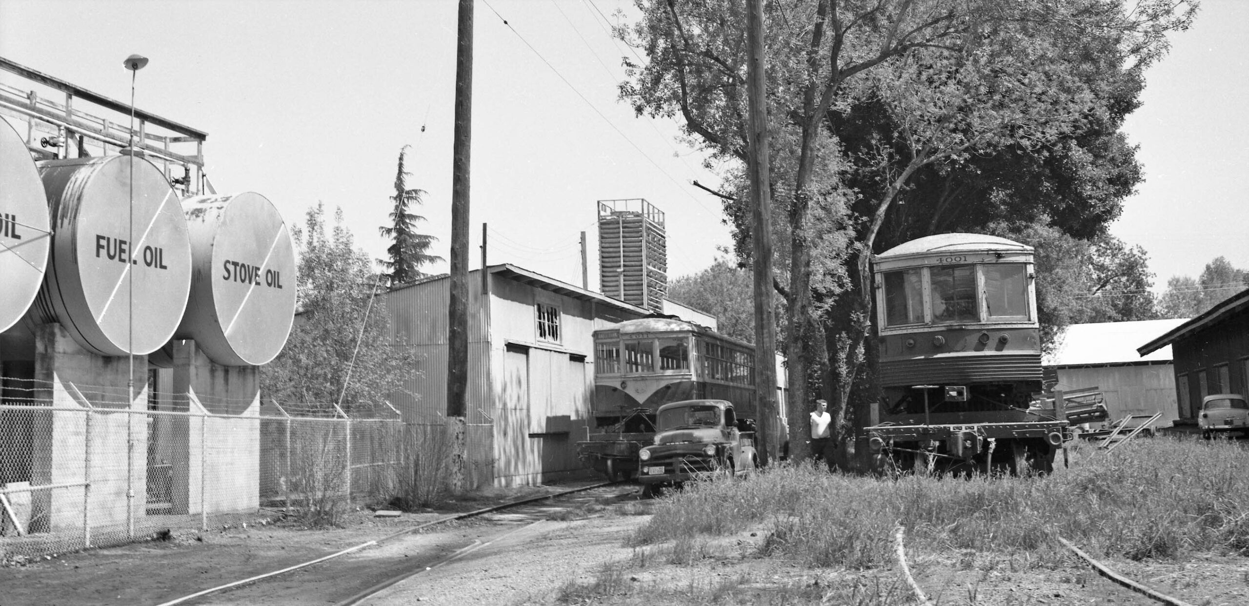 The scene is a northeast view from Apr. 11, 1959, and the members of the NCERM are positioning Portland Traction 4001, left, and 4011, right, to unload. The tanks holding oils and the building match what was outlined in the previous panel. Excerpts from the Bay Area Review 1958-1960 tell the story. On Feb. 16, 1959, the City Council of Colusa unanimously approved the NCERM to operate streetcars on the city streets on Saturdays, Sundays and holidays during the summer subject to an agreement between the city and museum to be negotiated. About 20 electric railway cars from several sources had been offered to start the museum at this point.