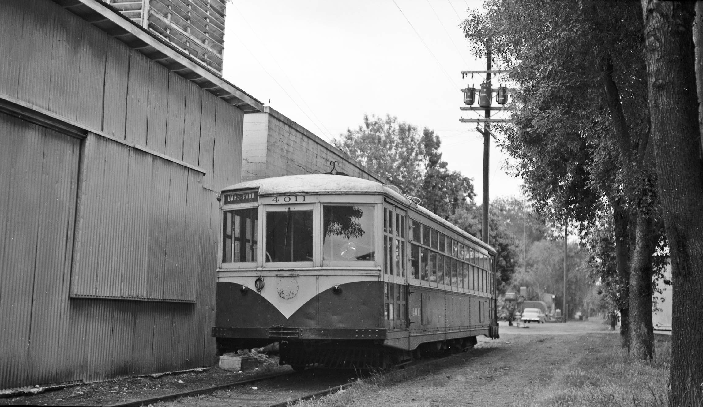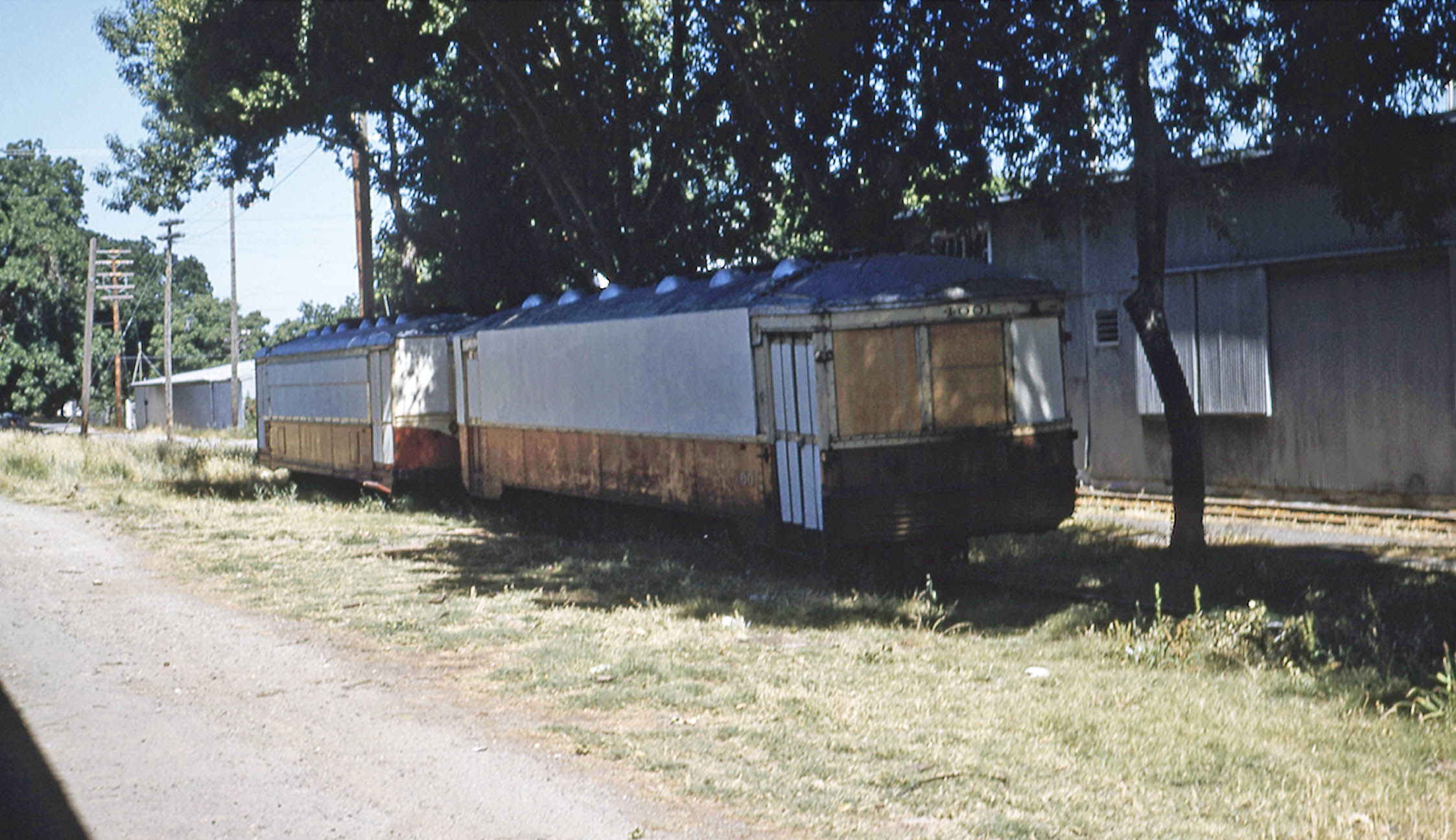 On July 20, 1960, the SN abandoned its Colusa Branch west of Meridian. The two street cars were moved “from the team track they now occupy to the spur at the old rice mill at Arbee … owned by I. G. Zumwalt Co. which uses the old rice mill building to store mud used in connection with oil well drilling.” This would explain the 1955 telephone listing the misspelled “Rosenburg Whse” shown earlier. However, the NCERM was “unable to post the $80k bond required as a guarantee that it would relieve the SN of repaving operations in connection with the abandonment of the rails on Colusa’s Market St.” Northwest view of PTC 4011, Apr. 25, 1959.