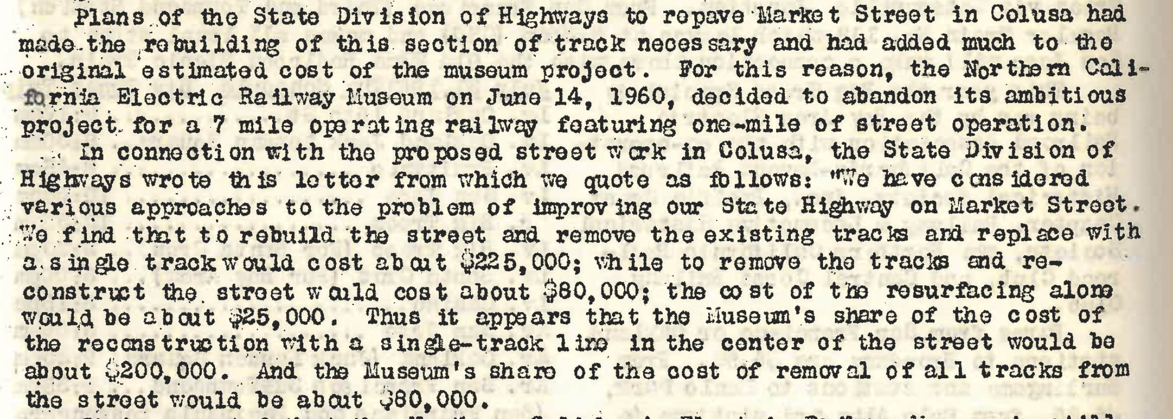 Market St. had been part of the State highway system prior to the construction of the Colusa Branch. The State Division of Highways had planned to repave it once the SN abandoned, and made the rebuilding of this section of track necessary, adding to the original estimated cost of the museum project. Although the letter from the State to the NCERM was not found, the Bay Area Review did provide a transcript of its contents, shown here, outlining the financial analysis of the work to be done after the SN abandonment.