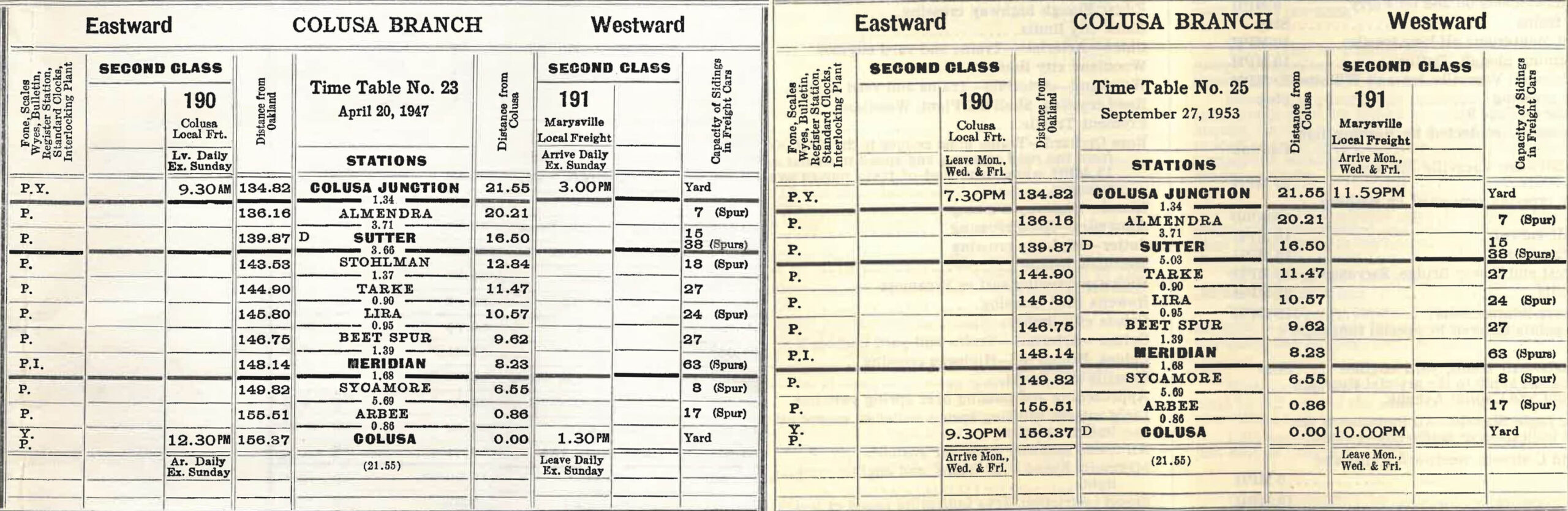Comparing the employee timetable from Apr. 20, 1947, left, to Sept. 27, 1953, right, service to Colusa was down from six to three days a week, and from one hour total time to one half hour. These timetables, however, do not actually provide the actual amount of carloads of freight to and from Colusa, and the actual amount of time spent by the train crews.