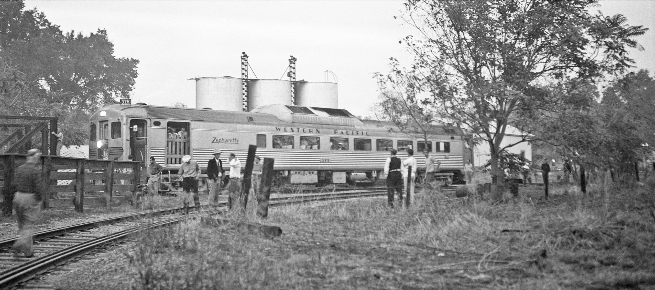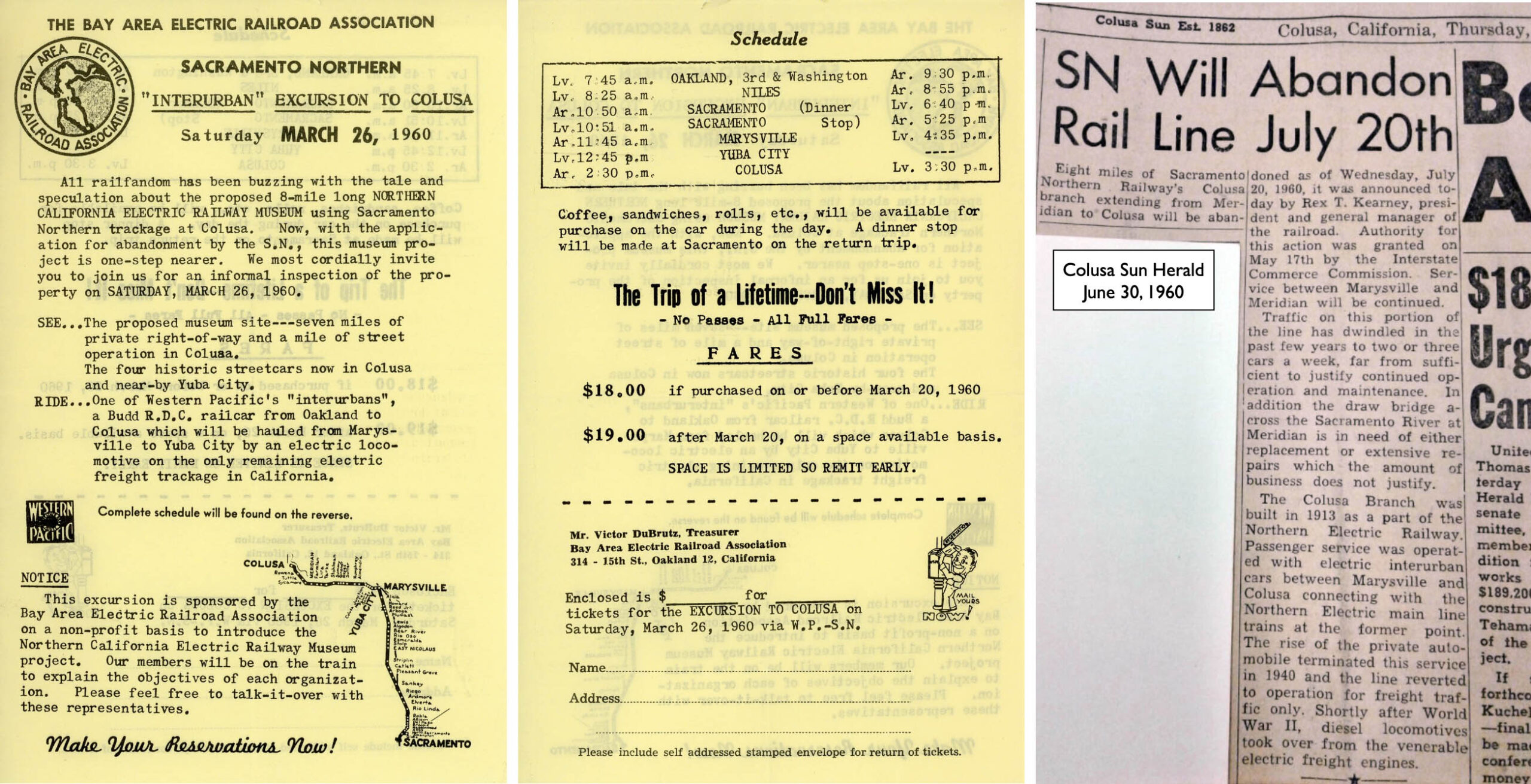 There would be one more excursion to Colusa using WP RDC no. 376 on Mar. 26, 1960. For this one, there was a motivating factor, that is, the Bay Area Electric Railroad Association, BAERA, members were looking for a place to create a museum, the Northern California Electric Railway Museum, NCERM. As the Colusa line west of Meridian was about to be abandoned, some members considered Colusa a possible place for the museum. On the right, the SN abandonment was complete three months later, the lack of business in concert with the State wanting to replace the Meridian Bridge to the east as the two key factors.