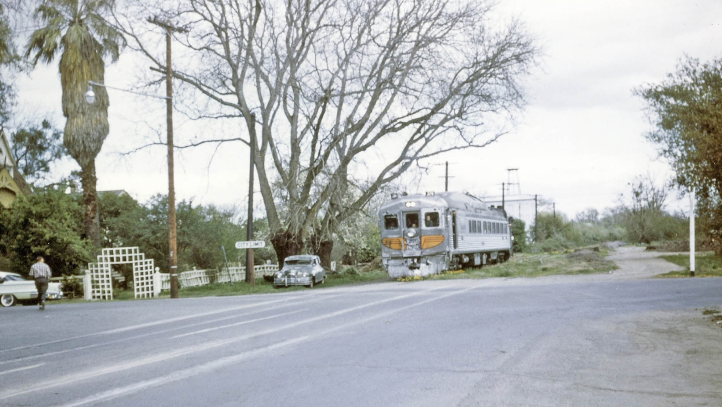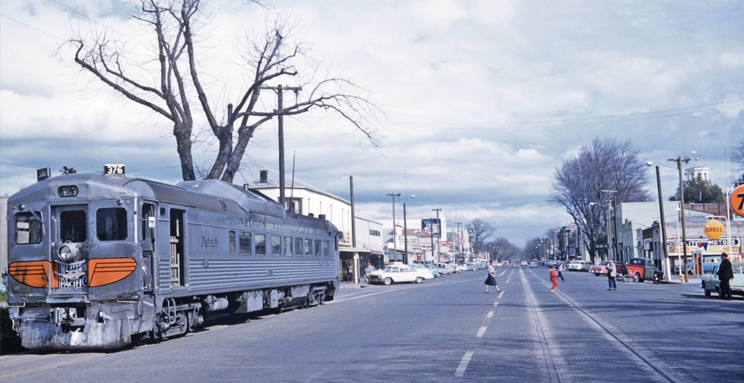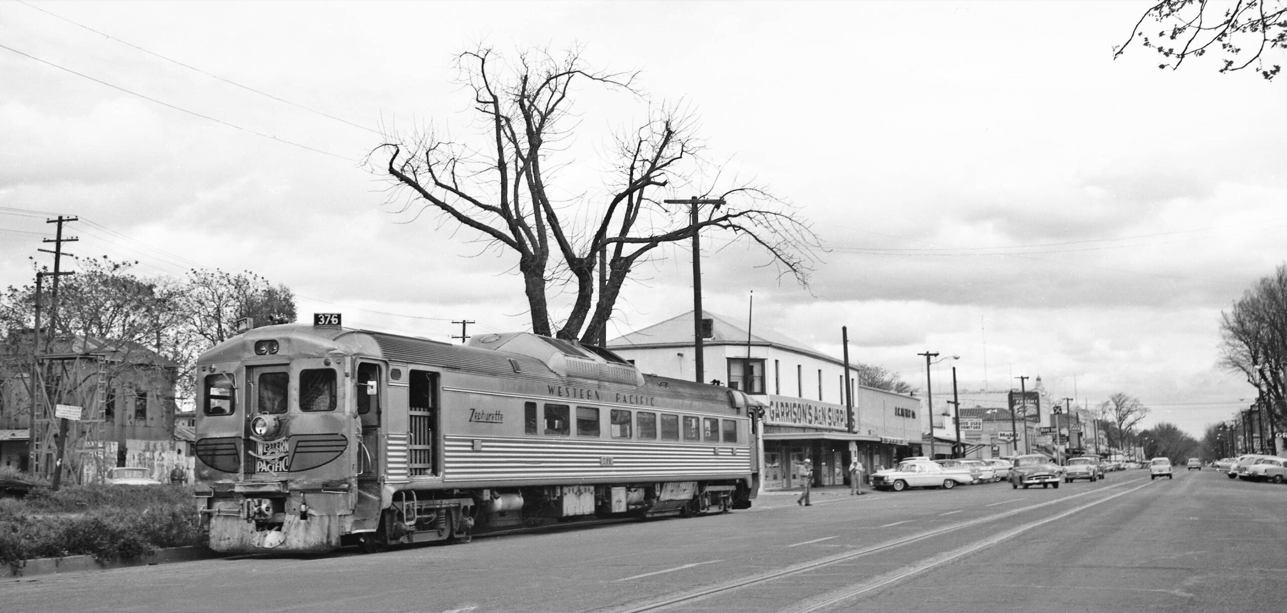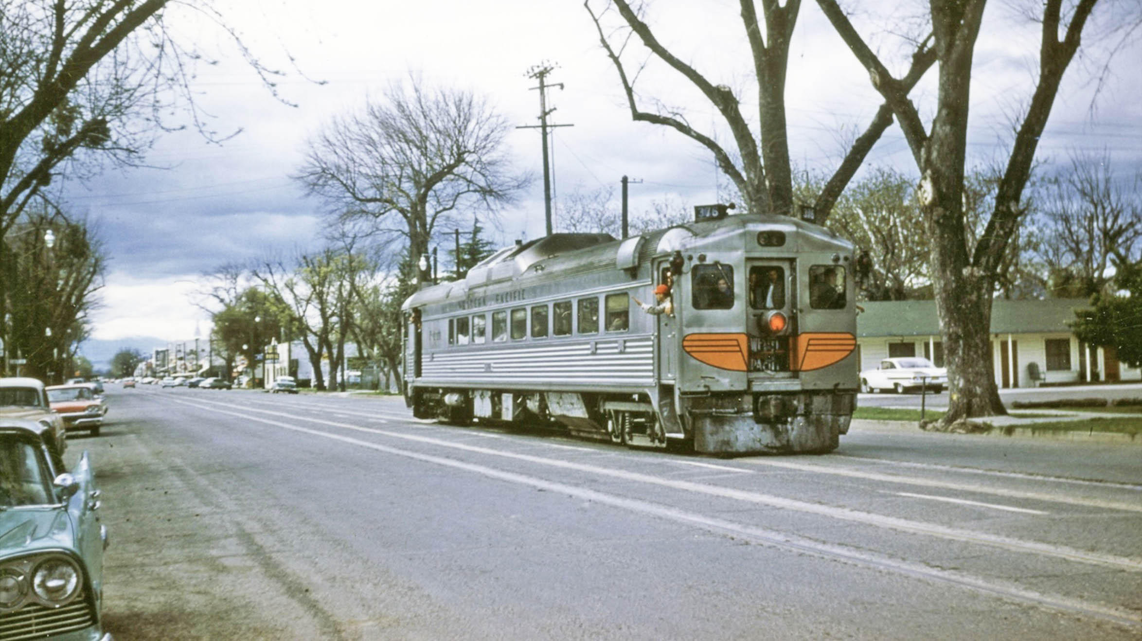 The RDC is at 1st St. in this west view. In 2025, the motel building seen just to the right of the train is the Colusa Motel.