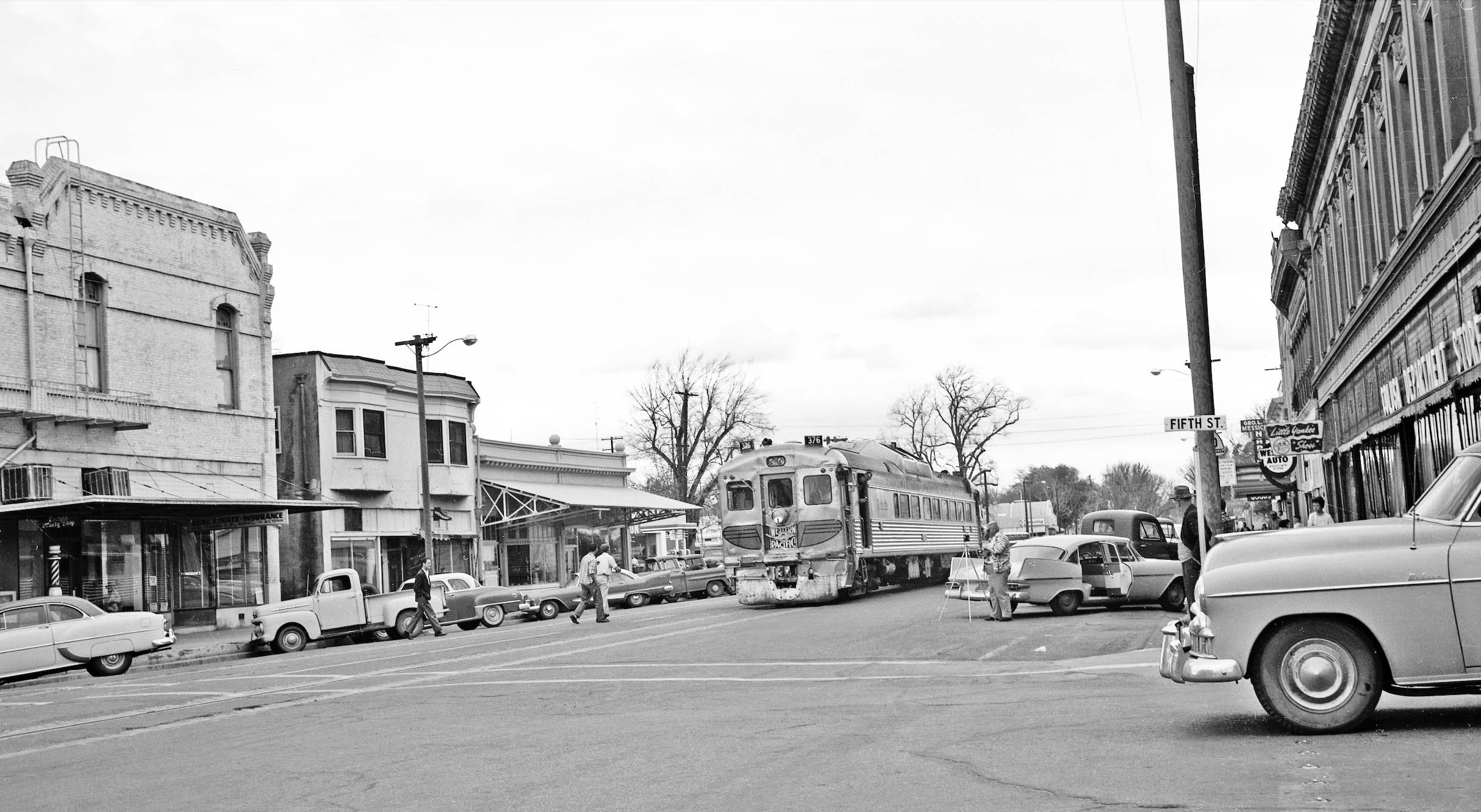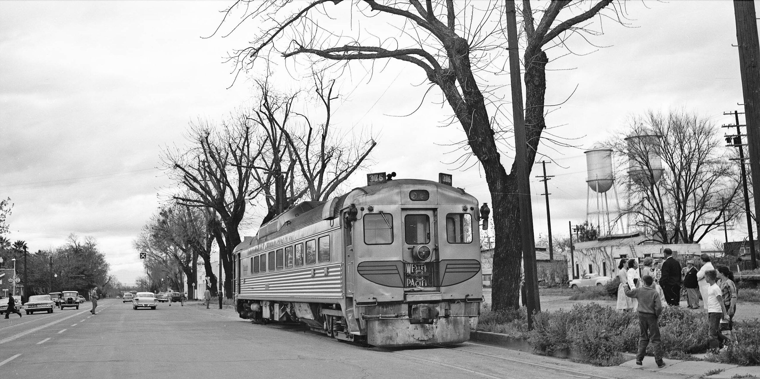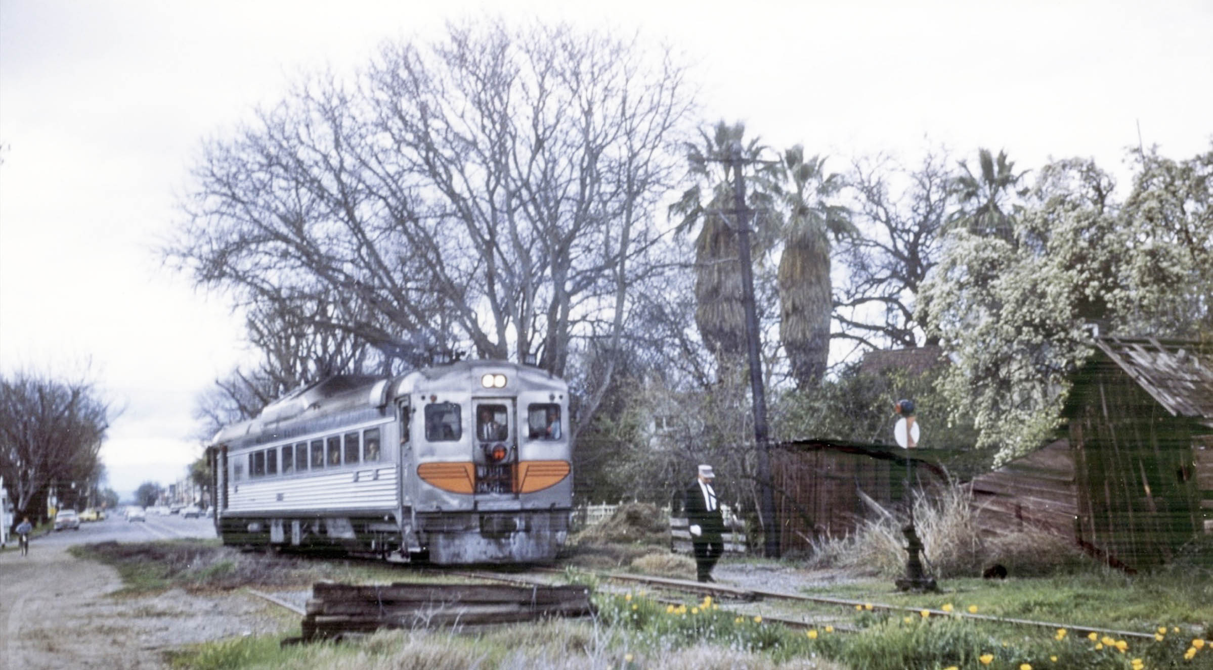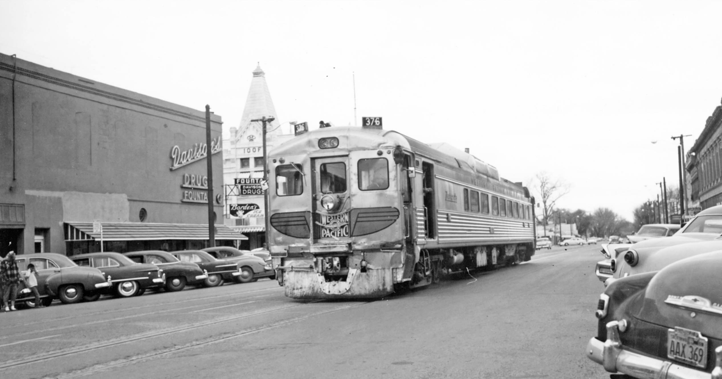 The RDC is at 1st St. in this west view. In 2025, the motel building seen just to the right of the train is the Colusa Motel.