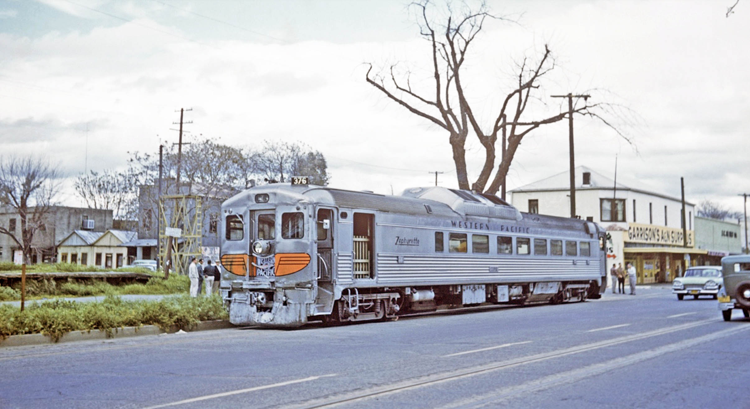 Ahead again to 1953 as it was the year a passenger train returned to Colusa on Oct. 31, left. This was a very ambitious excursion, arriving while the sun was setting in Colusa, probably accounting for why so few pictures were taken. On the right, Western Pacific Rail Diesel Car, WP RDC, car no. 375, “RDC”, takes a rest along the SN yard on Market St. between 7th and 8th Sts, east view.