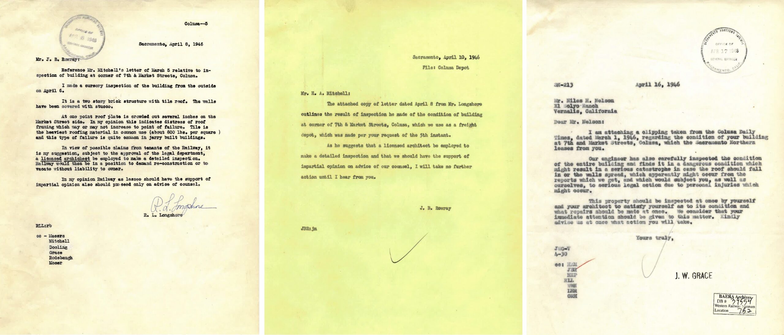 As documented in the last update, the SN had planned to create their own ticket-freight office within the confines of their adjacent yard in 1922, but that never happened. The memos shown here reveal significant structural degradation to the infrastructure of the building they were leasing. As the outside of the building remains unchanged in the previous two images from what was there in 1940, repairs to the structure were probably undertaken after these memos changed hands.