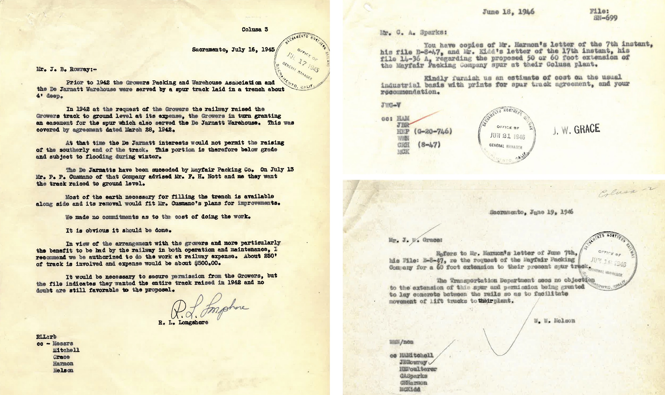 The last update featured the SN spur track to California Prune and Apricot Growers and the W. D. De Jarnett Dehydrater and Packing Plant on the western border of Colusa on 14th St., just outside the city limits. Mayfair Packing was also featured as leasing a warehouse at the northwest corner of Market St. and 12th St. in 1921. A San Jose-based dried fruit packer, these documents indicate the business was taking over the Jarnett facility asking for the SN to extend the SN spur to the south along 14th St.