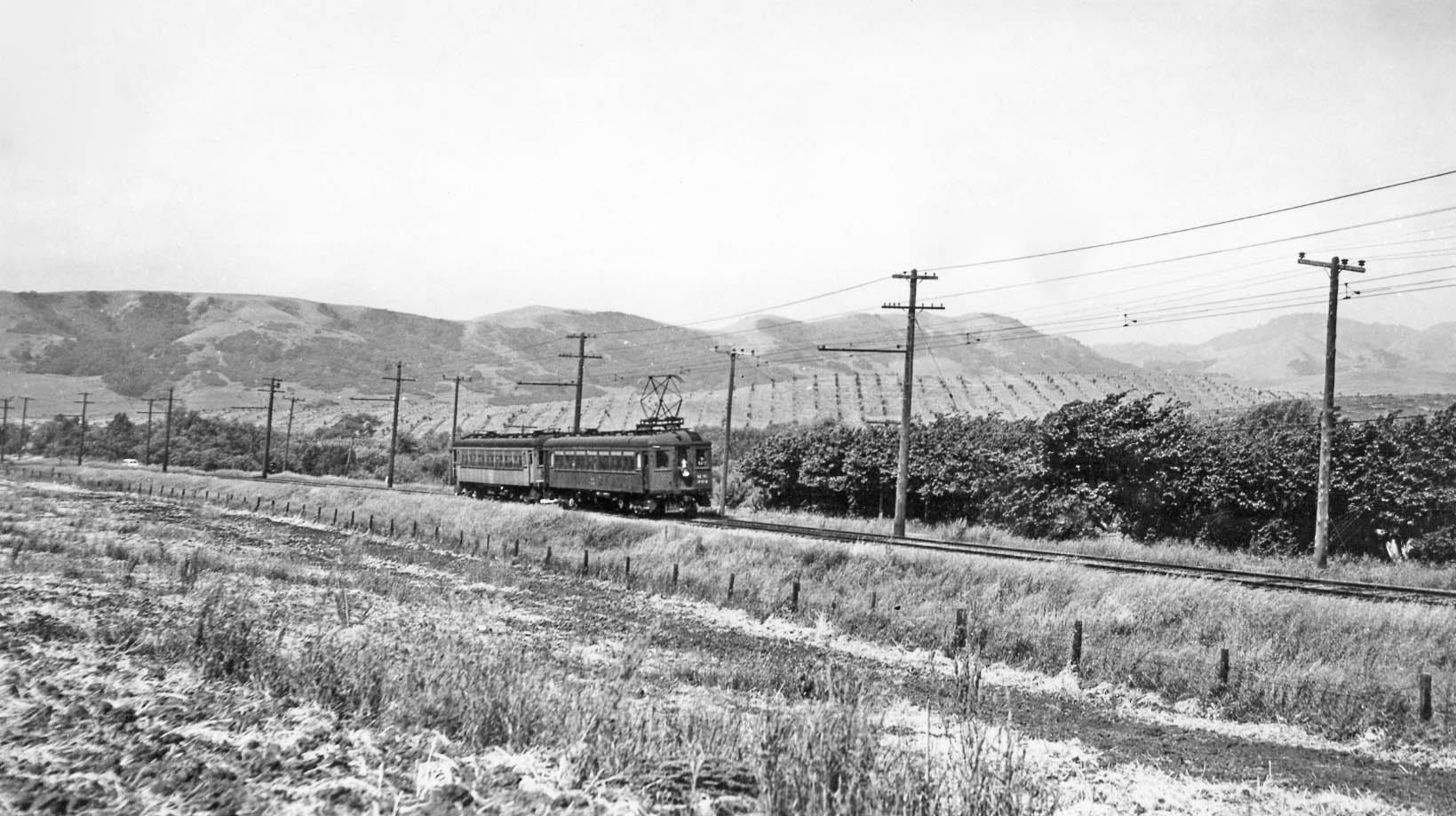A four car train, full throttle, begins the curve that will ultimately reach St. Mary’s College. The pattern of vegetation on the hills and the arrangement of the catenary and utility poles is distinctive for this part of Moraga versus points to the southwest. West view from Jun. 8, 1939.