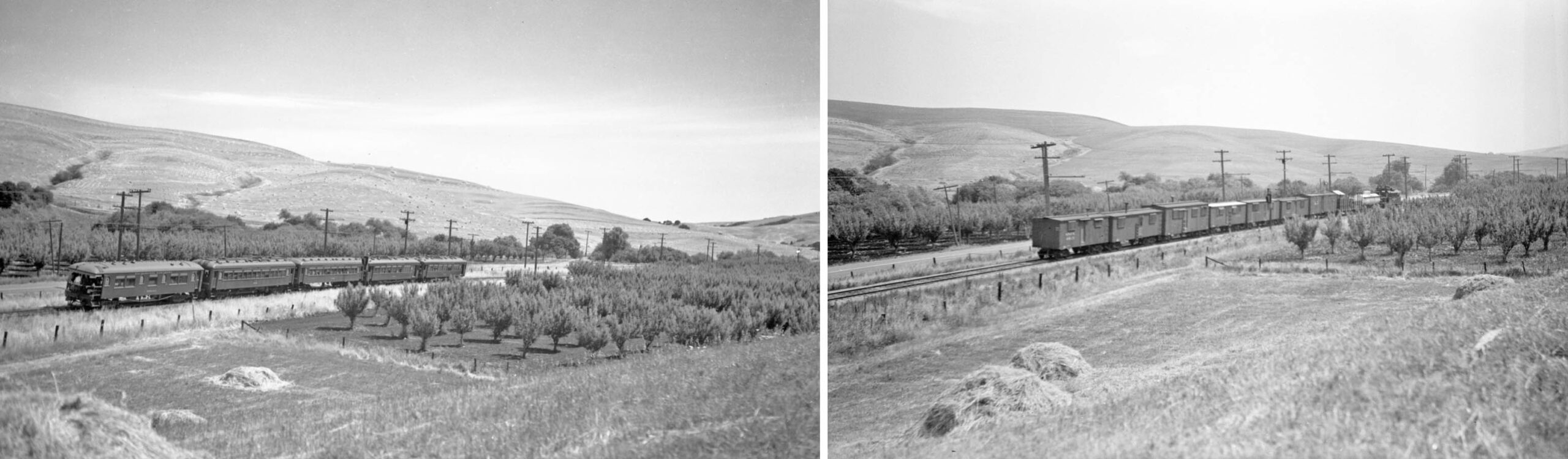 Catching SN 654 at a halt, this southwest view circa 1950 provides a balance between hills, orchards and road to clinch the location.