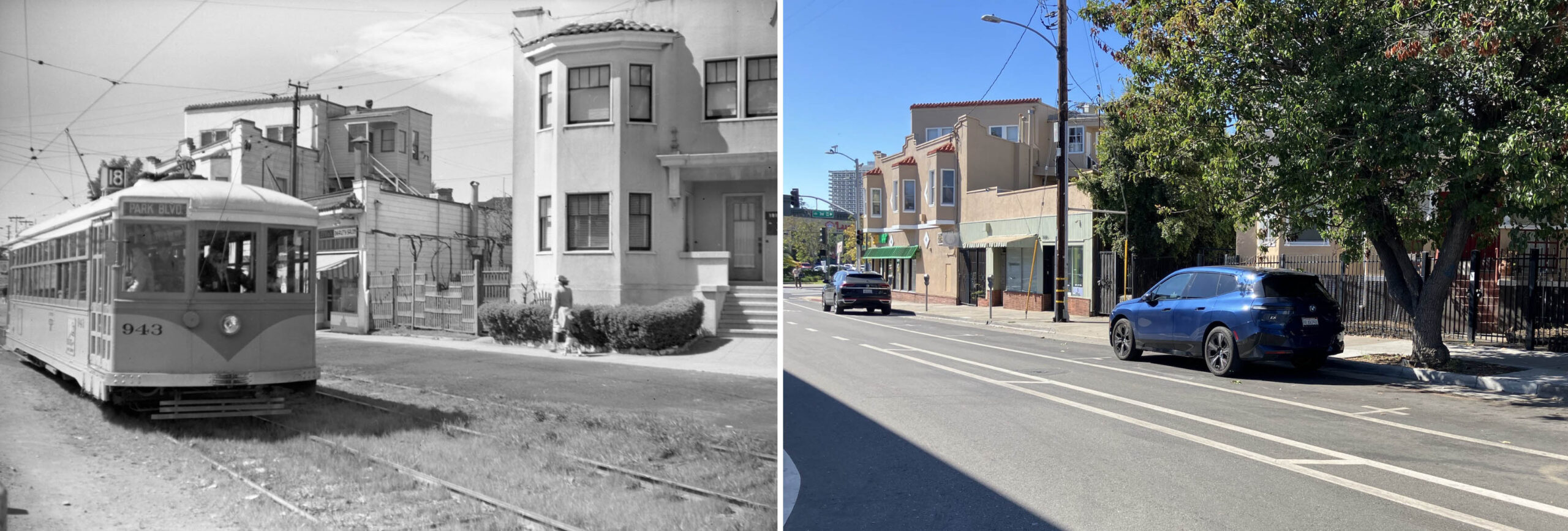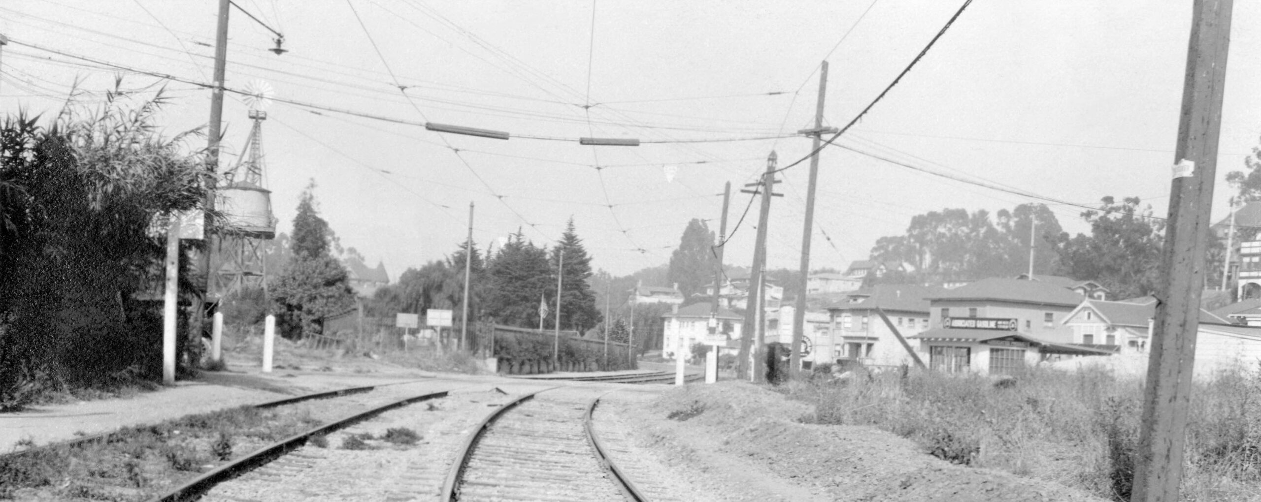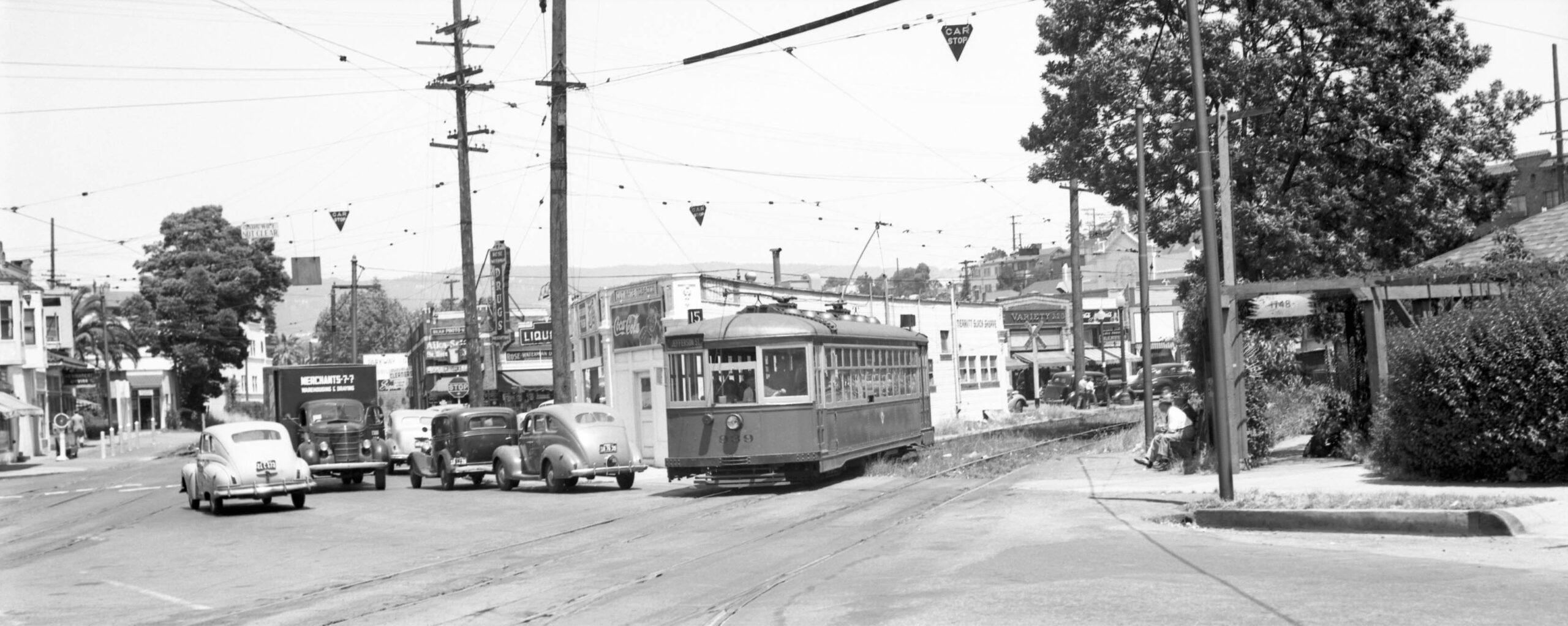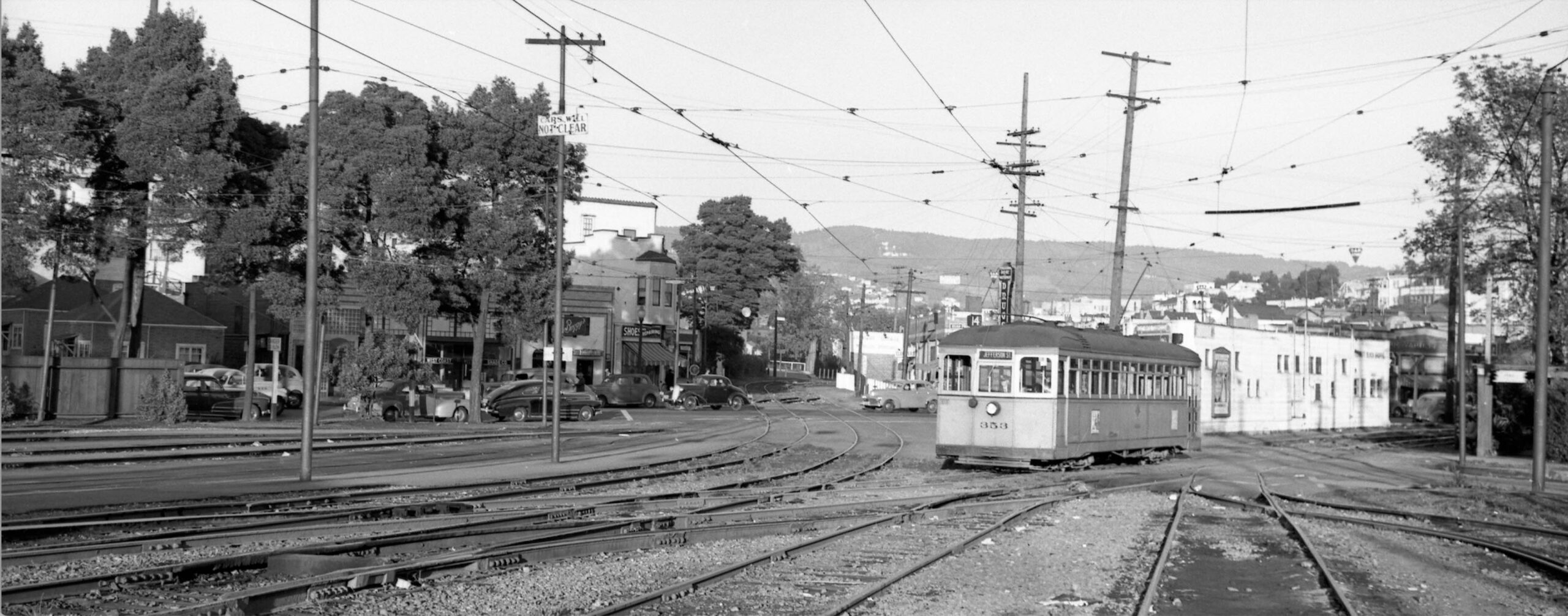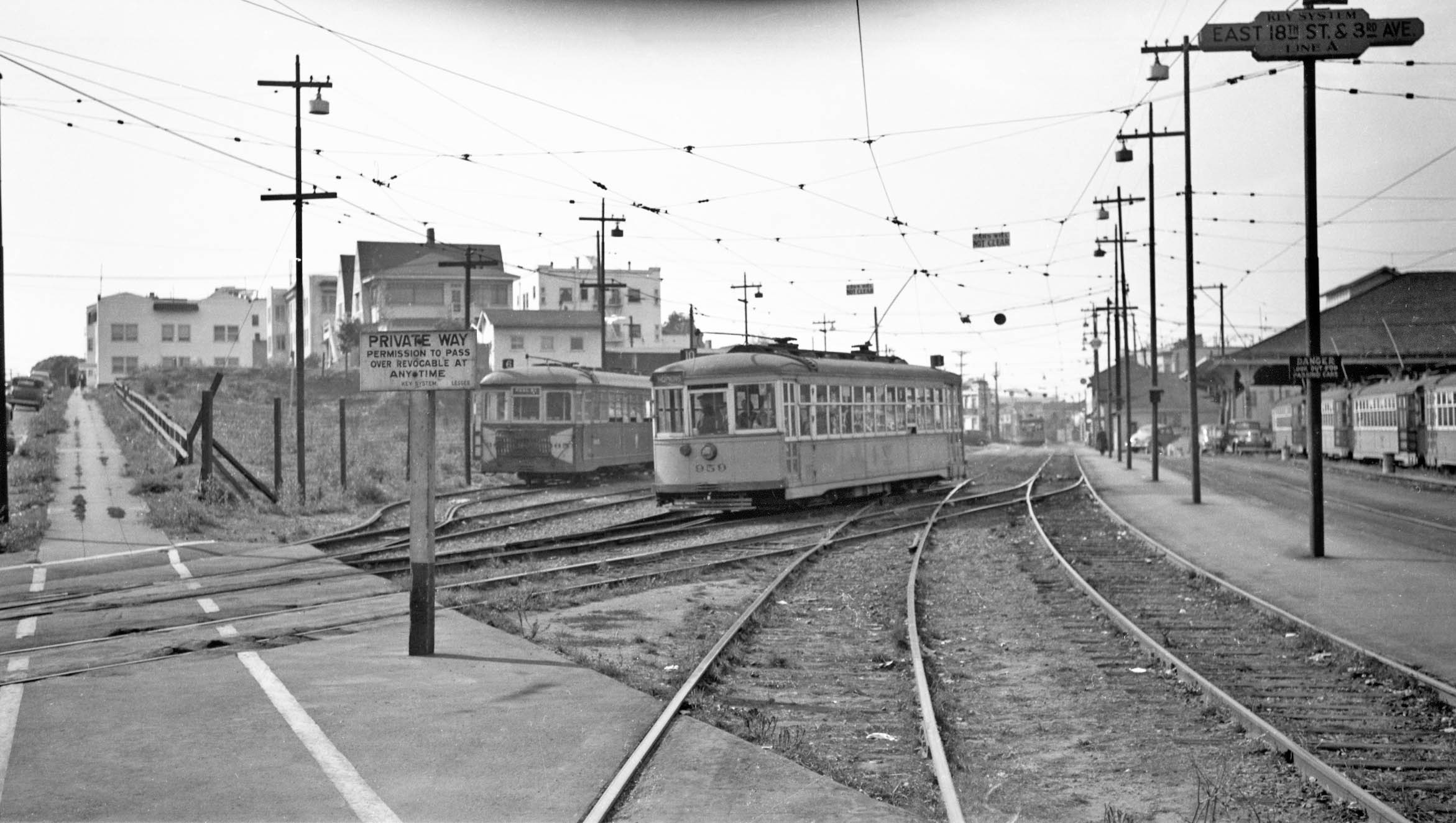 This southwest view from 1939 shows the the tracks to the 3rd. Ave. Cut on the right, and the E. 18th Ave. Cut on the left with KS 959, Line 10. The Line 6 streetcar’s presence cannot be explained since it did not use this car house at that time. This view down 3rd. Ave. has been obscured since the early 1950s by the presence of the Lucky Supermarket. The house just above the private way sign, no. 238 Foothill Blvd., is the only structure from the 18th century in this locale surviving to 2025, although it has been modified. Its construction was completed on Feb. 10, 1899 by A.T. Spence, builder, and the Cunningham Bros., architects.