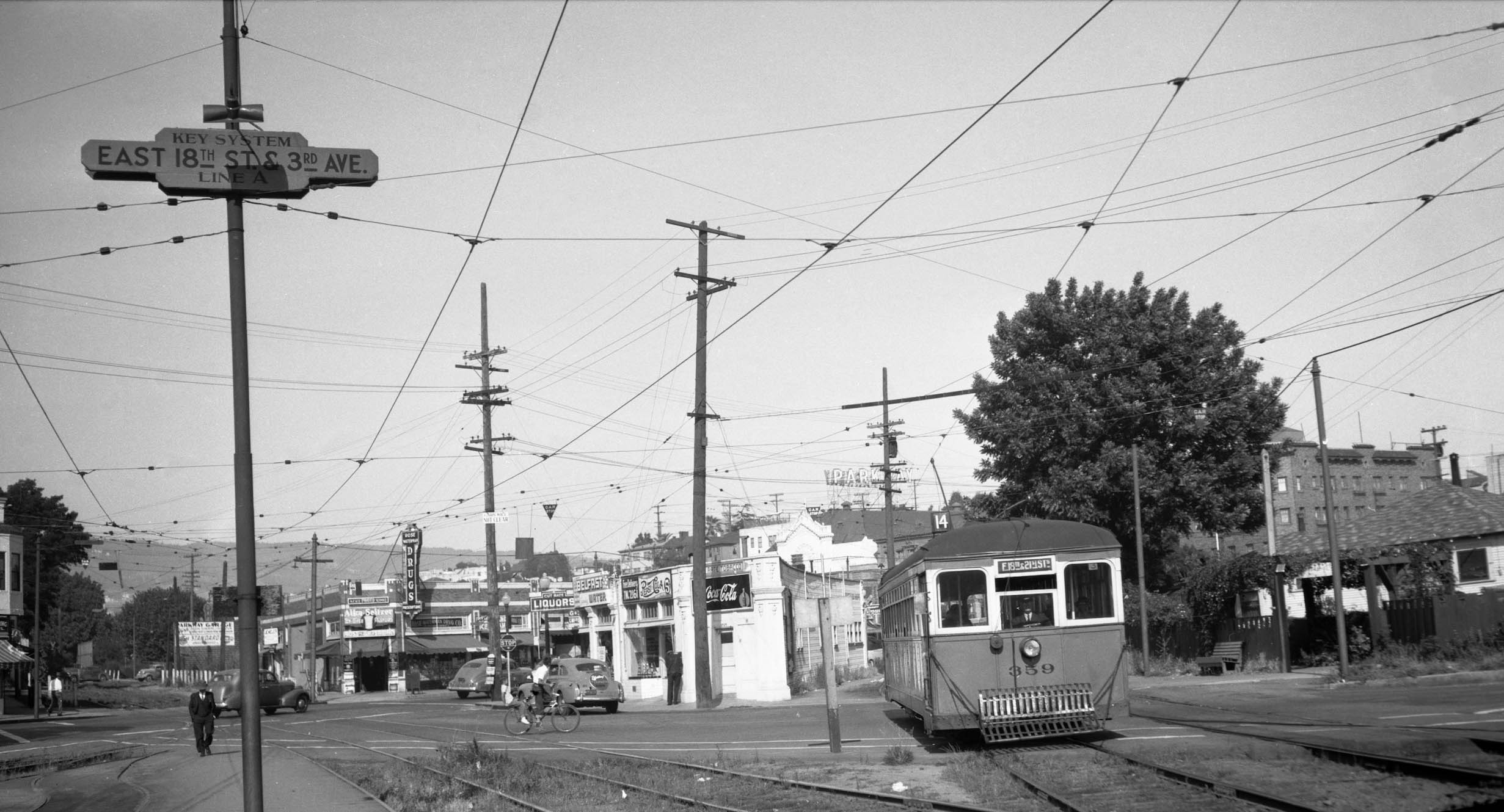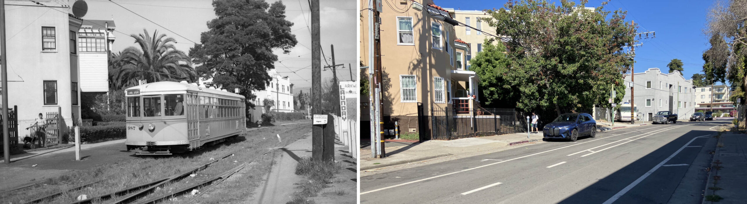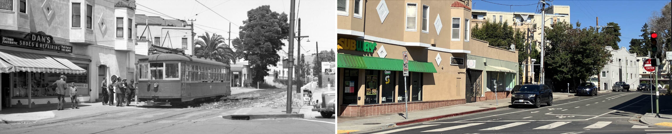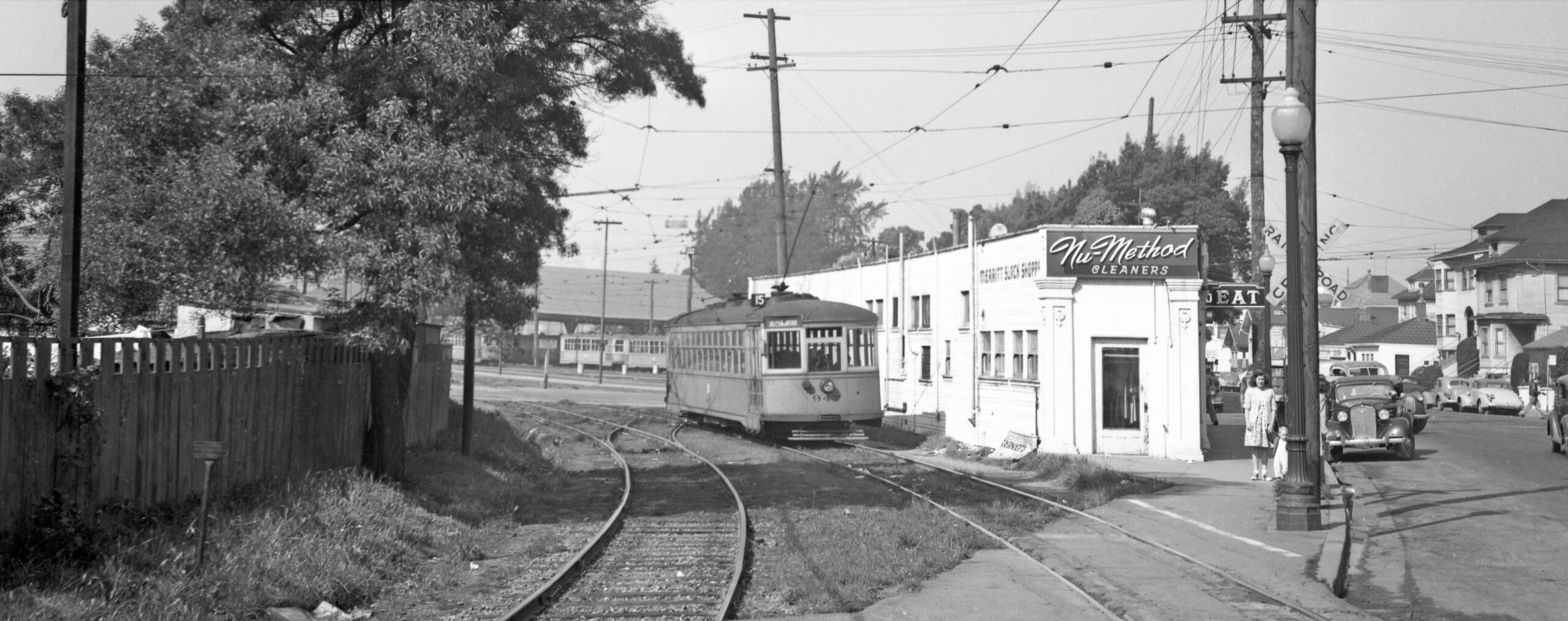 This southwest view from 1939 shows the the tracks to the 3rd. Ave. Cut on the right, and the E. 18th Ave. Cut on the left with KS 959, Line 10. The Line 6 streetcar’s presence cannot be explained since it did not use this car house at that time. This view down 3rd. Ave. has been obscured since the early 1950s by the presence of the Lucky Supermarket. The house just above the private way sign, no. 238 Foothill Blvd., is the only structure from the 18th century in this locale surviving to 2025, although it has been modified. Its construction was completed on Feb. 10, 1899 by A.T. Spence, builder, and the Cunningham Bros., architects.