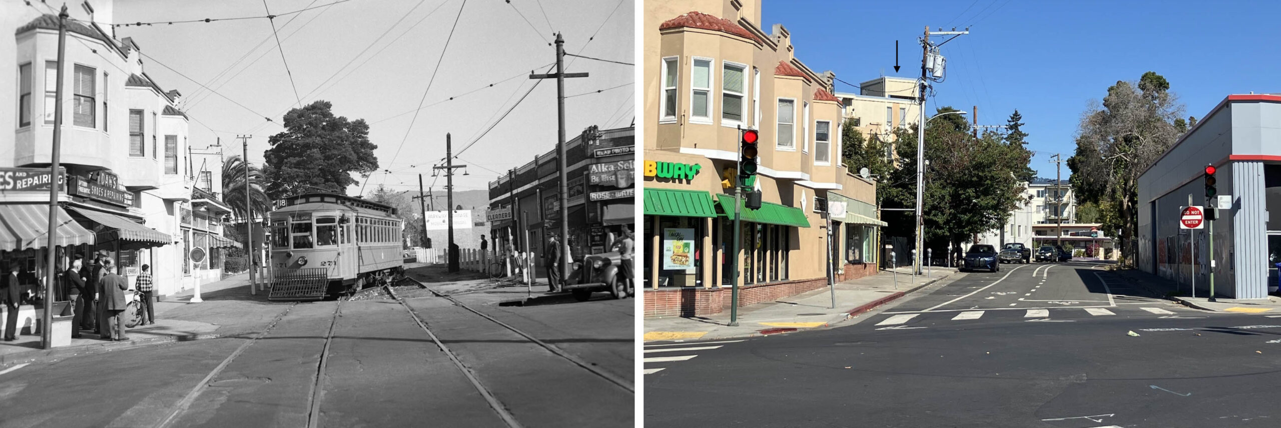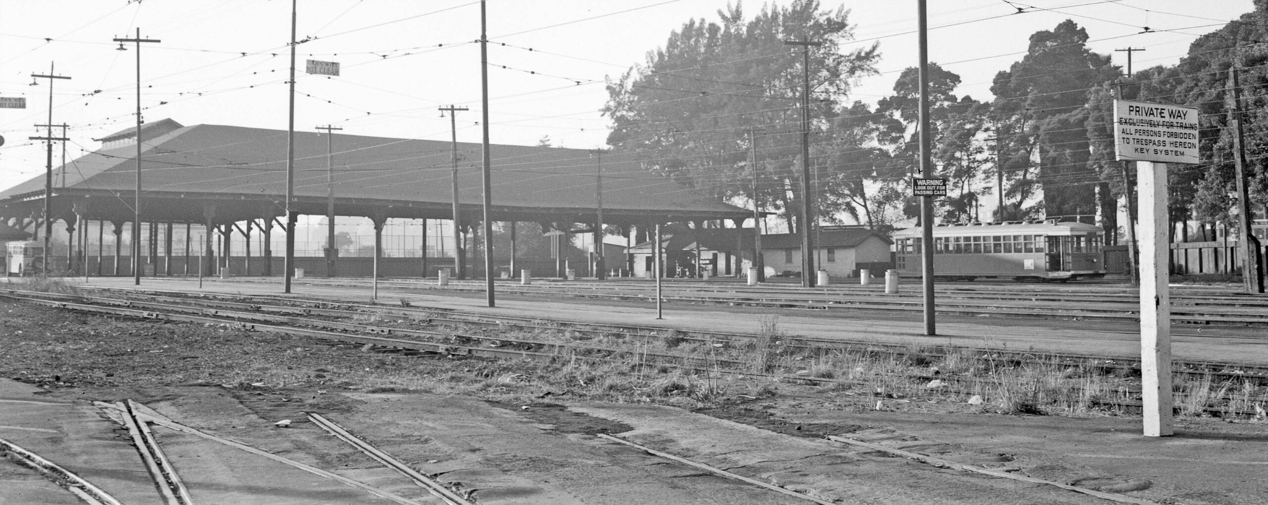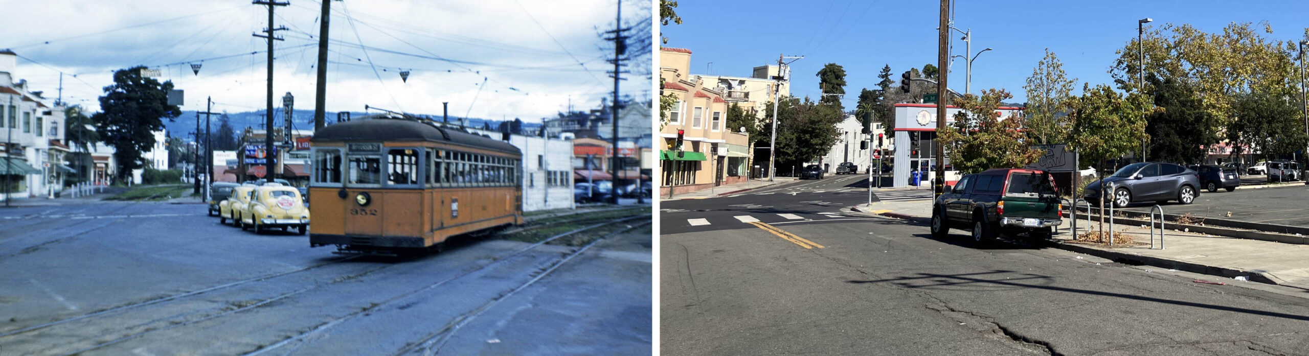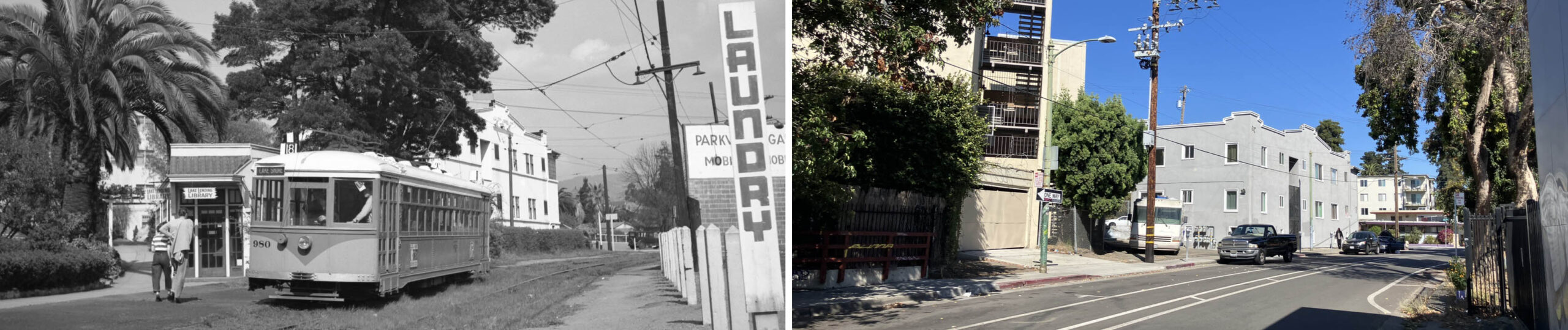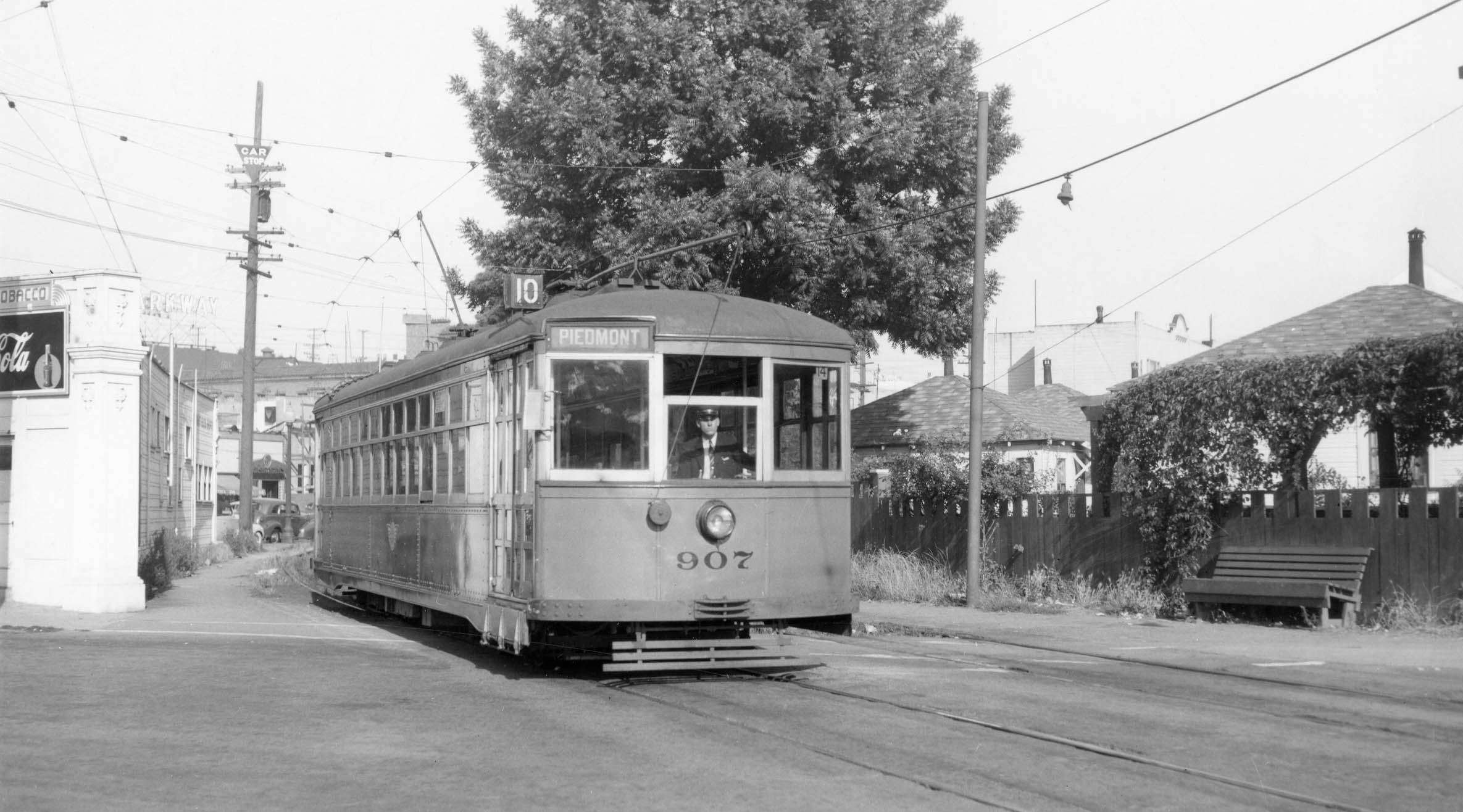 This southwest view from 1939 shows the the tracks to the 3rd. Ave. Cut on the right, and the E. 18th Ave. Cut on the left with KS 959, Line 10. The Line 6 streetcar’s presence cannot be explained since it did not use this car house at that time. This view down 3rd. Ave. has been obscured since the early 1950s by the presence of the Lucky Supermarket. The house just above the private way sign, no. 238 Foothill Blvd., is the only structure from the 18th century in this locale surviving to 2025, although it has been modified. Its construction was completed on Feb. 10, 1899 by A.T. Spence, builder, and the Cunningham Bros., architects.