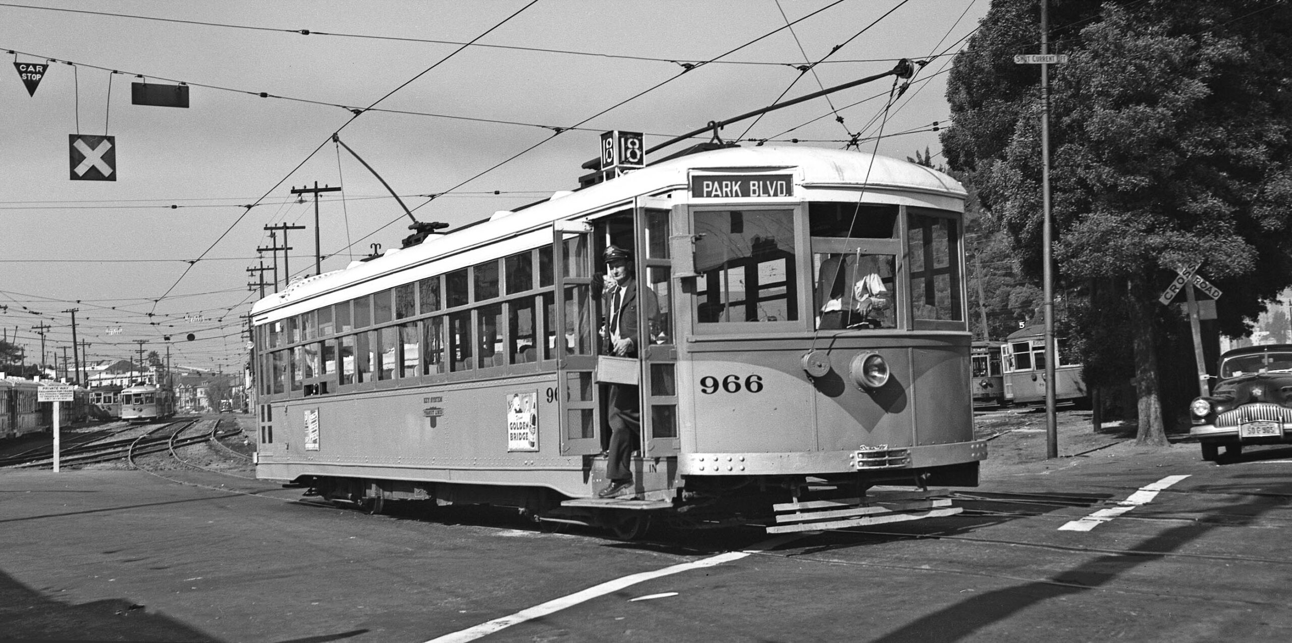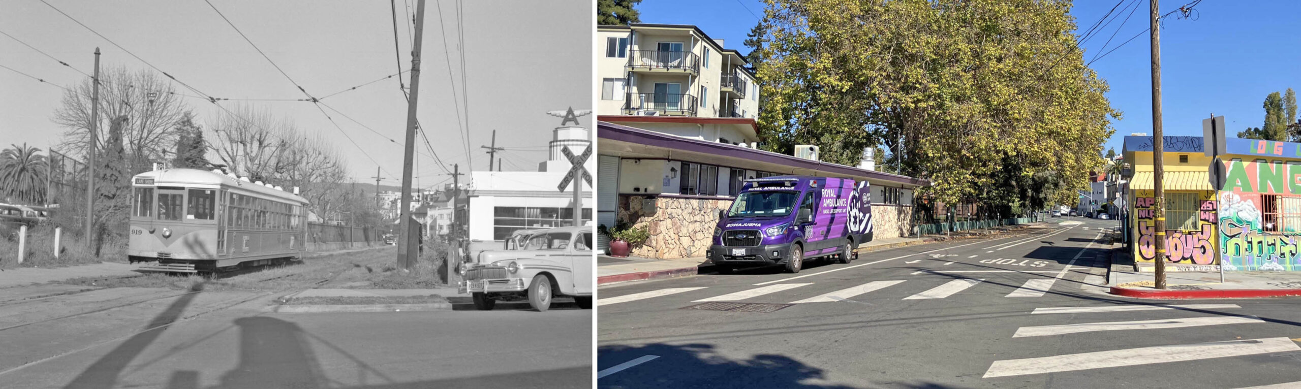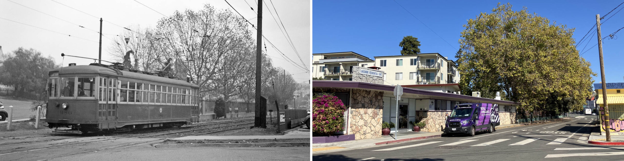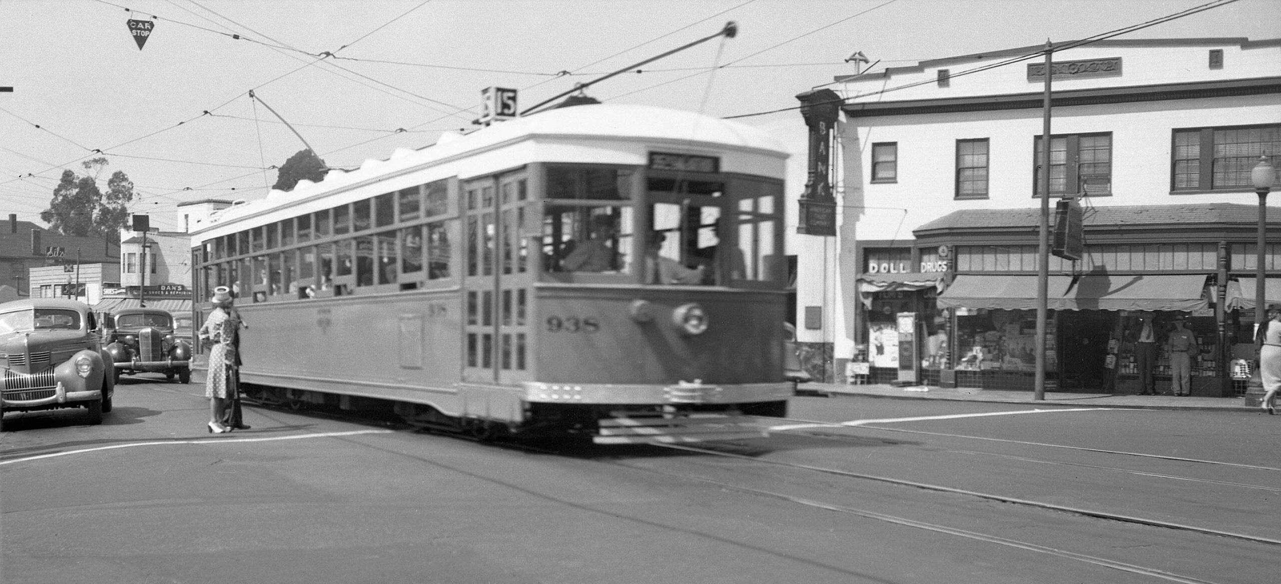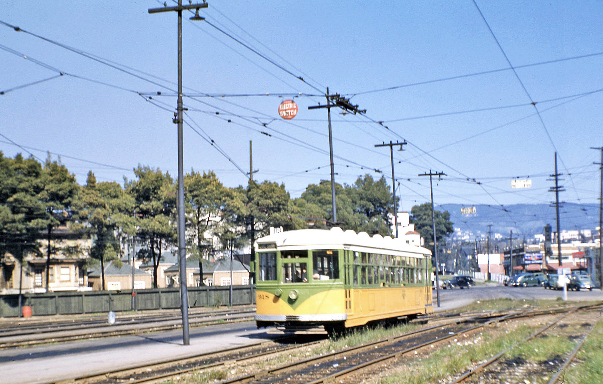 This southwest view from 1939 shows the the tracks to the 3rd. Ave. Cut on the right, and the E. 18th Ave. Cut on the left with KS 959, Line 10. The Line 6 streetcar’s presence cannot be explained since it did not use this car house at that time. This view down 3rd. Ave. has been obscured since the early 1950s by the presence of the Lucky Supermarket. The house just above the private way sign, no. 238 Foothill Blvd., is the only structure from the 18th century in this locale surviving to 2025, although it has been modified. Its construction was completed on Feb. 10, 1899 by A.T. Spence, builder, and the Cunningham Bros., architects.