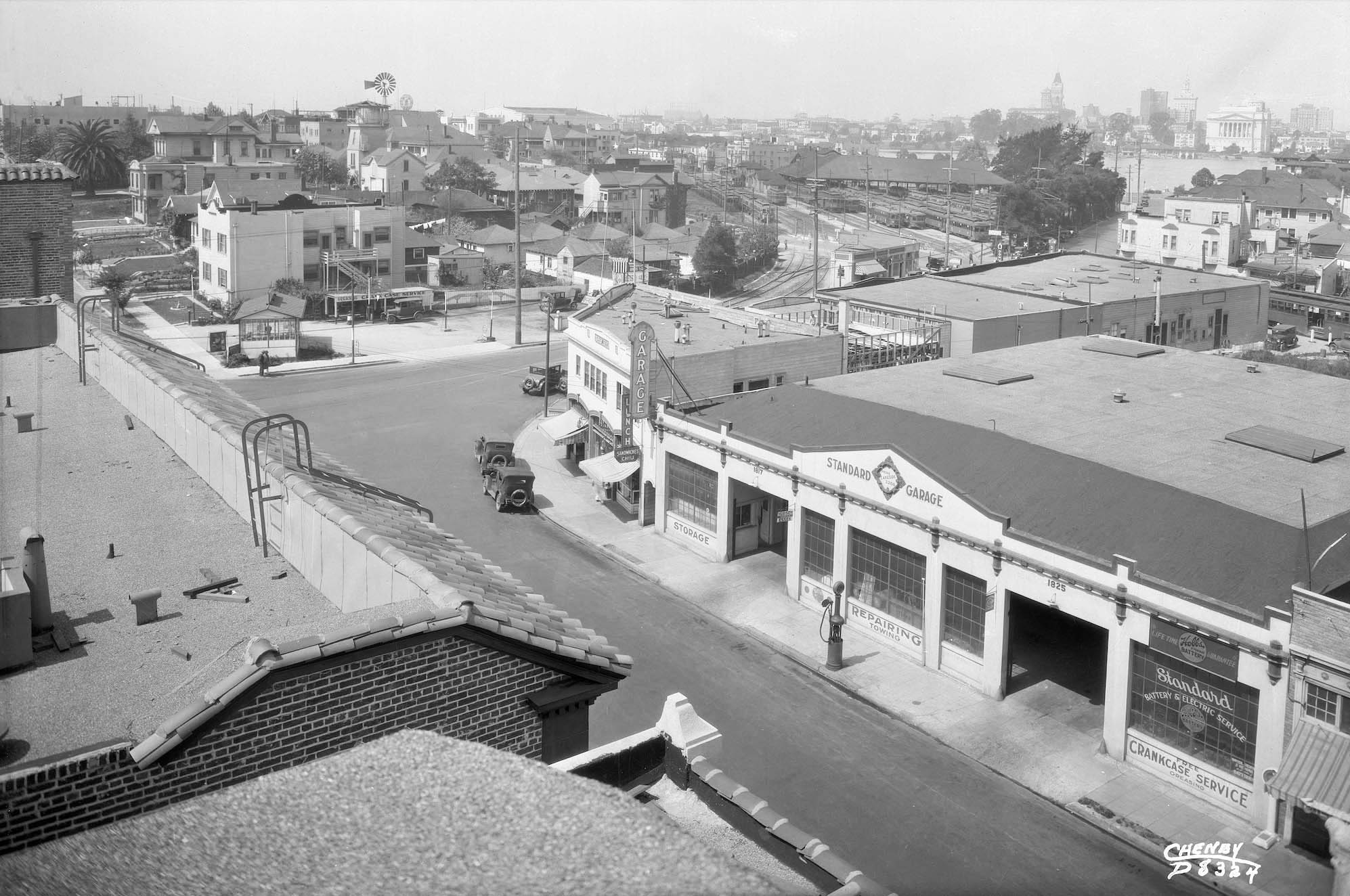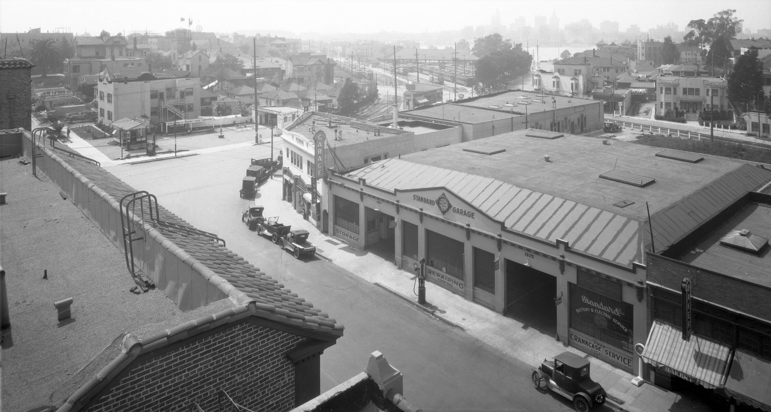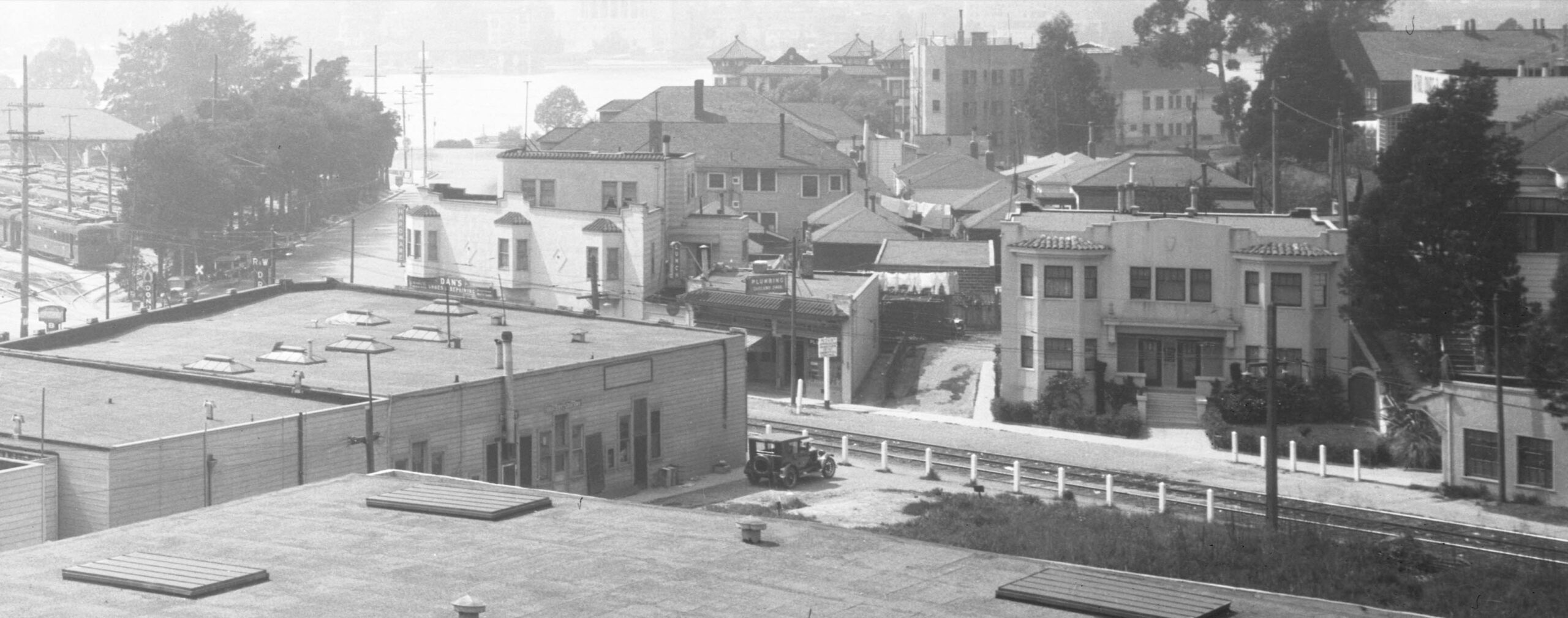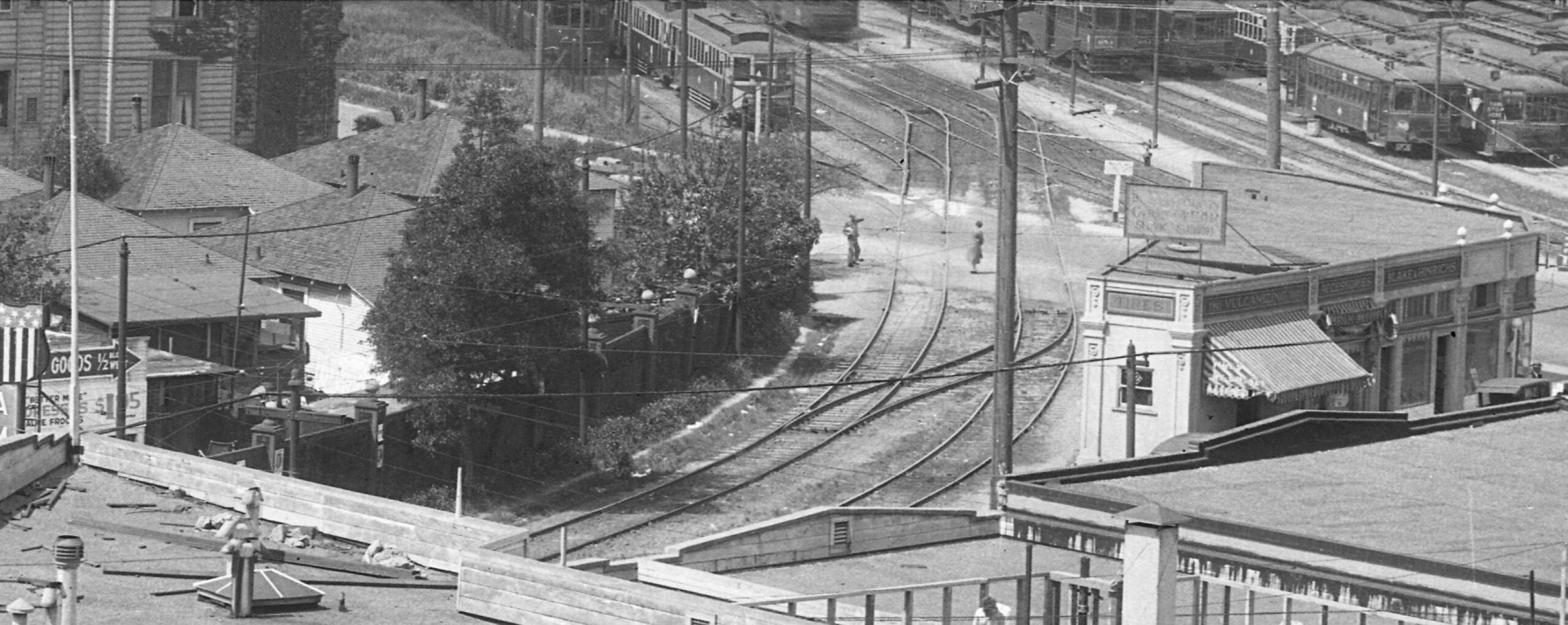 Ahead to ca. 1926-1927, here displayed is a west view with the car house and Oakland City skyline taken from the roof of the Parkway Theater, the theater reviewed in the last update. A detail follows …